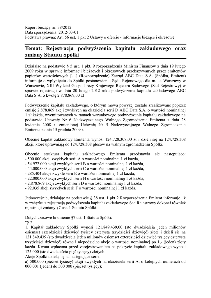 Raport bieżący nr: 38/2012 Data sporządzenia: 2012-03-01 Podstawa prawna: Art. 56 ust. 1 pkt 2 Ustawy o ofercie - informacje bieżące i okresowe Temat: Rejestracja podwyższenia kapitału zakładowego oraz zmiany Statutu Spółki Działając na podstawie § 5 ust. 1 pkt. 9 rozporządzenia Ministra Finansów z dnia 19 lutego 2009 roku w sprawie informacji bieżących i okresowych przekazywanych przez emitentów papierów wartościowych […] (Rozporządzenie) Zarząd ABC Data S.A. (Spółka, Emitent) informuje o wpłynięciu do Spółki postanowienia Sądu Rejonowego dla m. st. Warszawy w Warszawie, XIII Wydział Gospodarczy Krajowego Rejestru Sądowego (Sąd Rejestrowy) w sprawie rejestracji w dniu 20 lutego 2012 roku podwyższenia kapitału zakładowego ABC Data S.A. o kwotę 2.878.869,00 zł Podwyższenie kapitału zakładowego, o którym mowa powyżej zostało zrealizowane poprzez emisję 2.878.869 akcji zwykłych na okaziciela serii D ABC Data S.A. o wartości nominalnej 1 zł każda, wyemitowanych w ramach warunkowego podwyższenia kapitału zakładowego na podstawie Uchwały Nr 6 Nadzwyczajnego Walnego Zgromadzenia Emitenta z dnia 28 kwietnia 2008 r. zmienionej Uchwałą Nr 5 Nadzwyczajnego Walnego Zgromadzenia Emitenta z dnia 15 grudnia 2009 r. Obecnie kapitał zakładowy Emitenta wynosi 124.728.308,00 zł i dzieli się na 124.728.308 akcji, które uprawniają do 124.728.308 głosów na walnym zgromadzeniu Spółki. Obecnie struktura kapitału zakładowego Emitenta przedstawia - 500.000 akcji zwykłych serii A o wartości nominalnej 1 zł każda, - 54.972.000 akcji zwykłych serii B o wartości nominalnej 1 zł każda, - 44.000.000 akcji zwykłych serii C o wartości nominalnej 1 zł każda, - 285.404 akcje zwykłe serii E o wartości nominalnej 1 zł każda, - 22.000.000 akcji zwykłych serii H o wartości nominalnej 1 zł każda, - 2.878.869 akcji zwykłych serii D o wartości nominalnej 1 zł każda, - 92.035 akcji zwykłych serii F o wartości nominalnej 1 zł każda. się następująco: Jednocześnie, działając na podstawie § 38 ust. 1 pkt 2 Rozporządzenia Emitent informuje, iż w związku z rejestracją podwyższenia kapitału zakładowego Sąd Rejestrowy dokonał również rejestracji zmiany §7 ust. 1 Statutu Spółki. Dotychczasowe brzmienie §7 ust. 1 Statutu Spółki: "§ 7 1. Kapitał zakładowy Spółki wynosi 121.849.439,00 (sto dwadzieścia jeden milionów osiemset czterdzieści dziewięć tysięcy czterysta trzydzieści dziewięć) złote i dzieli się na 121.849.439 (sto dwadzieścia jeden milionów osiemset czterdzieści dziewięć tysięcy czterysta trzydzieści dziewięć) równe i niepodzielne akcje o wartości nominalnej po 1,- (jeden) złoty każda. Kwota wpłacona przed zarejestrowaniem na pokrycie kapitału zakładowego wynosi 125.000 (sto dwadzieścia pięć tysięcy) złotych. Akcje Spółki dzielą się na następujące serie: a) 500.000 (pięćset tysięcy) akcji zwykłych na okaziciela serii A, o kolejnych numerach od 000 001 (jeden) do 500 000 (pięćset tysięcy); b) 54.972.000 (pięćdziesiąt cztery miliony dziewięćset siedemdziesiąt dwa tysiące) akcji zwykłych na okaziciela serii B, o kolejnych numerach od B 00 000 001 do B 54 972 000; c) 44.000.000 (czterdzieści cztery miliony) akcji zwykłych na okaziciela serii C, o kolejnych numerach od C 00 000 001 do C 44 000 000; d) 22.000.000 (dwadzieścia dwa miliony) akcji zwykłych na okaziciela serii H, o kolejnych numerach od H 00 000 001 do H 22 000 000; e) 285.404 (dwieście osiemdziesiąt pięć tysięcy czterysta cztery) akcji zwykłych na okaziciela serii E, o kolejnych numerach od E 000 001 do E 285 404; f) 92.035 (dziewięćdziesiąt dwa tysiące trzydzieści pięć) akcji zwykłych na okaziciela serii F, o kolejnych numerach od F 000 001 do F 092 035." Obecne brzmienie §7 ust. 1 Statutu Spółki: "§ 7 1. Kapitał zakładowy Spółki wynosi 121.849.439,00 (sto dwadzieścia jeden milionów osiemset czterdzieści dziewięć tysięcy czterysta trzydzieści dziewięć) złote i dzieli się na 124.728.308 (sto dwadzieścia cztery miliony siedemset dwadzieścia osiem tysięcy trzysta osiem) równe i niepodzielne akcje o wartości nominalnej po 1,- (jeden) złoty każda. Kwota wpłacona przed zarejestrowaniem na pokrycie kapitału zakładowego wynosi 125.000 (sto dwadzieścia pięć tysięcy) złotych. Akcje Spółki dzielą się na następujące serie: a) 500.000 (pięćset tysięcy) akcji zwykłych na okaziciela serii A, o kolejnych numerach od 000 001 (jeden) do 500 000 (pięćset tysięcy); b) 54.972.000 (pięćdziesiąt cztery miliony dziewięćset siedemdziesiąt dwa tysiące) akcji zwykłych na okaziciela serii B, o kolejnych numerach od B 00 000 001 do B 54 972 000; c) 44.000.000 (czterdzieści cztery miliony) akcji zwykłych na okaziciela serii C, o kolejnych numerach od C 00 000 001 do C 44 000 000; d) 2.878.869,00 (dwa miliony osiemset siedemdziesiąt osiem tysięcy osiemset sześćdziesiąt dziewięć) akcji zwykłych na okaziciela serii D, o kolejnych numerach od D 0 000 001 do D 2 878 869; e) 285.404 (dwieście osiemdziesiąt pięć tysięcy czterysta cztery) akcji zwykłych na okaziciela serii E, o kolejnych numerach od E 000 001 do E 285 404; f) 92.035 (dziewięćdziesiąt dwa tysiące trzydzieści pięć) akcji zwykłych na okaziciela serii F, o kolejnych numerach od F 000 001 do F 092 035; g) 22.000.000 (dwadzieścia dwa miliony) akcji zwykłych na okaziciela serii H, o kolejnych numerach od H 00 000 001 do H 22 000 000.” Podpisy osób reprezentujących Spółkę: Data 2012-03-01 2012-03-01 Imię i nazwisko Tomasz Zatorski Dobrosław Wereszko Stanowisko Członek Zarządu Członek Zarządu