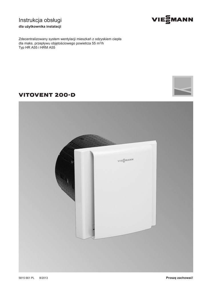 Instrukcja obsługi VIESMANN dla użytkownika instalacji Zdecentralizowany system wentylacji mieszkań z odzyskiem ciepła dla maks. przepływu objętościowego powietrza 55 m3/h Typ HR A55 i HRM A55 VITOVENT 200-D 5815 661 PL 8/2013 Proszę zachować! Wskazówki bezpieczeństwa Dla własnego bezpieczeństwa Prosimy o dokładne przestrzeganie wskazówek bezpieczeństwa w celu wykluczenia ryzyka utraty zdrowia oraz powstania szkód materialnych. Warunki dot. miejsca ustawienia ! Objaśnienia do wskazówek bezpieczeństwa Niebezpieczeństwo Ten znak ostrzega przed niebezpieczeństwem zranienia. ! Uwaga Ten znak ostrzega przed stratami materialnymi i zanieczyszczeniem środowiska. Wskazówka Tekst oznaczony słowem Wskazówka zawiera dodatkowe informacje. Grupa docelowa Niniejsza instrukcja obsługi skierowana jest do osób obsługujących instalację. Niniejsze urządzenie mogą obsługiwać również dzieci w wieku od 8 lat oraz osoby o ograniczonych zdolnościach psychicznych, sensorycznych bądź umysłowych, a także o niedostatecznym doświadczeniu i wiedzy, pod warunkiem działania pod nadzorem lub poinstruowania o bezpiecznym użytkowaniu urządzenia i zrozumienia wynikających z tego zagrożeń. ! Uwaga Nieodpowiednie warunki otoczenia mogą spowodować uszkodzenie instalacji i zagrozić bezpieczeństwu eksploatacji. ■ Przestrzegać dopuszczalnych temperatur otoczenia zgodnie z danymi w niniejszej instrukcji obsługi. ■ Urządzenie do ustawienia w pomieszczeniu: – Unikać zanieczyszczeń powietrza poprzez chlorowcoalkany (zawarte np. w farbach, rozpuszczalnikach i środkach czyszczących) – Unikać stałej wysokiej wilgotności powietrza (np. wskutek częstego suszenia prania). Elementy dodatkowe, części zamienne i szybkozużywalne ! Uwaga Elementy, które nie zostały sprawdzone w połączeniu z instalacją, mogą spowodować jej uszkodzenie lub zakłócić prawidłowe funkcjonowanie. Montażu lub wymiany może dokonywać tylko firma instalatorska. Uwaga Zwracać uwagę na znajdujące się w pobliżu urządzenia dzieci. ■ Nie mogą one bawić się urządzeniem. ■ Dzieci nie mogą czyścić urządzenia ani wykonywać należących do użytkownika czynności konserwacyjnych bez nadzoru. Niebezpieczeństwo Niefachowo przeprowadzone prace przy instalacji mogą doprowadzić do wypadków zagrażających życiu. Prace przy podzespołach elektrycznych mogą wykonywać wyłącznie wykwalifikowani elektrycy. Zachowanie w razie pożaru 5815 661 PL Niebezpieczeństwo W przypadku wystąpienia otwartego ognia istnieje niebezpieczeństwo poparzenia. ■ Wyłączyć instalację. ■ Używać tylko atestowanych gaśnic klasy pożarowej ABC. 2 Spis treści Spis treści Informacje wstępne Zastosowanie zgodne z przeznaczeniem .............................................. Opis urządzenia ..................................................................................... ■ Vitovent 200-D, typ HR A55 ................................................................ ■ Vitovent 200-D, typ HRM A55 ............................................................. Pierwsze uruchomienie .......................................................................... ■ Dopuszczalne temperatury otoczenia ................................................ Pojęcia fachowe ..................................................................................... Urządzenie jest ustawione fabrycznie ................................................... Wskazówki dotyczące oszczędzania energii ......................................... Zalecenia dot. większego komfortu ....................................................... 5 5 5 6 6 7 7 7 7 8 2. Informacje dotyczące obsługi Moduł obsługowy ................................................................................... Radiowy przełącznik obsługowy (wyposażenie dodatkowe) ................. Sposób obsługi ...................................................................................... ■ Ustawianie trybu pracy ....................................................................... ■ Włączanie trybu nocnego ................................................................... ■ Wyłączanie trybu nocnego ................................................................. 9 9 10 10 10 11 3. Włączenie i wyłączenie Włączanie urządzenia wentylacyjnego .................................................. Wyłączanie urządzenia wentylacyjnego ................................................ ■ Wyłączanie wentylatorów, np. przy wymianie filtrów .......................... ■ Wyłączanie urządzenia wentylacyjnego ............................................. 12 12 12 12 4. Funkcje Tryby pracy ............................................................................................ ■ Wyłączenie ......................................................................................... ■ Eksploatacja automatyczna ................................................................ ■ Wentylacja podstawowa ..................................................................... ■ Wentylacja zredukowana .................................................................... ■ Wentylacja normalna .......................................................................... ■ Wentylacja intensywna ....................................................................... ■ Tryb nawiewu ...................................................................................... ■ Tryb wywiewu ..................................................................................... Tryb nocny ............................................................................................. ■ Włączanie trybu nocnego ................................................................... ■ Wyłączanie trybu nocnego ................................................................. 13 13 13 14 14 14 14 14 15 15 15 15 5. Co robić gdy? Za mała wymiana 