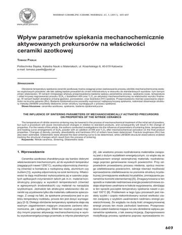 MATERIA£Y CERAMICZNE /CERAMIC MATERIALS/, 63, 3, (2011), 603-607 www.ptcer.pl/mccm Wpáyw parametrów spiekania mechanochemicznie aktywowanych prekursorów na wáaĞciwoĞci ceramiki azotkowej TOMASZ PAWLIK Politechnika ĝląska, Katedra Nauki o Materiaáach, ul. KrasiĔskiego 8, 40-019 Katowice e-mail: [email protected] Streszczenie ObniĪenie temperatury spiekania ceramiki azotkowej moĪna osiągnąü przez zastosowanie procesu obróbki mechanochemicznej zestawu wyjĞciowych proszków, ale taki zabieg bĊdzie prowadziá do zmian mikrostruktury w stosunku do standardowych wyrobów i tym samym zmian wáaĞciwoĞci. W ramach niniejszego artykuáu przeprowadzono badania wpáywu parametrów procesu spiekania (czas, temperatura i ukáad krzywej nagrzewania) proszku Si3N4 z dodatkiem AlN oraz Y2O3 po aktywacji mechanochemicznej na wáaĞciwoĞci wyrobu ¿nalnego. W ramach badaĔ okreĞlano zmianĊ gĊstoĞci, porowatoĞci, oraz twardoĞci (HV) spieków. Przeprowadzono równieĪ szacowanie odpornoĞci na kruche pĊkanie (KIc). Badania dylatometryczne pozwoliáy wyznaczyü najlepszą krzywą spiekania, natomiast obserwacje struktury metodą LM/SEM umoĪliwiáy Ğledzenie zmian struktury wynikających z procesu spiekania. Sáowa kluczowe: ceramika azotkowa, spiekanie, badania dylatometryczne THE INFLUENCE OF SINTERING PARAMETERS OF MECHANOCHEMICALLY ACTIVATED PRECURSORS ON PROPERTIES OF THE NITRIDE CERAMICS The temperature of nitride ceramics sintering may be lowered in the process of mechanochemical treatment of the initial set of powders, but such a procedure will cause microstructural changes in relation to standard products, and consequently will result in the change of properties. For the needs of this article, the authors conducted investigations into the inÀuence of parameters of sintering (time, temperature and heating curve arrangement) of Si3N4 powder with an addition of AlN and Y2O4 after mechanochemical activation on the ¿nal product properties. Changes of density, porosity, absorbability and hardness (HV) of sinters have been determined. Fracture toughness (KIc) has also been estimated. Dilatometric tests allowed the best sintering curve to be determined, while LM/SEM structural observations enabled tracking the structural changes which result from the process of sintering. Keywords: Nitride ceramics, Sintering, Dilatometric tests 1. Wprowadzenie Ceramika azotkowa charakteryzuje siĊ bardzo dobrymi wáaĞciwoĞciami mechanicznymi, aĪ do wysokich temperatur (siĊgających nawet 1250°C), wysoką odpornoĞcią chemiczną (równieĪ w kontakcie z roztopioną stalą, aluminium czy ĪuĪlem [1]), wysoką odpornoĞcią na szok termiczny. WáaĞciwoĞci te dają moĪliwoĞci wykorzystania jej w szeroko pojĊtych aplikacjach inĪynierskich takich jak m.in. materiaá konstrukcyjny pracujący w wysokich temperaturach (równieĪ w agresywnych Ğrodowiskach) czy materiaá na narzĊdzia szybkotnące. JednakĪe tak atrakcyjne wáaĞciwoĞci dla ceramiki są uzyskiwane tylko dla materiaáu caákowicie spieczonego. Z uwagi na fakt, Īe spiekanie prowadzone jest w pobliĪu temperatury rozkáadu, proces ten jest dosyü wymagający [2-3]. Dlatego obniĪenie temperatury spiekania staje siĊ waĪnym zagadnieniem mającym znaczenie zarówno ekonomiczne, jak i aplikacyjne. Efekt ten moĪna uzyskaü miĊdzy innymi poprzez aktywacjĊ mechanochemiczną w wyniku wysokoenergetycznego przemiaáu w máynie planetarnym [4]. Jak wiadomo proces rozdrabniania materiaáów związany jest z duĪym wydatkiem energetycznym, co wiąĪe siĊ ze zwiĊkszeniem energii wewnĊtrznej materiaáu rozdrabnianego poprzez generowanie nowych powierzchni. Przy odpowiednim prowadzeniu procesu mielenia, oprócz mocnego zdefektowania powierzchni, istnieje równieĪ moĪliwoĞü wprowadzenia zdefektowania na poziomie struktury krystalicznej (zmniejszenie wielkoĞci krystalitów, zmniejszenie parametrów komórki elementarnej) [5]. Zmagazynowana w ten sposób w materiale nadmiarowa energia powierzchniowa zostaje stopniowo uwalniana w trakcie wygrzewania, obniĪając w ten sposób początek temperatury spiekania nawet o ponad 100°C [6]. Problemem w tego typu procesach jest niestety szybki i czĊsto niekontrolowany wzrost wielkoĞci ziaren związany z szybkim uwalnianiem nadmiaru energii powierzchniowej. Ze wzglĊdu na duĪą iloĞü zmagazynowanej energii proces ten moĪe zachodziü lawinowo. Przeprowadzono zatem badania mające na celu okreĞlenie wpáywu parametrów spiekania, z tak zwaną inicjacją. Zaproponowano mody¿kacjĊ procesu spiekania poprzez wprowadzenie ini- 603 T. PAWLIK cjatora procesu. Inicjatorem tym jest gwaátowny wzrost temperatury powyĪej standardowej temperatury spiekania ok. 1700°C, a nastĊpnie szybkie scháodzenie do temperatury nieco poniĪej standardowego procesu 1500°C i wytrzymaniu w tej temperaturze w róĪnym czasie (60-240 minut). Po gwaátownym podgrzaniu i rozpoczĊciu procesu spiekania nastĊpuje jego spowolnienie (ale nie przerwanie), i tym samym ograniczenie ruchliwoĞci granic ziarnowych. Proces ten jest wskazany zwáaszcza dla materiaáów, od których oczekuje siĊ jednorodnej, drobnoziarnistej struktury po spieczeniu. Kolejnym waĪnym problemem w przypadku ceramiki przeznaczonej do spiekania reakcyjnego (np. reakcyjne spiekanie sialonu) jest stworzenie stabilnej, jednorodnej i homogenicznej zawiesiny, bĊdącej bazą do otrzymania materiaáu. Problem ten jest niezmiernie istotny dla materiaáów o strukturze nanometrycznej, gdyĪ jak wiadomo im drobniejsze ziarna, tym wiĊksza tendencja do tworzenia siĊ aglomeratów [7]. W ramach niniejszego artykuáu przygotowano homogeniczny prekursor sialonowy drogą aktywacji mechanochemicznej i zagĊszczano w róĪnych warunkach, starając siĊ okreĞliü wpáyw procesu spiekania na wáaĞciwoĞci wyrobu po spieczeniu. 2. Metodyka badaĔ W wyniku wczeĞniejszych, szeroko zakrojonych badaĔ do eksperymentu wytypowano mieszaninĊ komercyjnych proszków