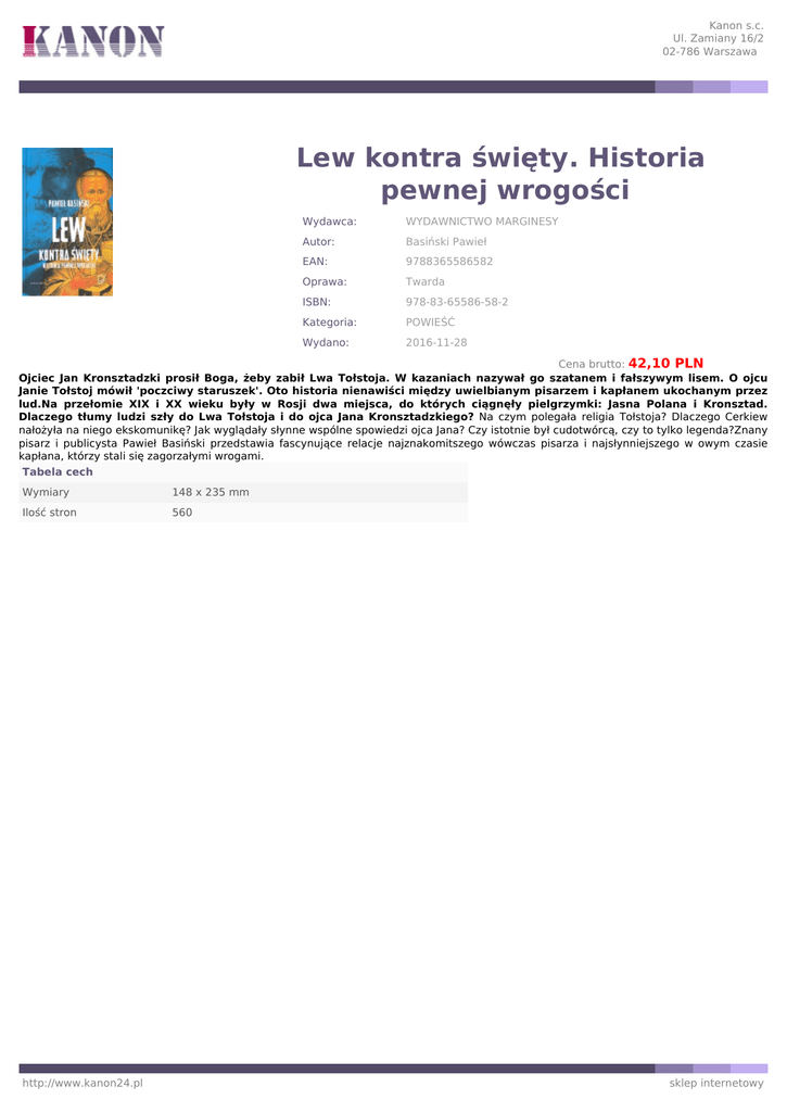 Kanon s.c. Ul. Zamiany 16/2 02-786 Warszawa Lew kontra święty. Historia pewnej wrogości Wydawca: WYDAWNICTWO MARGINESY Autor: Basiński Pawieł EAN: 9788365586582 Oprawa: Twarda ISBN: 978-83-65586-58-2 Kategoria: POWIEŚĆ Wydano: 2016-11-28 Cena brutto: 42,10 PLN Ojciec Jan Kronsztadzki prosił Boga, żeby zabił Lwa Tołstoja. W kazaniach nazywał go szatanem i fałszywym lisem. O ojcu Janie Tołstoj mówił 'poczciwy staruszek'. Oto historia nienawiści między uwielbianym pisarzem i kapłanem ukochanym przez lud.Na przełomie XIX i XX wieku były w Rosji dwa miejsca, do których ciągnęły pielgrzymki: Jasna Polana i Kronsztad. Dlaczego tłumy ludzi szły do Lwa Tołstoja i do ojca Jana Kronsztadzkiego? Na czym polegała religia Tołstoja? Dlaczego Cerkiew nałożyła na niego ekskomunikę? Jak wyglądały słynne wspólne spowiedzi ojca Jana? Czy istotnie był cudotwórcą, czy to tylko legenda?Znany pisarz i publicysta Pawieł Basiński przedstawia fascynujące relacje najznakomitszego wówczas pisarza i najsłynniejszego w owym czasie kapłana, którzy stali się zagorzałymi wrogami. Tabela cech Wymiary 148 x 235 mm Ilość stron 560 http://www.kanon24.pl sklep internetowy