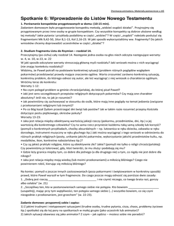 [Formacja animatora. Materiały pomocnicze s.10] Spotkanie 6: Wprowadzenie do Listów Nowego Testamentu 1. Porównanie konspektów przygotowanych w domu: (10-15 min). Zadaniem domowym było przygotowanie konspektu metodą „widzieć osądzić działać”. Przyjrzyjmy się przygotowanym przez inne osoby w grupie konspektom. Czy wszystkie konspekty są dobrze ułożone według tej metody? Jakie pytania i przykłady podaliśmy w części „widzieć”? W części „osądzić” należało posłużyć się fragmentami Mk 9,42-50, 1Kor 8,1-13, Kol 2,16-23. W jaki sposób wykorzystaliśmy ww. fragmenty? Do jakich wniosków chcemy doprowadzić uczestników w części „działać”? 2. Studium fragmentu Listu do Rzymian – rozdział 14. Przeczytajmy (po cichu) cały rozdział 14. Następnie jedna osoba na głos niech odczyta następujące wersety: w. 4, w. 10, w.13, w. 22 W jaki sposób odczytane wersety streszczają główną myśl rozdziału? Jaki wniosek można z nich wyciągnąć (nie znając kontekstu rozdziału)? Widzimy, że Paweł potrafi na podstawie konkretnej sytuacji (problem różnych poglądów względem pokarmów) przedstawiać prawdy mające znaczenie ogólne. Warto zrozumieć zarówno konkretną sytuację, konkretny problem, do którego odnosi się autor, ale też wyciągnąć z niej wniosek o charakterze ogólnym. Wróćmy teraz do konkretu: Wersety 1-12: • Na czym polegał problem w gminie chrześcijańskiej, do której pisał Paweł? • Jaki jest sens szczegółowych przepisów religijnych dotyczących pokarmów? Czy mają one charakter absolutny? Jeśli nie, to jak je rozumieć? • Jak powinniśmy się zachowywać w stosunku do osób, które mają inne poglądy na temat jedzenia (związane z przekonaniami religijnymi lub innymi)? • Po co Bóg kazał Żydom przestrzegać dni świąt lub postów? Jak w takim razie rozumieć przepisy Kościoła dotyczące postu piątkowego, okresów pokuty? Wersety 13-23: • Jaka jest relacja między obiektywną wartością jakiejś rzeczy (pokarmu, przedmiotów, dni, itp.) a jej wartością dla konkretnego człowieka? Czy ta sama rzecz przyniesie każdemu taką samą szkodę lub korzyść? (pomyśl o konkretnych przykładach, choćby absurdalnych – np. lutownica w ręku dziecka, zabawka w ręku dorosłego, instrument muzyczny w ręku głuchego itp.) Jaki można wyciągnąć z tego wniosek w odniesieniu do różnych praktyk religijnych (posty, unikanie jakichś pokarmów, wykorzystanie jakichś przedmiotów kultu, np. medalików, ikon, konkretne nabożeństwa itp.)? • Czy są jakieś praktyki religijne, które są obiektywnie złe? Jakie? (pomyśl nie tylko o religii chrześcijańskiej) Czy powinniśmy je tolerować, gdy, ktoś twierdzi, że mu służą i podobają się mu? • Gdzie leży granica między tym, co dobre dla jednego (a dla drugiego nie) a tym, co nigdy nie jest dobre dla nikogo? • Jaka jest relacja między moją wiedzą (lub moimi przekonaniami) a miłością bliźniego? Czego nie powinienem robić, kierując się miłością bliźniego? Na koniec: pomyśl o jeszcze innych zastosowaniach (poza pokarmami i świętowaniem w konkretny sposób) prawd, które Paweł wyraził w tym fragmencie. Do czego jeszcze mogą odnosić się poniższe dwie zasady: 1. „Dobrą jest rzeczą ______________________________ i nie czynić niczego, co twego brata razi, gorszy albo osłabia” (w. 21) 2. „Szczęśliwy ten, kto w postanowieniach samego siebie nie potępia. Kto bowiem ___________________ (uzupełnij), mając przy tym wątpliwości, ten potępia samego siebie (…) wszystko bowiem, co się czyni niezgodnie z przekonaniem, jest grzechem” (w. 22-23). Zadanie domowe: przypomnij sobie i zapisz: 1) Z jakimi trudnymi i nietypowymi sytuacjami (trudne osoby, trudne pytania, cisza, chaos, problemy życiowe itp.) spotkałeś się do tej pory na spotkaniach w małej grupie (jako uczestnik lub animator)? 2) Jakich sytuacji obawiasz się jako animator? Z czym – jak sądzisz – możesz sobie nie poradzić?