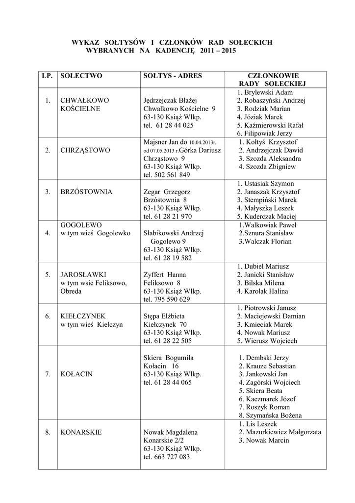 WYKAZ SOŁTYSÓW I CZŁONKÓW RAD SOŁECKICH WYBRANYCH NA KADENCJĘ 2011 – 2015 LP. SOŁECTWO SOŁTYS - ADRES 1. CHWAŁKOWO KOŚCIELNE Jędrzejczak Błażej Chwałkowo Kościelne 9 63-130 Książ Wlkp. tel. 61 28 44 025 2. CHRZĄSTOWO 3. BRZÓSTOWNIA 4. GOGOLEWO w tym wieś Gogolewko 5. 6. JAROSŁAWKI w tym wsie Feliksowo, Obreda KIEŁCZYNEK w tym wieś Kiełczyn 7. KOŁACIN 8. KONARSKIE Majsner Jan do 10.04.2013r. od 07.05.2013 r.Górka Dariusz Chrząstowo 9 63-130 Książ Wlkp. tel. 502 561 849 Zegar Grzegorz Brzóstownia 8 63-130 Książ Wlkp. tel. 61 28 21 970 Słabikowski Andrzej Gogolewo 9 63-130 Książ Wlkp. tel. 61 28 19 582 Zyffert Hanna Feliksowo 8 63-130 Książ Wlkp. tel. 795 590 629 Stępa Elżbieta Kiełczynek 70 63-130 Książ Wlkp. tel. 61 28 22 505 Skiera Bogumiła Kołacin 16 63-130 Książ Wlkp. tel. 61 28 44 065 Nowak Magdalena Konarskie 2/2 63-130 Książ Wlkp. tel. 663 727 083 CZŁONKOWIE RADY SOŁECKIEJ 1. Brylewski Adam 2. Robaszyński Andrzej 3. Rodziak Marian 4. Józiak Marek 5. Kaźmierowski Rafał 6. Filipowiak Jerzy 1. Kołtyś Krzysztof 2. Andrzejczak Dawid 3. Szozda Aleksandra 4. Szozda Zbigniew 1. Ustasiak Szymon 2. Janaszak Krzysztof 3. Stempiński Marek 4. Małyszka Leszek 5. Kuderczak Maciej 1.Walkowiak Paweł 2.Sznura Stanisław 3.Walczak Florian 1. Dubiel Mariusz 2. Janicki Stanisław 3. Bilska Milena 4. Karolak Halina 1. Piotrowski Janusz 2. Maciejewski Damian 3. Kmieciak Marek 4. Nowak Mariusz 5. Wierusz Wojciech 1. Dembski Jerzy 2. Krauze Sebastian 3. Jankowski Jan 4. Zagórski Wojciech 5. Skiera Beata 6. Kaczmarek Józef 7. Roszyk Roman 8. Szymańska Bożena 1. Lis Leszek 2. Mazurkiewicz Małgorzata 3. Nowak Marcin 9. KONARZYCE w tym wieś Zawory Stachowiak Katarzyna Konarzyce ul. Szkolna 14 63-130 Książ Wlkp. tel. 61 28 22 117 10. ŁĘŻEK Halaburda Zofia Łężek 5/3 63-130 Książ Wlkp. tel. 785 981 270 11. ŁUGI Schwanke Marian Ługi 22 63-130 Książ Wlkp. tel. 61 28 22 505 12. MCHY Kaźmierczak Eugeniusz Mchy 50/5 63-130 Książ Wlkp. tel. 602 883 524 13. RADOSZKOWO w tym wieś Chrałub Siekierkowski Ryszard Radoszkowo 20 63-130 Książ Wlkp. tel. 61 28 19 493 14. RADOSZKOWO DRUGIE Krause Grzegorz Radoszkowo Drugie 13 63-130 Książ Wlkp. tel. 61 28 44 746 15. SEBASTIANOWO 16. SROCZEWO 17. ŚWIĄCZYŃ Wojciechowski Zbigniew Sebastianowo 20 63-130 Książ Wlkp. tel. 61 28 21 985 Krępulec Anna Sroczewo 8 63-130 Książ Wlkp. tel. 61 28 22 872 Ciszewski Adam Świączyń 13 63-130 Książ Wlkp. tel. 61 28 44 825 1. Stachowski Roman 2. Szymczak Grażyna 3. Dworczyński Grzegorz 4. Weinert Anna 5. Płoszaj Ewelina 6. Kramer Leszek 7. Maciejewski Paweł 8. Wojciechowski Robert 1. Kurmanek Halina 2. Marciszak Piotr 3. Tomczak Łucja 4. Miętkiewicz Karol 1. Lewandowicz Józef 2. Andrzejczak Leszek 3. Krauze Karol 4. Horała Mirosław 1. Rzepka Jacek 2. Genderka Krzysztof 3. Marszałek Piotr 4. Celka Marek 5. Jakubowski Paweł 6. Kapturek Wojciech 7. Stępa Paweł 8. Konarkowska Anna 1. Weber-Hałaburda Agnieszka 2. Pawlak Aneta 3. Nerling Jan 4. Suchecki Błażej 5. Drzewiecki Eugeniusz 6. Kania Grzegorz 1. Dembski Grzegorz 2. Gurling Paweł 3. Borowczyk Władysław 1. Adamczak Kazimierz 2. Binkowski Józef 3. Szulc Roman 4. Tomaszewski Adam 5. Baraniak Roman 6. Hypki Waldemar 7. Binkowski Edward 1. Adamski Błażej 2. Wojtkowski Janusz 3. Wilczyk Mirosław 1. Szypura Jan 2. Koperek Genowefa 3. Spochacz Barbara 18. WŁOŚCIEJEWKI 19. WŁOŚCIEJEWICE 20 ZABROWO 21. ZAKRZEWICE Zegar Iwona Włościejewki 24 63-130 Książ Wlkp. tel. 61 28 44 835 Przybylski Sławomir Włościejewice 15 63-130 Książ Wlkp. tel. 61 28 44 996 Szymańska Marianna Zaborowo 13 63-130 Książ Wlkp. tel. 605 134 938 Frąckowiak Zdzisław Zakrzewice 25 63-130 Książ Wlkp. tel. 600 779 954 1. Walkowiak Natalia 2. Koczorska Marzena 3. Muślewski Arkadiusz 4. Banaszak Dorota 1. Jankowiak Zbigniew 2. Majsnerowski Leon 3. Rodziak Eugeniusz 4. Smolarek Leszek 5. Niewrzędowski Stanisław 6. Gościniak Sławomir 1. Litka Edward 2. Nowaczyk Arleta 3. Nowak Łukasz 4. Sójka Krzysztof 5. Jankowska Małgorzata 6. Jędrzejczak Dorota 7. Wojtkowiak Justyna 8. Bukowiecki Marcin 1. Kołacki Florian 2. Adamczak Krystyna 3. Nowak Piotr