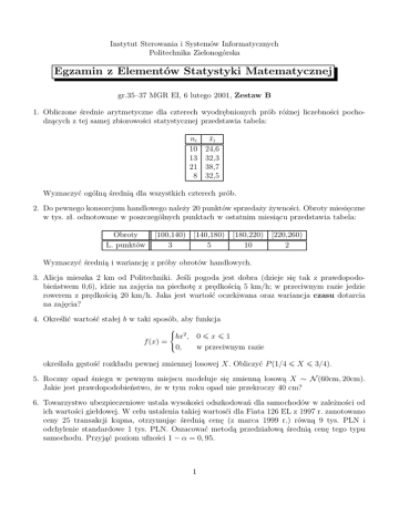 Instytut Sterowania i Systemów Informatycznych Politechnika Zielonogórska Egzamin z Elementów Statystyki Matematycznej gr.35–37 MGR EI, 6 lutego 2001, Zestaw B 1. Obliczone średnie arytmetyczne dla czterech wyodrębnionych prób różnej liczebności pochodzących z tej samej zbiorowości statystycznej przedstawia tabela: ni 10 13 21 8 x̄i 24,6 32,3 38,7 32,5 Wyznaczyć ogólną średnią dla wszystkich czterech prób. 2. Do pewnego konsorcjum handlowego należy 20 punktów sprzedaży żywności. Obroty miesięczne w tys. zł. odnotowane w poszczególnych punktach w ostatnim miesiącu przedstawia tabela: Obroty L. punktów [100,140) [140,180) [180,220) [220,260) 3 5 10 2 Wyznaczyć średnią i wariancję z próby obrotów handlowych. 3. Alicja mieszka 2 km od Politechniki. Jeśli pogoda jest dobra (dzieje się tak z prawdopodobieństwem 0,6), idzie na zajęcia na piechotę z prędkością 5 km/h; w przeciwnym razie jedzie rowerem z prędkością 20 km/h. Jaka jest wartość oczekiwana oraz wariancja czasu dotarcia na zajęcia? 4. Określić wartość stałej b w taki sposób, aby funkcja bx2 , f (x) = 0, 0¬x¬1 w przeciwnym razie określała gęstość rozkładu pewnej zmiennej losowej X. Obliczyć P (1/4 ¬ X ¬ 3/4). 5. Roczny opad śniegu w pewnym miejscu modeluje się zmienną losową X ∼ N (60cm, 20cm). Jakie jest prawdopodobieństwo, że w tym roku opad nie przekroczy 40 cm? 6. Towarzystwo ubezpieczeniowe ustala wysokości odszkodowań dla samochodów w zależności od ich wartości giełdowej. W celu ustalenia takiej wartosći dla Fiata 126 EL z 1997 r. zanotowano ceny 25 transakcji kupna, otrzymując średnią cenę (z marca 1999 r.) równą 9 tys. PLN i odchylenie standardowe 1 tys. PLN. Oszacować metodą przedziałową średnią cenę tego typu samochodu. Przyjąć poziom ufności 1 − α = 0, 95. 1 1 Rx −t2 /2 Tabela 1: Rozkład normalny: Wartości funkcji Laplace’a Φ(x) = √ e dt. 2π −∞ x Φ(x) x Φ(x) x Φ(x) x Φ(x) x Φ(x) x Φ(x) x Φ(x) 0.00 .500 0.50 .691 1.00 .841 1.50 .933 2.00 .977 2.50 .9938 3.00 .9986 0.05 .520 0.55 .709 1.05 .853 1.55 .939 2.05 .980 2.55 .9946 3.05 .9988 0.10 .540 0.60 .726 1.10 .864 1.60 .945 2.10 .982 2.60 .9954 3.10 .9990 0.15 .560 0.65 .742 1.15 .875 1.65 .951 2.15 .984 2.65 .9960 3.15 .9992 0.20 .579 0.70 .758 1.20 .885 1.70 .955 2.20 .986 2.70 .9966 3.20 .9993 0.25 .599 0.75 .773 1.25 .894 1.75 .960 2.25 .988 2.75 .9970 3.25 .9994 0.30 .618 0.80 .788 1.30 .903 1.80 .964 2.30 .989 2.80 .9974 3.30 .9995 0.35 .637 0.85 .802 1.35 .911 1.85 .968 2.35 .991 2.85 .9978 3.35 .9996 0.40 .655 0.90 .816 1.40 .919 1.90 .971 2.40 .992 2.90 .9982 3.40 .9996 0.45 .674 0.95 .829 1.45 .926 1.95 .974 2.45 .993 2.95 .9984 3.45 .9997 Tabela 2: Rozkład Studenta: W r-tym wierszu tablicy podano takie wartości tα , że Rtα −tα 1 − α, gdzie: fr (x) – gęstość rozkładu Studenta o r stopniach swobody. r α = 0.05 α = 0.01 r α = 0.05 α = 0.01 1 12.706 63.657 16 2.120 2.921 2 4.303 9.925 17 2.110 2.898 3 3.182 5.841 18 2.101 2.878 4 2.776 4.604 19 2.093 2.861 5 2.571 4.032 20 2.086 2.845 6 2.447 3.707 21 2.080 2.831 7 2.365 3.499 22 2.074 2.819 8 2.306 3.355 23 2.069 2.807 9 2.262 3.250 24 2.064 2.797 10 2.228 3.169 25 2.060 2.787 11 2.201 3.106 26 2.056 2.779 12 2.179 3.055 27 2.052 2.771 13 2.160 3.012 28 2.048 2.763 14 2.145 2.977 29 2.045 2.756 15 2.131 2.947 30 2.042 2.750 2 fr (x) dx =