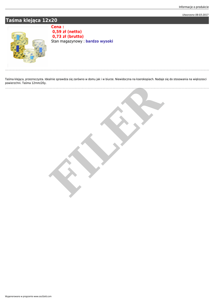Informacje o produkcie Utworzono 08-03-2017 Taśma klejąca 12x20 Cena : 0,59 zł (netto) 0,73 zł (brutto) Stan magazynowy : bardzo wysoki FI LE R Taśma klejąca, przezroczysta. Idealnie sprawdza się zarówno w domu jak i w biurze. Niewidoczna na kserokopiach. Nadaje się do stosowania na większosci powierzchni. Taśma 12mm/20y. Wygenerowano w programie www.oscGold.com