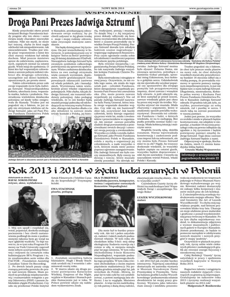 www.gazetagazeta.com NOWY ROK 2014 strona 26 WSPOMNIENIE Droga Pani Prezes Jadwiga Sztrumf Kiedy przychodzi okres przed świętami Bożego Narodzenia każdy pragnie aby ten okres i same święta miały charakter niezwykle radosny. Nikt nie myśli, że może być inaczej, chyba że ktoś nagle odchodzi tak niespodziewanie, tak nieoczekiwanie. Trudno jest wtedy pisać wspomnienie o kimś kto choć starszy wiekiem był młody duchem. Miał jeszcze mnóstwo spraw do załatwienia, zaplanowanych, zapiętych niemal na ostatni guzik. Wiele misji do spełnienia. O kimś kto był wspaniałym człowiekiem z sercem pełnym miłości i dobroci dla drugiego człowieka, szczególnie zaś dzieci kalekich, opuszczonych, po prostu sierot. Takim człowiekiem przez całe swoje wspaniałe życie była Jadwiga Sztrumf. Nieprawdopodobna kobieta, ukochana żona, wspaniała matka, babcia i prababcia. Niestrudzona wieloletnia działaczka polonijna od kiedy tylko emigrowała do Kanady. Trudno jest mi pogodzić się z faktem, że już nigdy nie otrzymam telefonu od Jadwigi Sztrumf, jako od Pani Prezes Funduszu Dziedzictwa Polek w Kanadzie, przekazującej zdecydowanie swoje rozkazy, by po chwili usłyszeć w Jej głosie troskę o moje i mojej rodziny zdrowie, takie zwyczajne matczyne zatroskanie. Nie będę dzisiaj pisać Jej życiorysu. On jest wszechobecny w Internecie, w polonijnej prasie czy w książce "Serce za Serce" poświęconej 20-letniej działalności FDzPwK. Niewątpliwie Jadwiga Sztrumf była swoistym symbolem całkowitego poświęcenia się sprawom społecznym. Wielce zasłużona działaczka, która za swe zasługi otrzymała wiele cennych wyróżnień, dyplomów, listów gratulacyjnych oraz poważnych odznaczeń zarówno od władz polskich, jak i kanadyjskich. Wyróżniana także wielokrotnie przez władze organizacji polonijnych. Nikt chyba, tak jak Jadwiga Sztrumf, nie rozumiał młodzieży polonijnej. Jako pedagog wiedziała, że to oni kiedyś będą musieli przejąć pałeczkę od odchodzących na wieczną wartę Polonusów, dlatego tak bardzo dbała o to aby młodzież ta zawsze miała trwały kontakt z Polską, jej histo- Jadwiga Sztrumf w otoczeniu swoich pań z Funduszu Dziedzictwa Polek w Kanadzie rią, tradycjami, poezją i muzyką. To dzięki Niej i z Jej inicjatywy przez dekady odbywały się konkursy recytatorskie dla młodzieży, które z czasem przerodziły się w wielkie Święto Poezji Polskiej. Prezes Sztrumf dawała tym młodym ludziom szanse nagradzając i wspierając najlepszych finansowo. Przy czym ogromnie ceniła sobie ich zdolności i możliwości poprzez utrwalanie języka polskiego. Była również inicjatorką i organizatorką Święta Pieśni Polskiej, bo tak nazywała Jadwiga wszystkie kolejne Festiwale Chórów Polonijnych. Była niestrudzona i nieugięta w swej pracy. Oczywiście, że nie robiła tego sama, ale miała do tego sztab pań - członkiń Funduszu, które skrupulatnie wypełniały polecenia Pani Prezes bez zmrużenia oka. (No, może prawie zawsze wypełniały jej rozkazy!) Nie od parady Jadwiga Sztrumf nazywana była Panią Generał, która miała swoje wspaniałe damskie wojsko. Czy nikt się nie buntował? Ależ tak, oczywiście! Jak każdy człowiek, który kieruje organizacją przez wiele lat, miała i zwolenników i przeciwników w organizacji. Ale niemal zawsze potrafiła znaleźć drogi porozumienia z przeciwnikami swoich decyzji i umocnić swoją pozycję u zwolenników. Wszystko co robiła i czyniła Jadwiga Sztrumf, jako Prezes Funduszu Dziedzictwa Polek w Kanadzie, robiła z myślą o organizacji jej członkiniach, a nade wszystko o tych, którym miała nieść pomoc poprzez ogromne zaangażowanie. Dla Jadwigi Sztrumf nie było rzeczy niemożliwych. Były rzeczy na dzisiaj i rzeczy, które musiały chwilę poczekać. Na dźwięk na- Prezes Jadwiga Sztrumf odznaczana honorową odznaką "Zasłużony dla Kultury Polskiej" (nadaną przez Ministra Kultury i Dziedzictwa Narodowego RP Bogdana Zdrojewskiego) zwiska: Jadwiga Sztrumf można było słyszeć: Żelazna Dama, nie znosząca sprzeciwu, potrafiąca z kamienia wykuć pieniądz, sprzedać śnieg Eskimosom, lecz kobieta o gołębim sercu. Gdziekolwiek się nie zjawiała aby uzyskać poparcie czy sponsorstwo dla swojego pomysłu lub przygotowywanej imprezy, drzwi zawsze i wszędzie były otwarte. A jeśli zdarzyło się, że ktoś zamykał je przed nosem, zawsze wiedziała gdzie jest okno by przez niej wejść do środka. Wytrychu używać nie musiała. Miała charyzmę i argumenty, które w znakomity sposób potrafiła wykorzystywać. Doceniała też członkinie Funduszu i ludzi, o których wiedziała, że na to zasługują. Bez pudła potrafiła oceniać ludzi i sytuację. Miała kobiecą intuicję i matczyne serce. Rządziła twardą ręką, dzieliła rozumem. Nieraz wprowadzała konsternację i zaskoczenie podczas imprez lub na zebraniach, ale czy można było Prezes Sztrumf mieć to za złe? Nigdy, bo wszyscy doskonale wiedzieli, że wszystko będzie zapięte na ostatni guzik, wszystko będzie dopracowane i nikt Jej nie zawiedzie. Cieszyła się szacunkiem wśród Polonii, władz Polski i Kanady. Trudno pogodzić się z faktem, że choć tyle jeszcze snuła planów na nowy rok, że choć dołożyła wszelkich starań aby przyszłoroczny bankiet 18 stycznia odbył się z wielką pompą, że prowadziła rozmowy w sprawie pomocy następnym niepełnosprawnym, to już nie będzie tam i z nami Jadwigi Sztrumf. Długoletnia, niestrudzona, Kobieta pełna werwy i Kochana Pani Prezes Funduszu Dziedzictwa Polek w Kanadzie Jadwiga Sztrumf odeszła 19 grudnia tak jak żyła, za szybko, pozostawiając za sobą smutek, żal i pustkę w sercu. I niech taką na zawsze pozostanie w naszej pamięci. Jedno jest pewne, że wszystko co zrobiła i miała w planach będzie kontynuowane, nie odejdzie w niepamięć, a bankiet 18 stycznia przyszłego roku na pewno odbędzie się zgodnie z Jej życzeniem i będzie poświę