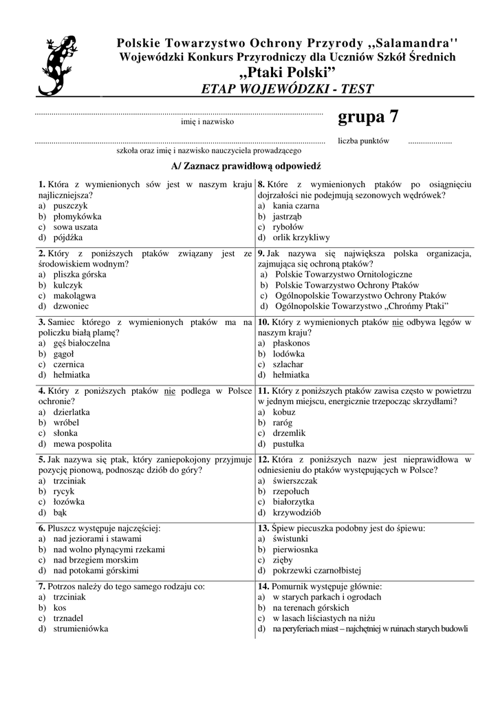 Polskie Towarzystwo Ochrony Przyrody ,,Salamandra'' Wojewódzki Konkurs Przyrodniczy dla Uczniów Szkół Średnich „Ptaki Polski” ETAP WOJEWÓDZKI - TEST ........................................................................................................................................... imię i nazwisko grupa 7 ............................................................................................................................................ szkoła oraz imię i nazwisko nauczyciela prowadzącego liczba punktów ..................... A/ Zaznacz prawidłową odpowiedź 1. Która z wymienionych sów jest w naszym kraju 8. Które z wymienionych ptaków po osiągnięciu najliczniejsza? dojrzałości nie podejmują sezonowych wędrówek? a) puszczyk a) kania czarna b) płomykówka b) jastrząb c) sowa uszata c) rybołów d) pójdźka d) orlik krzykliwy 2. Który z poniższych ptaków związany jest ze 9. Jak nazywa się największa polska organizacja, środowiskiem wodnym? zajmująca się ochroną ptaków? a) pliszka górska a) Polskie Towarzystwo Ornitologiczne b) kulczyk b) Polskie Towarzystwo Ochrony Ptaków c) makolągwa c) Ogólnopolskie Towarzystwo Ochrony Ptaków d) dzwoniec d) Ogólnopolskie Towarzystwo „Chrońmy Ptaki” 3. Samiec którego z wymienionych ptaków ma na 10. Który z wymienionych ptaków nie odbywa lęgów w policzku białą plamę? naszym kraju? a) gęś białoczelna a) płaskonos b) gągoł b) lodówka c) czernica c) szlachar d) hełmiatka d) hełmiatka 4. Który z poniższych ptaków nie podlega w Polsce 11. Który z poniższych ptaków zawisa często w powietrzu ochronie? w jednym miejscu, energicznie trzepocząc skrzydłami? a) dzierlatka a) kobuz b) wróbel b) raróg c) słonka c) drzemlik d) mewa pospolita d) pustułka 5. Jak nazywa się ptak, który zaniepokojony przyjmuje 12. Która z poniższych nazw jest nieprawidłowa w pozycję pionową, podnosząc dziób do góry? odniesieniu do ptaków występujących w Polsce? a) trzciniak a) świerszczak b) rycyk b) rzepołuch c) łozówka c) białorzytka d) bąk d) krzywodziób 6. Pluszcz występuje najczęściej: a) nad jeziorami i stawami b) nad wolno płynącymi rzekami c) nad brzegiem morskim d) nad potokami górskimi 13. Śpiew piecuszka podobny jest do śpiewu: a) świstunki b) pierwiosnka c) zięby d) pokrzewki czarnołbistej 7. Potrzos należy do tego samego rodzaju co: a) trzciniak b) kos c) trznadel d) strumieniówka 14. Pomurnik występuje głównie: a) w starych parkach i ogrodach b) na terenach górskich c) w lasach liściastych na niżu d) na peryferiach miast – najchętniej w ruinach starych budowli B/ Oceń prawdziwość zdań 15. Sójka potrafi doskonale naśladować głosy 18. Dzięcioły nie potrafią schodzić po pniu drzewa innych ptaków, szczególnie myszołowa. głową w dół. TAK NIE TAK 16. Szczygieł jest wyspecjalizowany wydobywaniu nasion z ostów. TAK NIE w 19. Nazwa zimorodek wzięła się stąd, iż ptaki te rozpoczynają lęgi już pod koniec lutego. NIE TAK 17. Czapla siwa żywi się wyłącznie rybami. NIE 20. Gołąb grzywacz nie podlega w Polsce ochronie prawnej. TAK NIE TAK NIE C/ Odpowiedz na pytania 21. Wymień cztery występujące w Polsce gatunki 23. Wymień trzy gatunki dziko żyjących w Polsce należące do rodzaju dzierzba. ptaków z rzędu kuraków, które nie są w naszym kraju objęte ochroną prawną. .................................................................................. .................................................................................. .................................................................................. .................................................................................. .................................................................................. .................................................................................. .................................................................................. 22. Do jakiej rodziny należy dudek? 24. Jak nazywamy głos wydawany przez żurawie? .................................................................................. .................................................................................. D/ Podaj nazwy gatunkowe ptaków przedstawionych na rysunkach 25. ................................................... 26. 27. ..................................................... .......................................................