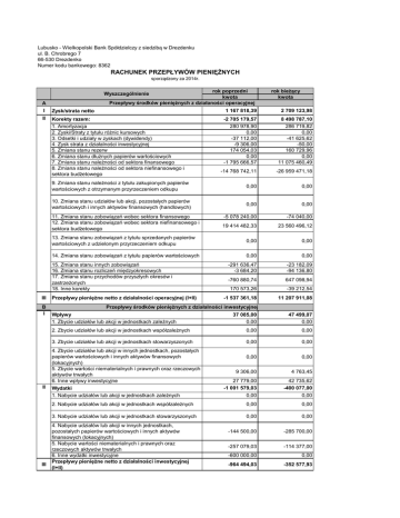 Lubusko - Wielkopolski Bank Spółdzielczy z siedzibą w Drezdenku ul. B. Chrobrego 7 66-530 Drezdenko Numer kodu bankowego: 8362 RACHUNEK PRZEPŁYWÓW PIENIĘŻNYCH sporządzony za 2014r. rok poprzedni kwota Przepływy środków pieniężnych z działaności operacyjnej Wyszczególnienie A I Zysk/strata netto II Korekty razem: 1. Amortyzacja 2. Zyski/Straty z tytułu różnic kursowych 3. Odsetki i udziały w zyskach (dywidendy) 4. Zysk strata z działalności inwestycyjnej 5. Zmiana stanu rezerw 6. Zmiana stanu dłużnych papierów wartościowych 7. Zmiana stanu należności od sektora finansowego 8. Zmiana stanu należności od sektora niefinansowego i sektora budżetowego 1 167 818,39 2 709 123,98 -2 705 179,57 280 978,90 0,00 -37 112,00 -9 306,00 174 054,03 0,00 -1 795 666,57 8 498 787,10 286 719,82 0,00 -41 625,62 -50,00 160 729,96 0,00 11 075 460,49 -14 768 742,11 -26 959 471,18 9. Zmiana stanu należności z tytułu zakupionych papierów wartościowych z otrzymanym przyrzeczeniem odkupu 0,00 0,00 10. Zmiana stanu udziałów lub akcji, pozostałych papierów wartościowych i innych aktywów finansowych (handlowych) 0,00 0,00 -5 078 240,00 -74 040,00 19 414 482,33 23 560 496,12 13. Zmiana stanu zobowiązań z tytułu sprzedanych papierów wartościowych z udzielonym przyrzeczeniem odkupu 0,00 0,00 14. Zmiana stanu zobowiązań z tytułu papierów wartościowych 0,00 0,00 -291 636,47 -3 684,20 -23 182,09 -94 136,80 -760 880,74 647 098,94 11. Zmiana stanu zobowiązań wobec sektora finansowego 12. Zmiana stanu zobowiązań wobec sektora niefinansowego i sektora budżetowego 15. Zmiana stanu innych zobowiązań 16. Zmiana stanu rozliczeń międzyokresowych 17. Zmiana stanu przychodów przyszłych okresów i zastrzeżonych 18. Inne korekty III B I Przepływy pieniężne netto z działalności operacyjnej (I+II) III 170 573,26 -39 212,54 -1 537 361,18 11 207 911,08 Przepływy środków pieniężnych z działalności inwestycyjnej Wpływy 1. Zbycie udziałów lub akcji w jednostkach zależnych 37 085,00 0,00 47 499,07 0,00 2. Zbycie udziałów lub akcji w jednostkach współzależnych 0,00 0,00 3. Zbycie udziałów lub akcji w jednostkach stowarzyszonych 0,00 0,00 0,00 0,00 9 306,00 4 763,45 27 779,00 -1 001 579,03 0,00 42 735,62 -400 077,00 0,00 2. Nabycie udziałów lub akcji w jednostkach współzależnych 0,00 0,00 3. Nabycie udziałów lub akcji w jednostkach stowarzyszonych 0,00 0,00 -144 500,00 -285 700,00 -257 079,03 -114 377,00 -600 000,00 0,00 -964 494,03 -352 577,93 4. Zbycie udziałów lub akcji w innych jednostkach, pozostałych papierów wartościowych i innych aktywów finansowych (lokacyjnych) 5. Zbycie wartości niematerialnych i prawnych oraz rzeczowych aktywów trwałych 6. Inne wpływy inwestycyjne II rok bieżący kwota Wydatki 1. Nabycie udziałów lub akcji w jednostkach zależnych 4. Nabycie udziałów lub akcji w innych jednostkach, pozostałych papierów wartościowych i innych aktywów finansowych (lokacyjnych) 5. Nabycie wartości niematerialnych i prawnych oraz rzeczowych aktywów trwałych 6. Inne wydatki inwestycyjne Przepływy pieniężne netto z działalności inwestycyjnej (I+II) C I Przepływy środków pieniężnych z działalności finansowej Wpływy 11 200,00 9 260,00 0,00 0,00 0,00 0,00 0,00 0,00 0,00 10 500,00 700,00 -28 164,00 0,00 8 100,00 1 160,00 -29 800,00 0,00 0,00 0,00 0,00 0,00 0,00 0,00 0,00 0,00 0,00 6. Zmniejszenie stanu zobowiązań podporządkowanych 7. Dywidendy i inne wypłaty na rzecz właścicieli 8. Inne, niż wypłaty na rzecz właścicieli, wydatki z tytułu podziału zysku 9. Nabycie akcji własnych 10. Inne wydatki finansowe 0,00 -28 164,00 0,00 -29 800,00 0,00 0,00 0,00 0,00 0,00 0,00 III Przepływy pieniężne netto z działalności finansowej (I+II) -16 964,00 -20 540,00 D E Przepływy pieniężne netto, razem (A.III + B.III + C.III) Bilansowa zmiana stanu środków pieniężnych, w tym: - zmiana stanu środków pieniężnych z tytułu różnic kursowych Środki pieniężne na początek okresu -2 518 819,21 -2 518 819,21 10 834 793,15 10 834 793,15 0,00 0,00 13 747 244,82 11 228 425,61 Środki pieniężne na koniec okresu (F+D), w tym: - o ograniczonej możliwości dysponowania 11 228 425,61 0,00 22 063 218,76 0,00 1. Zaciągnięcie długoterminowych kredytów od innych banków 2. Zaciągnięcie długoterminowych pożyczek od innych niż banki instytucji finansowych 3. Emisja dłużnych papierów wartościowych dla innych instytucji finansowych 4. Zwiększenie stanu zobowiązań podporządkowanych 5. Wpływy netto z emisji akcji i dopłat do kapitału 6. Inne wpływy finansowe II Wydatki 1. Spłata długoterminowych kredytów na rzecz innych banków 2. Spłata długoterminowych pożyczek na rzecz innych niż banki instytucji finansowych 3. Wykup dłużnych papierów wartościowych dla innych instytucji finansowych 4. Z tytułu innych zobowiązań finansowych 5. Płatności zobowiązań z tytułu umów leasingu finansowego F G Sporządził: Główny Księgowy Banku: Katarzyna Białas Katarzyna Białas Podpis: ................................. Data: 2015-02-18 Podpis: .......................... ZARZĄD BANKU (podpisy członków Zarządu)