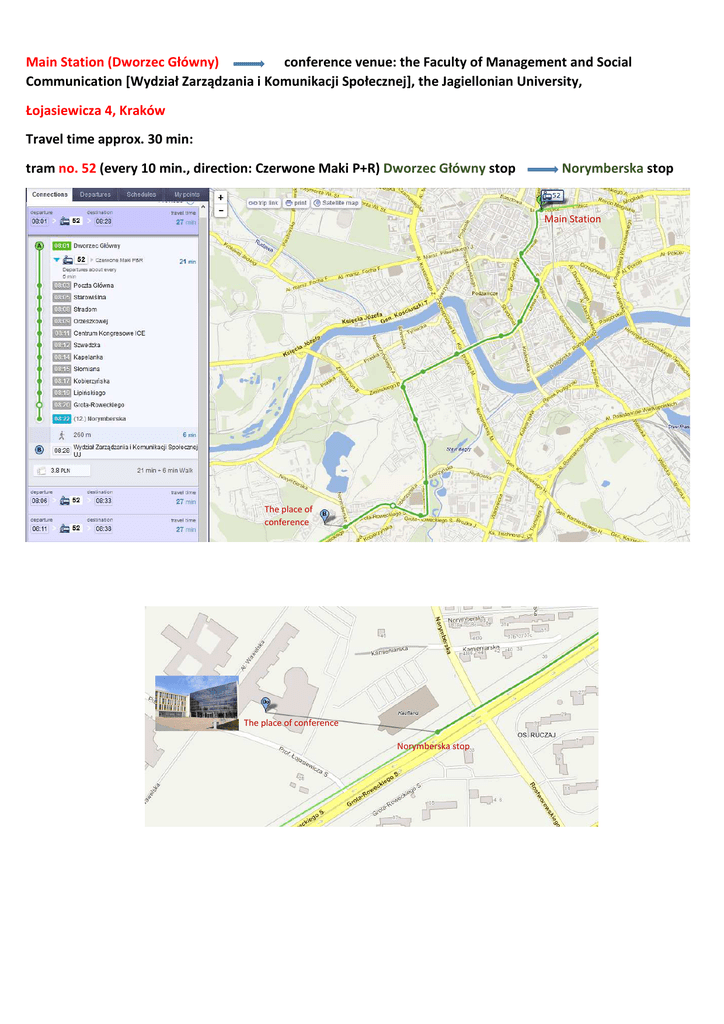 Main Station (Dworzec Główny) conference venue: the Faculty of Management and Social Communication [Wydział Zarządzania i Komunikacji Społecznej], the Jagiellonian University, Łojasiewicza 4, Kraków Travel time approx. 30 min: tram no. 52 (every 10 min., direction: Czerwone Maki P+R) Dworzec Główny stop Norymberska stop Main Station The place of conference The place of conference Norymberska stop