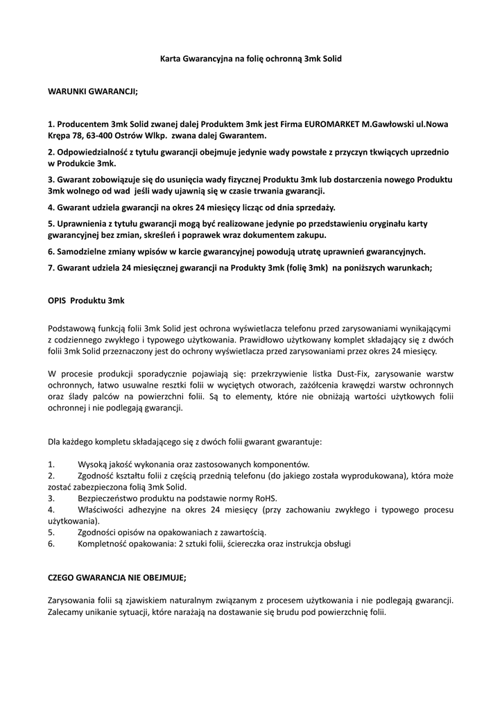 Karta Gwarancyjna na folię ochronną 3mk Solid WARUNKI GWARANCJI; 1. Producentem 3mk Solid zwanej dalej Produktem 3mk jest Firma EUROMARKET M.Gawłowski ul.Nowa Krępa 78, 63-400 Ostrów Wlkp. zwana dalej Gwarantem. 2. Odpowiedzialność z tytułu gwarancji obejmuje jedynie wady powstałe z przyczyn tkwiących uprzednio w Produkcie 3mk. 3. Gwarant zobowiązuje się do usunięcia wady fizycznej Produktu 3mk lub dostarczenia nowego Produktu 3mk wolnego od wad jeśli wady ujawnią się w czasie trwania gwarancji. 4. Gwarant udziela gwarancji na okres 24 miesięcy licząc od dnia sprzedaży. 5. Uprawnienia z tytułu gwarancji mogą być realizowane jedynie po przedstawieniu oryginału karty gwarancyjnej bez zmian, skreśleń i poprawek wraz dokumentem zakupu. 6. Samodzielne zmiany wpisów w karcie gwarancyjnej powodują utratę uprawnień gwarancyjnych. 7. Gwarant udziela 24 miesięcznej gwarancji na Produkty 3mk (folię 3mk) na poniższych warunkach; OPIS Produktu 3mk Podstawową funkcją folii 3mk Solid jest ochrona wyświetlacza telefonu przed zarysowaniami wynikającymi z codziennego zwykłego i typowego użytkowania. Prawidłowo użytkowany komplet składający się z dwóch folii 3mk Solid przeznaczony jest do ochrony wyświetlacza przed zarysowaniami przez okres 24 miesięcy. W procesie produkcji sporadycznie pojawiają się: przekrzywienie listka Dust-Fix, zarysowanie warstw ochronnych, łatwo usuwalne resztki folii w wyciętych otworach, zażółcenia krawędzi warstw ochronnych oraz ślady palców na powierzchni folii. Są to elementy, które nie obniżają wartości użytkowych folii ochronnej i nie podlegają gwarancji. Dla każdego kompletu składającego się z dwóch folii gwarant gwarantuje: 1. Wysoką jakość wykonania oraz zastosowanych komponentów. 2. Zgodność kształtu folii z częścią przednią telefonu (do jakiego została wyprodukowana), która może zostać zabezpieczona folią 3mk Solid. 3. Bezpieczeństwo produktu na podstawie normy RoHS. 4. Właściwości adhezyjne na okres 24 miesięcy (przy zachowaniu zwykłego i typowego procesu użytkowania). 5. Zgodności opisów na opakowaniach z zawartością. 6. Kompletność opakowania: 2 sztuki folii, ściereczka oraz instrukcja obsługi CZEGO GWARANCJA NIE OBEJMUJE; Zarysowania folii są zjawiskiem naturalnym związanym z procesem użytkowania i nie podlegają gwarancji. Zalecamy unikanie sytuacji, które narażają na dostawanie się brudu pod powierzchnię folii. Gwarancji nie podlega także folia: 1. Użytkowana w temperaturze poniżej 5 i powyżej 30 stopni. 2. Nieutrzymywana w należytej czystości. 3. Zdejmowana po dokonanym montażu. 4. Nosząca ślady stosowania środków chemicznych i ich oparów. 5. Nosząca ślady ingerencji mechanicznej (np. samodzielne przycinanie, robienie otworów w jej powierzchni). 6. Sprzedana w opakowaniu uszkodzonym lub naruszonym wskutek złego przechowywania w magazynach Dystrybutora lub Sprzedawcy. 7. O naruszonym listku Dust-Fix. 8. Niezabezpieczająca krawędzi wyświetlacza w przypadku, gdy jest to model telefonu, który posiada wygiętą powierzchnię wyświetlacza (np. Samusung Galaxy S3 i9300, czy Nokia Lumia 920). Stan obecnej technologii folii 3mk Solid, nie pozwala na wyprodukowanie folii przylegającej do całej powierzchni przodu takiego telefonu. Gwarant produkuje na tego typu modele folie dopasowane wyłącznie do całej płaskiej powierzchni przodu telefonu. NAZWA/SYMBOL PRODUKTU …………………………… DATA SPRZEDAŻY ………………… MIEJSCE SPRZEDAŻY (PIECZĄTKA I PODPIS) ………………. NUMER PARAGONU LUB FV…………………. GWARANT ……………………………. KUPUJĄCY ………………………………