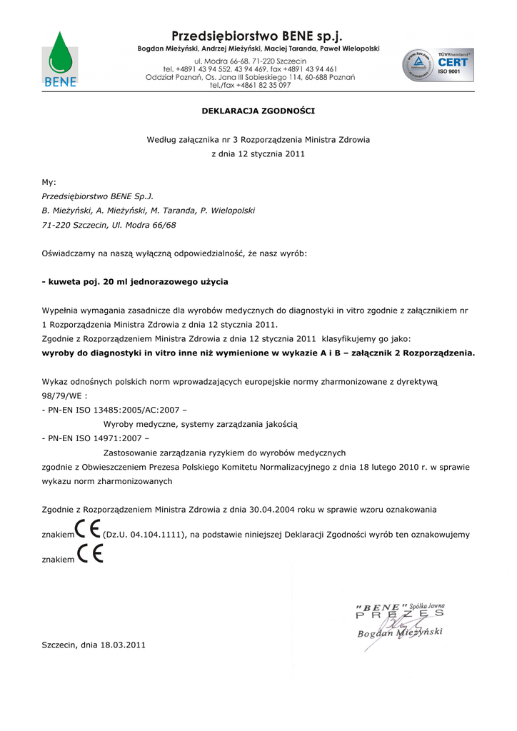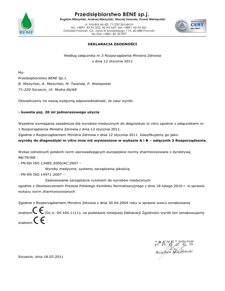 DEKLARACJA ZGODNOŚCI Według załącznika nr 3 Rozporządzenia Ministra Zdrowia z dnia 12 stycznia 2011 My: Przedsiębiorstwo BENE Sp.J. B. MieŜyński, A. MieŜyński, M. Taranda, P. Wielopolski 71-220 Szczecin, Ul. Modra 66/68 Oświadczamy na naszą wyłączną odpowiedzialność, że nasz wyrób: - kuweta poj. 20 ml jednorazowego uŜycia Wypełnia wymagania zasadnicze dla wyrobów medycznych do diagnostyki in vitro zgodnie z załącznikiem nr 1 Rozporządzenia Ministra Zdrowia z dnia 12 stycznia 2011. Zgodnie z Rozporządzeniem Ministra Zdrowia z dnia 12 stycznia 2011 klasyfikujemy go jako: wyroby do diagnostyki in vitro inne niŜ wymienione w wykazie A i B – załącznik 2 Rozporządzenia. Wykaz odnośnych polskich norm wprowadzających europejskie normy zharmonizowane z dyrektywą 98/79/WE : - PN-EN ISO 13485:2005/AC:2007 – Wyroby medyczne, systemy zarządzania jakością - PN-EN ISO 14971:2007 – Zastosowanie zarządzania ryzykiem do wyrobów medycznych zgodnie z Obwieszczeniem Prezesa Polskiego Komitetu Normalizacyjnego z dnia 18 lutego 2010 r. w sprawie wykazu norm zharmonizowanych Zgodnie z Rozporządzeniem Ministra Zdrowia z dnia 30.04.2004 roku w sprawie wzoru oznakowania znakiem (Dz.U. 04.104.1111), na podstawie niniejszej Deklaracji Zgodności wyrób ten oznakowujemy znakiem Szczecin, dnia 18.03.2011