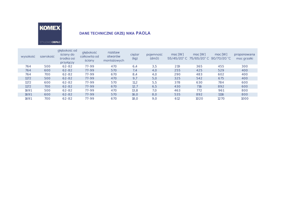 DANE TECHNICZNE GRZEJNIKA PAOLA rozstaw otworów 764 764 764 1172 1172 1172 1691 1691 1691 500 600 700 500 600 700 500 600 700 62-82 62-82 62-82 62-82 62-82 62-82 62-82 62-82 62-82 77-99 77-99 77-99 77-99 77-99 77-99 77-99 77-99 77-99 470 570 670 470 570 670 470 570 670 (kg) (dm3) 6,4 7,4 8,4 9,7 11,2 12,7 13,8 16,0 18,0 3,5 4,0 4,0 5,0 5,5 6,5 7,0 8,0 9,0 moc [W] moc [W] moc [W] proponowana 219 255 290 325 378 430 463 535 612 365 425 483 542 630 716 772 892 1020 455 529 602 675 784 892 961 1116 1270 300 400 400 400 600 600 800 800 1000