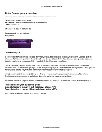 Sofa Diana plusz tkanina http://www.futurefurniture.pl/pl/offer/meble/sofy-stylowe/sofa-diana-plusz-tkanina.html/ Projekt: styl klasyczny angielski Producent:: produkowana w Polsce dla IdealMeble Cena: 3450.00 zł Wymiary: D: 90 | S: 220 | W: 80 Dostępność: Na zamówienie 4-6 tygodni Charakterystyka: 3-osobowa sofa Chesterfield posiada drewniany stelaż, tapicerowana fioletowym pluszem. Oparcie głęboko pikowane fioletowymi guzikami charakterystyczne dla sof Chesterfield. Sofa Diana w dolnej części posiada dodatkowo pionowe przeszycia, które nadają jej indywidualnego charakteru. Sofa w całości wykonana jest ręcznie przez polskiego producenta z troską o najdrobniejsze szczegóły z zachowaniem zasad technologicznych i stylu. Nie przetrzymujemy Chesterfieldów w magazynach. Każdy model wykonywany jest na indywidualne zamówienie z uwzględnieniem Państwa sugestii. Istnieje możliwość nieznacznej różnicy w odcieniu w poszczególnych partiach tkaniny/eko-skóry/skóry. Odcień może inaczej prezentować się na dużym kawałku niż na mniejszej próbce. Możliwość ustalenia indywidualnie rozmiarów i modyfikacji wzoru z zachowaniem zasad technologicznych. Podana cena dotyczy tapicerki z grupy I Cena dla tapicerki z grupy II jest dodatkowo płatna +15% Cena dla tapicerki z grupy III jest dodatkowo płatna +20% W przypadku tapicerki skórzanej prosimy o kontakt. http://www.futurefurniture.pl Dostępne wersje produktu: nazwa produktu warianty Sofa Diana 4 osobowaTapicerka plusz, tkanina cena dostępne 4100.00zł 3600.00zł 4-6 tygodni Funkcja spania (+1000.00 zł) Pikowane siedzisko (+750.00 zł) Pojemnik (+300.00 zł) Kryształki Swarovskiego (+1200.00 zł) Sofa Diana 3 osobowaTapicerka plusz, 3450.00zł tkanina Funkcja spania (+1000.00 zł) Pikowane siedzisko (+650.00 zł) Pojemnik (+300.00 zł) Kryształki Swarovskiego (+800.00 zł) Sofa Diana 2 osobowaTapicerka plusz, 3150.00zł 185cm tkanina Funkcja spania (+1000.00 zł) Pikowane siedzisko (+550.00 zł) Pojemnik (+300.00 zł) Kryształki Swarovskiego (+700.00 zł) Sofa Diana 2 osobowaTapicerka plusz, 3100.00zł 165cm tkanina Fotel Diana Funkcja spania (+1000.00 zł) Pikowane siedzisko (+500.00 zł) Pojemnik (+300.00 zł) Kryształki Swarovskiego (+700.00 zł) Tapicerka plusz, 2100.00zł tkanina Pojemnik (+300.00 zł) Kryształki Swarovskiego http://www.futurefurniture.pl 4-6 tygodni 4-6 tygodni 4-6 tygodni 4-6 tygodni nazwa produktu warianty cena (+500.00 zł) Pikowane siedzisko (+450.00 zł) http://www.futurefurniture.pl dostępne Zdjęcia produktu: http://www.futurefurniture.pl Powered by TCPDF (www.tcpdf.org)