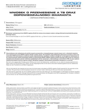 Bitte senden Sie dieses Formular unterzeichnet an: f +49 (0) 40 32 52 88 3 - 29 | e [email protected] Your Corporate Gate to a World of Logistics WNIOSEK O PRZENIESIENIE A TB ORAZ ODPOWIEDZIALNOSCI GWARANTA – VERWAHRERWECHSEL – 1 Zleceniodawca/Auftraggeber Nazwa/Firmy/Firma: NIP/UST.-ID.-Nr.: Ulica/Straße: Osoba kontaktowa/Kontakt: Kod Pocztowy, Miejscowosc/Plz, Ort: 2 Nieniejszym upowazniamy firme CGATE Logistics GmbH do zmiany oraz przejecia nadzoru celnego (Verwahrerwechsel) dla ponizej podanego towaru. Hiermit bevollmächtigen wir die Firma CGATE Logistics GmbH die u. g. Waren für einen Verwahrerwechsel anzumelden. Numer ATB/ATB-Nummer: Pozycia ATB/Positions-Nr.: Numer Kontenera/Container: Ilosc Paczek/Kolli-Zahl: Wage/Gewicht: 3 Zleceniodawaca jest zobowiazany do poinformowania przewoznika o niewspolnotowym statusie towaru jak i o obowiazki stawienia sie w wyznaczonym przez CGATE Logistics GmbH urzedzie celnym. W przypadku nieprawidlowego zakonczenia procedury celnej oraz zamkniecia ATB zleceniodawca przejmuje wszelka odpowiedzialnosc wynikajac z kodeksu celnego jak i prawnegooraz zobowiazuje sie do natychmiastowej zaplaty powstalego podatku przywozowego (EUST). CGATE Logistics GmbH zastrzega sobie prawo do naliczenia zabezpieczenia (kaucji) na poczet naleznosci podatkowych jaki kar zwiazanych z nieprawidlowym zamknieciem ATB, do czasu wydania ostateczniej decyzji od strony organow celnych. Niniejszym podpisem zleceniodawca poswiadcza akceptuje w/w warunki. Bei nicht ordnungsgemäßer Erledigung der ATB Nummer durch die Zollbehörden, verpflichten wir uns, dadurch entstehende Einfuhrabgaben sofort auf die Anforderung zu zahlen. Auf die Zollguteigenschaft und die damit verbundene Gestellungspflicht bei der Zollbehörde haben wir den Frachtführer schriftlich hingewiesen. We are fully liable for the integrity and accuracy of all information submitted to CGATE Logistics GmbH essential for the execution of the mandate. We guarantee to submit duplicate invoices for turnover made in Germany for the use of the fiscal representative. Wir übernehmen gegenüber der Firma CGATE Logistics GmbH die volle Haftung für die Vollständigkeit und Richtigkeit sämtlicher Angaben, die für die Durchführung der Aufträge erforderlich sind und gewährleisten die Übergabe eines Rechnungsdoppels für Umsätze in Deutschland, bei denen von der Fiskalvertretung Gebrauch gemacht wird. 4 Data, Miejscowosc/Datum, Ort Podpis i pieczec zleceniodawcy/Unterschrift CGATE Logistics GmbH - Hamburg arbeitet ausschließlich auf Grundlage der Allgemeinen Deutschen Spediteurbedingungen, jeweils neueste Fassung. Diese beschränken in Ziffer 23 ADSp die gesetzliche Haftung für Güterschäden nach § 431 HGB für Schäden in speditionellem Gewahrsam auf 5 €/kg;; bei multimodalen Transporten unter Einschluß einer Seebeförderung auf 2 SZ/kg sowie darüberhinaus je Schadenfall bzw. –ereignis auf 1 Mio bzw. 2 Mio € oder 2 SZR/kg, je nachdem, welcher Betrag höher ist. http://www.imf.org/ external/fin.htm - Handelsregister Hamburg HRB 110265- Geschäftsführer: Jan Philipp Pohlmeier - UST.-ID.-Nr.: DE265789500- Gerichtsstand Hamburg (Deutschland) - Sitz der Gesellschaft : Hamburg (Deutschland) Air Freight CGATE Logistics GmbH | Kattrepel 2 | 20095 Hamburg | Germany t: +49 (0) 40 32 52 88 3 - 0 | f: +49 (0) 40 32 52 88 3 - 29 e: [email protected] www.cgate-logistics.com Sea Freight Geschäftsführer: Jan-Philipp Pohlmeier USt.-ID-Nr.: DE265789500 Handelsregister: HRB 110265 Gerichtsstand: Hamburg Land Transport Bank: Commerzbank Hamburg IBAN: DE4520040000064035960 | BIC/SWIFT: COBADEFFXXX Bank: Hamburger Sparkasse IBAN: DE66200505501262210956 | BIC/SWIFT: HASPDEHHXXX VerwWe_PL_16_01 CGATE Logistics GmbH - Hamburg - works upon ADSp Allgemeine Deutsche Spediteurbedingungen (German Forwarder’s Terms and conditions) - newest edition. The ADSp limit in paragraph 23 ADSp the legal liability for damage to goods in case of damage whilst in the care of a forwarder to EUR 5/KG, in accordance with § 431 of the German Commercial Code (HGB); in the case of multimodal transports, including sea transports to 2 SDR/KG (special drawings rights)plus in addtion per damage or event to 1 Mio EUR or 2 Mio EUR respectively, or EUR 2 SDR/kg whichever is bigger. The German Forwarders Standard Terms and Conditions (ADSp) are regarded as being agreed for any forwarding orders as placed with us. More detailed information regarding the SDR you can find http://www.imf.org/external/fin.htm - commercial register Hamburg HRB 110265- Managing Director : Jan Philipp Pohlmeier - VAT.-Id.-Nr.: DE265789500- place of jurisdiction Hamburg (Germany) - Head Office : Hamburg (Germany)