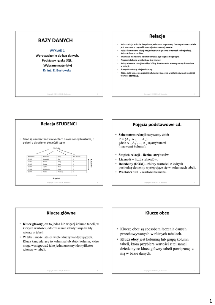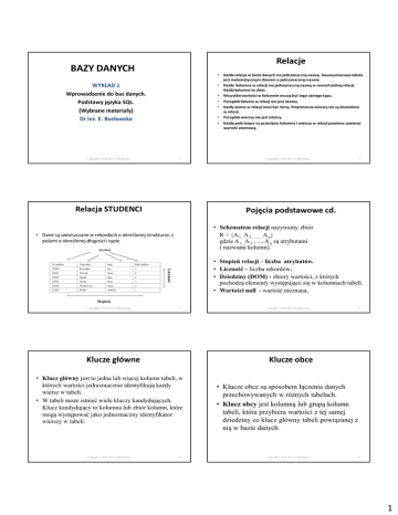 • Klucz główny jest to jedna lub więcej kolumn tabeli, w