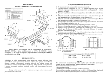 INSTRUKCJA montaŜu i eksploatacji zaczepu kulowego Oznaczenie zacisku wg ISO PN 1 L 2 + 3 31 4 R 5 58R 6 54 7 58L Łączenie przewodów Kolejność czynności przy montaŜu B Kierunkowskazy lewe Tylne światła przeciwmgłowe Masa Kierunkowskazy prawe Światła pozycyjne prawe Światła hamowania Światła pozycyjne lewe 8 B A 6 M10x35 A 4 8 7 M12x35 A 1 M12x25 B 18 M10x35 1. W celu zamontowania zaczepu naleŜy zdemontować zderzak. 2. Od spodu pojazdu odtrasować wg rys. 2, a następnie wykonać otwory ø11mm, (wiercenia wypadają w miejscach zgrzewania podłuŜnic z podłogą pojazdu – wykonać starannie i dokładnie). 3. Wewnątrz bagaŜnika na wykonane otwory przyłoŜyć odpowiednio górne nakładki (poz. 8). 4. Od spodu samochodu przyłoŜyć wsporniki boczne (poz. 4 i 5) i przez otwory (poz. A) oraz duŜe nakładki (poz. 8) skręcić śrubami M10x35mm (poz. 11). 5. Od spodu samochodu przyłoŜyć nakładki (poz. 6 i 7) i poprzez otwory (poz. B) oraz duŜe nakładki (poz. 8) skręcić śrubami M10x35mm (poz. 11). 6. Do wsporników bocznych poprzez otwory (poz. C) przykręcić śrubami M12x35mm (poz. 10) belkę główną zaczepu (poz. 1). 7. Dokręcić wszystkie zamocowane śruby momentem pokazanym w tabeli. 8. Zamontować zderzak po uprzednim wycięciu jego fragmentów (patrz rys. 3). 9. Przykręcić korpus automatu (poz. 18) śrubami M12x25mm (poz. 9) wraz z blachą pod gniazdo (poz. 3). Zamocować kulę zgodnie z instrukcją dołączaną do zaczepu z końcówką szybkodemontowalną. 10. Podłączyć przewody z gniazdka 7 – bieg. do instalacji elektrycznej zgodnie z instrukcją fabryczną samochodu (zaleca się wykonanie w ASO). 11. Uzupełnić ewentualne ubytki powłoki malarskiej powstałe w trakcie montaŜu zaczepu. 2 5 60 M12x35 30 C M10x35 3 Rys. 1 Zaczep kulowy przeznaczony jest do zamontowania w samochodzie: HONDA CIVIC, 4 drz., produkowanym od 1999r. do 10.2000r., numer katalogowy Y17A i słuŜy do ciągnięcia przyczep o masie całkowitej do 1300 kg i nacisku na kulę max 50 kg. OD PRODUCENTA Dziękujemy za wybór produkowanego przez naszą firmę zaczepu kulowego. Jego niezawodność została potwierdzona licznymi testami oraz opiniami zadowolonych klientów. JednakŜe niezawodność zaczepów kulowych jest zaleŜna równieŜ od prawidłowego montaŜu oraz prawidłowej eksploatacji. Z tego powodu prosimy Państwa o staranne przeczytanie niniejszej instrukcji montaŜu oraz przestrzeganie zawartych wskazówek. Zaczep naleŜy zamontować w miejscach do tego celu przeznaczonych przez producenta samochodu. Widok od spodu pojazdu po zdjęciu zderzaka Zalecany moment skręcający dla śrub i nakrętek 8,8: M 8 - 25 Nm M 10 - 55 Nm M 12 - 85 Nm M 14 - 135 Nm UWAGA Po zamontowaniu zaczepu kulowego naleŜy uzyskać wpis w dowodzie rejestracyjnym pojazdu na „stacji kontroli pojazdów” właściwej dla miejsca zamieszkania. Samochód powinien być wyposaŜony w : -kierunkowskazy boczne -lusterka boczne o rozstawie co najmniej szerokości przyczepy Sprawdzać śruby mocujące zaczepu kulowego po około 1 000 km przebiegu eksploatacji. Kula zaczepu musi być utrzymana w czystości i konserwowana smarem stałym. PPUH AUTO-HAK S.J. WyposaŜenie zaczepu: Produkcja Zaczepów Kulowych Henryk & Zbigniew Nejman 76-200 SŁUPSK ul. Słoneczna 16K tel/fax (059) 8-414-414; 8-414-413 email: [email protected] www.autohak.com.pl Zaczep kulowy bez wyposaŜenia elektrycznego Y17A Klasa: A50-X Nr kat. Przeznaczony do zamontowania w samochodzie: Producent: HONDA Model: CIVIC Typ: 4 drz. produkowanego od 1999r. do 10.2000r. Dane techniczne: Wartość siły D : 6,07 kN maksymalna masa przyczepy: 1300 kg maksymalny nacisk na kulę: 50 kg Numer homologacji zgodnie z dyrektywą 94/20/WE: e20*94/20*0577*00 KARTA GWARANCYJNA Producent udziela gwarancji niniejszą kartą gwarancyjną na okres 24 miesięcy licząc od dnia zakupu zaczepu kulowego do samochodu: HONDA CIVIC 4 drz. produkowanego od 1999r. do 10.2000r. Data produkcji .............................. Data zakupu.................................. Zakres gwarancji obejmuje wyłącznie wady jakościowe wynikające z winy producenta. Gwarancja nie obejmuje natomiast uszkodzeń zawinionych przez nabywcę, wynikających z niewłaściwego montaŜu, uŜytkowania lub konserwacji, uszkodzeń mechanicznych, normalnego zuŜycia podczas eksploatacji itp. Gwarancja udzielona na zakupiony towar nie wyłącza, nie ogranicza ani nie zawiesza uprawnień kupującego wynikających z niezgodności towaru z umową. Reklamacje naleŜy zgłaszać w punkcie sprzedaŜy, składając jednocześnie kartę gwarancyjną. Usunięcie "wady" następuje po stwierdzeniu przez punkt sprzedaŜy wspólnie z producentem słuszności złoŜonej reklamacji. Reklamacja powinna być załatwiona w ciągu 14 dni od dnia uznania reklamacji. Karta gwarancyjna jest niewaŜna jeŜeli nie jest wypełniona i podpisana. Data zgłoszenia reklamacji: ................................................................... INFORMACJA WSTĘPNA Zaczep kulowy jest skonstruowany zgodnie z zasadami bezpieczeństwa ruchu drogowego. Zaczep kulowy jest elementem wpływającym na bezpieczeństwo jazdy i moŜe zostać zainstalowany wyłącznie przez personel wyspecjalizowany. Niedopuszczalne jest dokonywanie jakichkolwiek zmian w konstrukcji zaczepu. Powoduje to wygaśniecie dopuszczenia do stosowania. W przypadku obecności masy izolacyjnej lub osłony podwozia w miejscu przylegania zaczepu, naleŜy ją usunąć. Nieosłonięte miejsca karoserii oraz wywiercone otwory naleŜy pomalować farbą antykorozyjną. Informacjami wiąŜącymi odnośnie wartości obciąŜeń są dane podawane przez producenta samochodu, względnie wartości maksymalnej masy przyczepy oraz maksymalnego nacisku na kulę, przy czym wartości parametrów zaczepu kulowego nie mogą być przekroczone. Wzór do obliczania wartości siły D: Maks. masa przyczepy [kg] x Maks. masa samochodu [kg] Maks. masa przyczepy [kg] + Maks. masa samochodu [kg