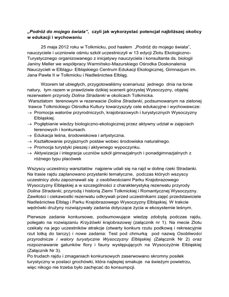 „Podróż do mojego świata”, czyli jak wykorzystać potencjał najbliższej okolicy w edukacji i wychowaniu 25 maja 2012 roku w Tolkmicku, pod hasłem „Podróż do mojego świata”, nauczyciele i uczniowie ośmiu szkół uczestniczyli w 13 edycji Zlotu EkologicznoTurystycznego organizowanego z inicjatywy nauczyciela i konsultanta ds. biologii Janiny Meller we współpracy Warmińsko-Mazurskiego Ośrodka Doskonalenia Nauczycieli w Elblągu- Elbląskiego Centrum Edukacji Ekologicznej, Gimnazjum im. Jana Pawła II w Tolkmicku i Nadleśnictwa Elbląg. Wzorem lat ubiegłych, przygotowaliśmy scenariusz jednego dnia na łonie natury, tym razem w prawdziwie dzikiej scenerii górzystej Wysoczyzny, objętej rezerwatem przyrody Dolina Stradanki w okolicach Tolkmicka. Warsztatom terenowym w rezerwacie Dolina Stradanki, podsumowanym na zielonej trawce Tolkmickiego Ośrodka Kultury towarzyszyły cele edukacyjne i wychowawcze: Promocja walorów przyrodniczych, krajobrazowych i turystycznych Wysoczyzny Elbląskiej. Pogłębianie wiedzy biologiczno-ekologicznej przez aktywny udział w zajęciach terenowych i konkursach. Edukacja leśna, środowiskowa i artystyczna. Kształtowanie przyjaznych postaw wobec środowiska naturalnego. Promocja turystyki pieszej i aktywnego wypoczynku. Aktywizacja i integracja uczniów szkół gimnazjalnych i ponadgimnazjalnych z różnego typu placówek Wszyscy uczestnicy warsztatów najpierw udali się na rajd w dolinę rzeki Stradanki. Na trasie rajdu zaplanowano przystanki tematyczne, podczas których wszyscy uczestnicy zlotu zapoznawali się z osobliwościami Parku Krajobrazowego Wysoczyzny Elbląskiej a w szczególności z charakterystyką rezerwatu przyrody Dolina Stradanki, przyrodą i historią Ziemi Tolkmickiej i Romantycznej Wysoczyzny. Zawiłości i ciekawostki rezerwatu odkrywali przed uczestnikami zajęć przedstawiciele Nadleśnictwa Elbląg i Parku Krajobrazowego Wysoczyzny Elbląskiej. W trakcie wędrówki drużyny rozwiązywały zadania dotyczące życia w ekosystemie leśnym. Pierwsze zadanie konkursowe, podsumowujące wiedzę zdobytą podczas rajdu, polegało na rozwiązaniu Krzyżówki krajobrazowej (załącznik nr 1). Na mecie Zlotu czekały na jego uczestników atrakcje (otwarty konkurs rzutu podkową i rekreacyjnie rzut lotką do tarczy) i nowe zadania: Test pod chmurką pod nazwą Osobliwości przyrodnicze i walory turystyczne Wysoczyzny Elbląskiej (Załącznik Nr 2) oraz rozpoznawanie gatunków flory i fauny występujących na Wysoczyźnie Elbląskiej (Załącznik Nr 3). Po trudach rajdu i zmaganiach konkursowych zaserwowano skromny posiłek turystyczny w postaci grochówki, która najlepiej smakuje na świeżym powietrzu, więc nikogo nie trzeba było zachęcać do konsumpcji. Ostatnią konkurencją Zlotu był tradycyjny mini festiwal piosenki zielono-zakręconej. Prezentowane piosenki zawierały w tekście słowo: woda, rzeka, jezioro, zalew, potok, strumyk lub jego odmiany. Były występy z towarzyszeniem gitar, instrumentów klawiszowych i z podkładami muzycznymi. Na koniec Zlotu podsumowano wyniki konkurencji indywidualnych i drużynowych. Szkołom wręczono pamiątkowe puchary, ufundowane przez Burmistrza Tolkmicka, który sprawował honorowy patronat nad Zlotem. Uczniowie wyróżnieni w konkursach otrzymali nagrody sfinansowane przez Wojewódzki Fundusz Ochrony Środowiska i Gospodarki Wodnej w Olsztynie i Nadleśnictwo Elbląg. Z tej wyjątkowej, terenowej i interdyscyplinarnej lekcji (biologii, ekologii, geografii, turystyki, muzyki, kultury fizycznej) skorzystało ponad stu uczestników, w tym 14 nauczycieli, którym leży na sercu wszechstronny rozwój powierzonych im uczniów. Z mojego wieloletniego doświadczenia w pracy z młodzieżą gimnazjalną jak i uczniami ze szkoły podstawowej wyrasta nie tylko moje przekonanie, że najbardziej efektywna jest wiedza oparta na bezpośredniej obserwacji i rozwiązywaniu problemów w kontakcie z naturą. Dlatego powinniśmy dbać o to, by uczniowie mieli emocjonalny kontakt ze środowiskiem przyrodniczym i kulturowym swojej najbliższej okolicy. Mówi o tym podstawa programowa, doświadczenie i logika. Mimo to, współczesnemu uczniowi bliższe jest środowisko wirtualne niż najbliższy las. Jednakże, jeśli ma się nieomalże za oknem, niezrównanie piękną i bogatą przyrodę Romantycznej Wysoczyzny, nie wolno przejść obok niej obojętnie; jeśli tak fascynujące są dzieje i miejsca w naszej okolicy, trzeba je odkrywać i pokazywać naszym uczniom. Tak wiele zależy od nauczyciela, od jego fascynacji i zaangażowania, od jego pomysłów i woli realizacji. Są wśród nas tacy nauczyciele i są uczniowie, którzy takie lekcje wspólnie przeżywają. W zielonym lesie, w głębokim borze, szukać mądrości i zdrowia możesz! – to hasło, już od kilku lat, towarzyszy majowym warsztatom terenowym na Wysoczyźnie Elbląskiej. Tegoroczny cytat przewodni Zlotu Podróż do mojego świata brzmiał nieco tajemniczo i był odczytywany bardzo osobiście przez jego uczestników. Mam przekonanie, że w świecie każdego uczestnika Zlotu znalazło się dużo miejsca dla natury i historii swojej najbliższej okolicy. Pozwala to mieć nadzieję, że przyszli uczestnicy konkursu biologicznego dla gimnazjów i przyszli olimpijczycy z przedmiotu biologia będą świadomi co nazywają i o czym mówią , gdy przyjdzie ocenić zasoby przyrodnicze wskazanego ekosystemu, oszacować zagrożenia i wskazać sposoby oraz zasadność ochrony danego biotopu czy biocenozy. Kto choć raz zobaczył z bliska dumnie wzniesione liście pióropusznika strusiego w wilgotnej dolinie prawie górskiej rzeczki Stradanki, tak rzadko spotykanego na niżu, zrozumie dlaczego trzeba ten gatunek chronić przed wyginięciem. Zrozumie też, że trzeba ochroną objąć jego wyjątkowe, niezbyt liczne stanowiska. Ktoś zwrócił uwagę na wspaniałe okazy pióropusznika strusiego (bezcenne!), ktoś zatrzymał się w zachwycie przy