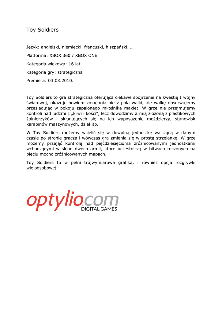 Toy Soldiers Język: angielski, niemiecki, francuski, hiszpański, … Platforma: XBOX 360 / XBOX ONE Kategoria wiekowa: 16 lat Kategoria gry: strategiczna Premiera: 03.03.2010. Toy Soldiers to gra strategiczna oferująca ciekawe spojrzenie na kwestię I wojny światowej, ukazuje bowiem zmagania nie z pola walki, ale walkę obserwujemy przesiadując w pokoju zapalonego miłośnika makiet. W grze nie przejmujemy kontroli nad ludźmi z „krwi i kości”, lecz dowodzimy armią złożoną z plastikowych żołnierzyków i składających się na ich wyposażenie moździerzy, stanowisk karabinów maszynowych, dział itp. W Toy Soldiers możemy wcielić się w dowolną jednostkę walczącą w danym czasie po stronie gracza i wówczas gra zmienia się w prostą strzelankę. W grze możemy przejąć kontrolę nad pięćdziesięcioma zróżnicowanymi jednostkami wchodzącymi w skład dwóch armii, które uczestniczą w bitwach toczonych na pięciu mocno zróżnicowanych mapach. Toy Soldiers to w pełni trójwymiarowa grafika, i również opcja rozgrywki wieloosobowej.