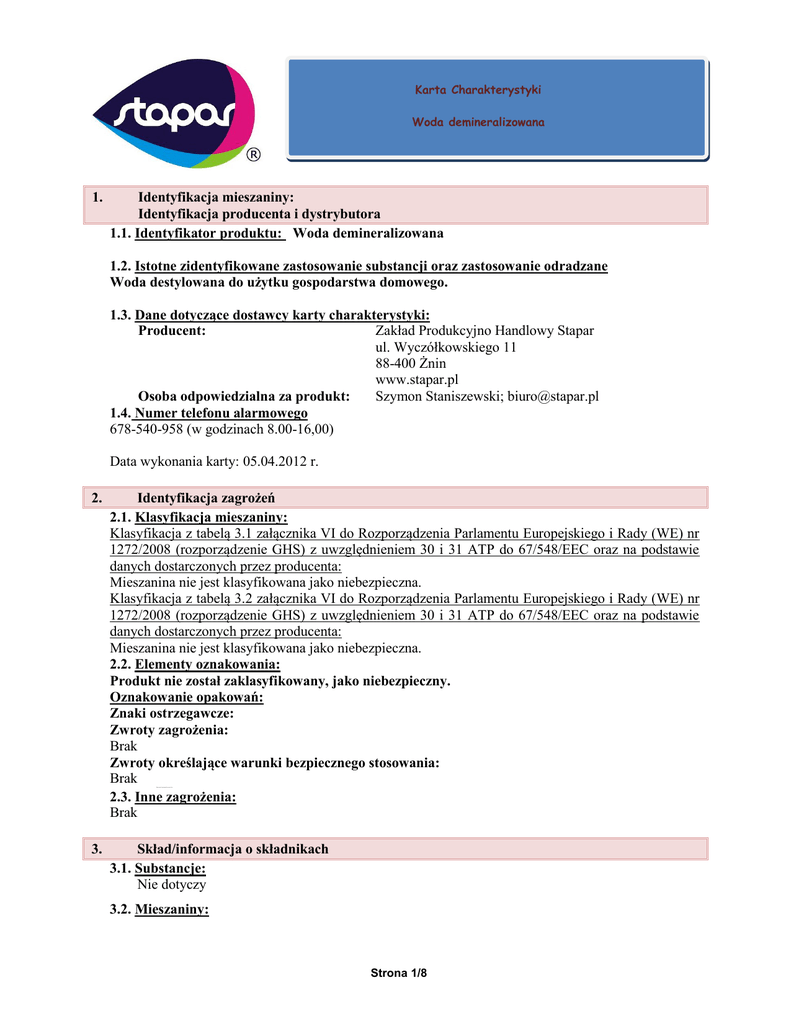 Karta Charakterystyki Woda demineralizowana 1. Identyfikacja mieszaniny: Identyfikacja producenta i dystrybutora 1.1. Identyfikator produktu: Woda demineralizowana 1.2. Istotne zidentyfikowane zastosowanie substancji oraz zastosowanie odradzane Woda destylowana do użytku gospodarstwa domowego. 1.3. Dane dotyczące dostawcy karty charakterystyki: Producent: Zakład Produkcyjno Handlowy Stapar ul. Wyczółkowskiego 11 88-400 Żnin www.stapar.pl Osoba odpowiedzialna za produkt: Szymon Staniszewski; [email protected] 1.4. Numer telefonu alarmowego 678-540-958 (w godzinach 8.00-16,00) Data wykonania karty: 05.04.2012 r. 2. Identyfikacja zagrożeń 2.1. Klasyfikacja mieszaniny: Klasyfikacja z tabelą 3.1 załącznika VI do Rozporządzenia Parlamentu Europejskiego i Rady (WE) nr 1272/2008 (rozporządzenie GHS) z uwzględnieniem 30 i 31 ATP do 67/548/EEC oraz na podstawie danych dostarczonych przez producenta: Mieszanina nie jest klasyfikowana jako niebezpieczna. Klasyfikacja z tabelą 3.2 załącznika VI do Rozporządzenia Parlamentu Europejskiego i Rady (WE) nr 1272/2008 (rozporządzenie GHS) z uwzględnieniem 30 i 31 ATP do 67/548/EEC oraz na podstawie danych dostarczonych przez producenta: Mieszanina nie jest klasyfikowana jako niebezpieczna. 2.2. Elementy oznakowania: Produkt nie został zaklasyfikowany, jako niebezpieczny. Oznakowanie opakowań: Znaki ostrzegawcze: Zwroty zagrożenia: Brak Zwroty określające warunki bezpiecznego stosowania: Brak 2.3. Inne zagrożenia: Brak Zawartość /pojemnik u suwać d o 3. Skład/informacja o składnikach 3.1. Substancje: Nie dotyczy 3.2. Mieszaniny: Strona 1/8 Karta Charakterystyki Woda demineralizowana Nie dotyczy. Klasyfikację substancji zawartych w produkcie podano zgodnie z tabelą 3.1 oraz 3.2 załącznika VI do Rozporządzenia Parlamentu Europejskiego i Rady (WE) nr 1272/2008 (rozporządzenie GHS) z uwzględnieniem 30 i 31 ATP do 67/548/EEC oraz na podstawie danych dostarczonych przez producenta. Nie zawiera substancji klasyfikowanych jako niebezpieczne. 4. Środki pierwszej pomocy 4.1. Opis środków pierwszej pomocy: 4.1.1 Wytyczne dotyczące pierwszej pomocy wg istotnych dróg narażenia: Kartę Charakterystyki okazać lekarzowi udzielającemu pomocy. W przypadku narażenia na pary i aerozole produktu osobę poszkodowaną przenieść do dobrze wentylowanego pomieszczenia zwrócić się o pomoc lekarską a) drogi oddechowe: nie stwarza zagrożenia b) skóra: nie stwarza zagrożenia c) oczy: nie stwarza zagrożenia d) przewód pokarmowy: nie stwarza zagrożenia, jednak nie należy pić wody destylowanej, gdyż w dużych ilościach zaburza to gospodarkę jonową organizmu 4.1.2. Inne: Brak. 4.2. Najważniejsze ostre i opóźnione objawy oraz skutki narażenia: Objawy ostre: Brak Objawy opóźnione: Brak. 4.3. Wskazania dotyczące wszelkiej natychmiastowej pomocy lekarskiej i szczególnego postępowania z poszkodowanym: W przypadku spożycia lub dostania się produktu do oczu należy niezwłocznie skonsultować się z lekarzem. 5. Postępowanie w przypadku pożaru 5.1. Środki gaśnicze: a) Zalecane środki gaśnicze: Nie stwarza zagrożenia pożarem b) Niezalecane środki gaśnicze: Nie stwarza zagrożenia pożarem 5.2. Szczególne zagrożenia związane z substancją: Wydziela toksyczne gazy w warunkach pożaru. 5.3. Informacje dla straży pożarnej: Należy nosić niezależny aparat do oddychania i odpowiednią odzież ochronną. 6. Postępowanie w przypadku niezamierzonego uwolnienia do środowiska 6.1. Indywidualne środki ostrożności, wyposażenie ochronne i procedury w sytuacjach awaryjnych: 6.1.1. Dla osób nienależących do personelu udzielającego pomocy: - brak wymagań Strona 2/8 Karta Charakterystyki Woda demineralizowana 6.1.2. Dla osób udzielających pomocy: - brak wymagań 6.2. Środki ostrożności w zakresie ochrony środowiska: - w przypadku uwolnienia dużych ilości do wód lub gleby zawiadomić o awarii odpowiednie służby 6.3. Metody i materiały zapobiegające rozprzestrzenianiu się skażenia i służące do usuwania skażenia: 6.3.1. Zalecenia dotyczące zapobiegania rozprzestrzeniania się wycieku: - przechowywać i transportować w szczelnych opakowaniach - niezwłocznie usunąć produkt 6.3.2. Zalecenia dotyczące likwidacji wycieku: - mały wyciek zetrzeć mopem, szmatą lub ręcznikiem papierowym - absorbować niepalnym materiałem chłonnym (np. ziemia okrzemkowa) 6.3.3. Inne informacje: Brak 6.4. Odniesienia do innych sekcji: Patrz informacje zawarte w sekcji 8 i 13. 7. Postępowanie z produktem i jego magazynowanie 7.1. Środki ostrożności dotyczące bezpiecznego postępowania: 7.1.1. Zalecenia ogólne: - postępować zgodnie z ogólnymi zasadami bezpieczeństwa i higieny pracy z substancjami chemicznymi oraz dobrej praktyki przemysłowej; ściśle przestrzegać opracowanych procedur postępowania; podczas pracy z produktem należy stosować ogólne przepisy bezpieczeństwa i higieny pracy zawarte w Rozporządzeniu Ministra Pracy i Polityki Społecznej z dnia 30 grudnia 2004r. (Dz. U. Nr 11 z 2005r. poz. 86); przestrzegać zaleceń zawartych w instrukcji dostarczonej przez producenta 7.1.2. Wskazówki dotyczące higieny pracy: - przestrzegać zasad higieny osobistej 7.2. Warunki bezpiecznego magazynowania, łącznie z informacjami dotyczącymi wszelkich wzajemnych niezgodności: - produkt magazynować w chłodnych, suchych i dobrze wentylowanych pomieszczeniach - zabezpieczyć opakowania przed mechanicznym uszkodzeniem 7.3. Szczególne zastosowania końcowe: Brak. 8. Kontrola narażenia i środki ochrony indywidualnej 8.1. Parametry dotyczące kontroli: 8.1.1. Najwyższe dopuszczalne stężenia w środowisku pracy: Wg Rozporządzenia Ministra Pracy i Polityki Społecznej z dnia 29 listopada 2002r. (Dz. U. Nr 217 poz. 1833) ze zmianami (Dz. U. Nr 212 poz. 1769 z 2005r.; Dz. U. Nr 161 poz. 1141, 1142 z 2007 r.; Dz. U. Nr 105 poz. 873 z 2009 r.; Dz. U. nr 141 poz. 950 z 2010 r.; Dz.U. Nr. 274 poz.1621 z 20
