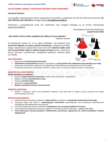 Oferta szkolenia otwartego w Human Skills: JAK SIĘ DOBRZE UBIERAĆ I ŚWIADOMIE KREOWAĆ SWÓJ WIZERUNEK? Szanowni Państwo, w przypadku zainteresowania ofertą zapraszamy do kontaktu w godzinach od 8:30 do 16:30 pod numerem tel. (22) 2242195, (22) 2242196 lub drogą mailową [email protected] Informacje o prowadzonych przez nas szkoleniach oraz usługach dostępne są na stronie internetowej www.humanskills.pl Pozostajemy do Państwa dyspozycji, zespół Human Skills „Aby odnieść sukces należy wyglądać tak, jakby już się go odniosło.” Valentin Polcuch W dzisiejszych czasach to, co na siebie zakładamy i jak kreujemy nasz wizerunek wpływa na ocenę naszych kompetencji i zasobności portfela. Znając najważniejsze zasady dress codu oraz tricki stylistów każdy może stać się pewniejszy siebie w każdej sytuacji życiowej, jak np. rozmowa o pracę, rozmowa z przełożonym, wystąpienia publiczne, rodzinny obiad czy randka. CELE SZKOLENIA Wyjaśnienie zasad kreowania wizerunku, Indywidualne przedstawienie każdemu uczestnikowi, w jaki sposób może podkreślić swoją sylwetkę oraz urodę, Zapoznanie uczestników z kolorami oraz objaśnienie zasad dobierania poszczególnych barw do siebie, Przekazanie informacji o aktualnych trendach, a także o tym, co można a czego nie należy ze sobą łączyć. KORZYŚCI DLA UCZESTNIKÓW Dzięki udziałowi w spotkaniu: Poznasz zasady kreowania wizerunku w swoim życiu prywatnym i zawodowym, Będziesz wiedzieć jak podkreślać urodę,, Uzyskasz pewność siebie, Skorzystasz z porad stylistów, Będziesz świadomie kreować swój wizerunek. ADRESACI SZKOLENIA Kobiety i mężczyźni, którzy chcą świadomie budować swój wizerunek w każdej sytuacji życiowej oraz unikać wizerunkowych faux-pas. METODA SZKOLENIOWA 1. 2. 3. 4. 5. Szkolenie będzie prowadzone zgodnie z cyklem Kolba oraz zgodnie z metodą ABL (Activity Based Learning). Uczestnicy będą brali udział w aktywizujących ćwiczeniach indywidualnych oraz grupowych poprzedzonych niezbędnym wprowadzeniem teoretycznym. Uczestnicy będą mieli również możliwość autodiagnozy oraz otrzymają feedback od trenera. Trener będzie przedstawiał merytorykę zgodnie z 3 kanałami przekazu informacji – wzrok, ruch, słuch. Panel dyskusyjny, ćwiczenia grupowe i indywidualne, prezentacja, odgrywanie ról, analiza przypadków i filmów poglądowych. 1 Oferta szkolenia otwartego w Human Skills: JAK SIĘ DOBRZE UBIERAĆ I ŚWIADOMIE KREOWAĆ SWÓJ WIZERUNEK? PROGRAM Dzięki udziałowi w spotkaniu poznasz zasady kreowania wizerunku w biznesie oraz w życiu prywatnym. Będziesz wiedzieć jak podkreślać atuty sylwetki i Twojego typu urody. Poznasz zasady budowania garderoby biznesowej. Uzyskasz pewność siebie poprzez poznanie zasad odpowiedniego komponowania zestawów, biorąc pod uwagę dobór tkanin, dodatków, odpowiednich metek. Zrozumiesz, jak Twoje ubranie wpływa na Twoją mowę ciała, jak oddziałujesz na innych. Będziesz wiedział jak można wyglądać formalnie, nie rezygnując z własnych upodobań. Zrozumiesz co mówią określone kolory. Skorzystasz z porad stylistów. Uzyskasz informacje o aktualnie obowiązujących trendach. Zaoszczędzisz wydatków na zbędne stroje i dodatki. Będziesz świadomie kreował swój wizerunek. Dodatkowo podczas zajęć otrzymasz materiały szkoleniowe, dzięki którym będziesz mógł przypomnieć sobie po szkoleniu zdobytą wiedzę. INDYWIDUALNE KONSULTACJE WIZERUNKOWE – polecamy również skorzystanie z indywidualnych konsultacji jako dopełnienia warsztatów bądź niezależnego spotkania w trakcie którego trenerzy omówią z Tobą wszystkie Twoje potrzeby i zaprezentują rozwiązania specjalnie dla Ciebie – cena 120 zł/h. TRENER Małgorzata Karczewska Psycholog/Trener Trener umiejętności osobistych, psycholog, asesor. Prowadzi szkolenia i warsztaty z zakresu rozwoju osobistego (m. in. technik kreatywnego myślenia, budowania pewności siebie, komunikacji interpersonalnej). Doradza w zakresie kreowania wizerunku w biznesie i w życiu prywatnym. Współtworzy i koordynuje projekt dedykowany kobietom pragnącym pracować nad rozwojem osobistym i psychologią wyglądu – Sensualna Kobieta Biznesu. Pracując z kobietami przy projektach rozwojowych miała możliwość poznania ich potrzeb związanych z wyglądem zewnętrznym, poczuciem własnej wartości i procesami związanymi z rozwojem osobistym. Wspiera osoby mające trudności w relacjach interpersonalnych, cierpiące na brak zadowolenia z siebie i swojego życia. Uczy wzmacniać poczucia pewności siebie i towarzyszy swoim Klientom w procesie kształtowania własnej pozytywnej samooceny. Związana z Ogólnopolską Otwartą Grupą Niezależnych Filmowców – Weź To Nakręć, z którą współpracuje w zakresie prowadzenia spotkań dotyczących kreatywności, motywowania i pracy zespołowej. Można ją również usłyszeć w Polskim Radiu Czwórka, gdzie wypowiada się jako psycholog. Wybrani Klienci Trenera: Mc Donald’s Polska Sp. z o.o., Ministerstwo Obrony Narodowej, Urząd ds. Cudzoziemców, Warmińsko-Mazurska Okręgowa Izba Inżynierów Budownictwa, TUI Poland Sp. z o.o., Telbridge Sp. z o.o., Grupa Pracuj Solutions, 4MAT Agencja Reklamowo – Promocyjna, Essilor Optical Laboratory Polska – indywidualne konsultacje wizerunkowe z pracownikami Firmy na szczeblu menedżerskim, Open Finance S.A., Ogólnopolska Otwarta Grupa Niezależnych Filmowców – Weź To Nakręć, Centrum Artystyczne Fabryka Trzciny, Szkoła Liderek – konferencja C.U.D., Powiatowe Centrum Pomocy Rodzinie w Płocku, AIESEC Polska, Uczelnia Łazarskiego w Warszawie, Uniwersytet Kardynała Stefana Wyszyńskiego w Warszawie, L.O. nr XXXVII im. J. Dąbrowskiego w Warszawie i inni. 2 Oferta szkolenia otwartego w Human Skills: JAK SIĘ DOBRZE UBIERAĆ I ŚWIADOMIE KREOWAĆ SWÓJ WIZERUNEK? OPINIE Szkolenie krótkie, ale bardzo treściwe. Dowiedziałam się wielu interesujących rzeczy. Pani Gosia t