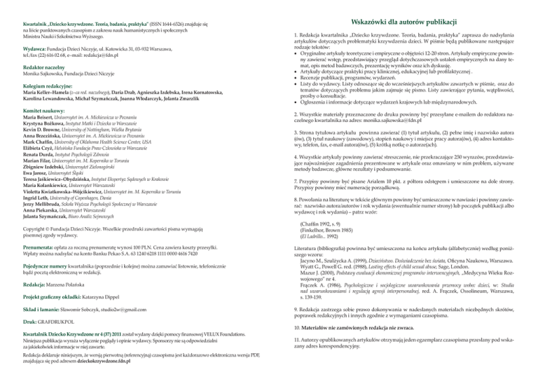 Kwartalnik „Dziecko krzywdzone. Teoria, badania, praktyka” (ISSN 1644-6526) znajduje się na liście punktowanych czasopism z zakresu nauk humanistycznych i społecznych Ministra Nauki i Szkolnictwa Wyższego. Wydawca: Fundacja Dzieci Niczyje, ul. Katowicka 31, 03-932 Warszawa, tel./fax (22) 616 02 68, e–mail: [email protected] Redaktor naczelny Monika Sajkowska, Fundacja Dzieci Niczyje Kolegium redakcyjne: Maria Keller–Hamela (z–ca red. naczelnego), Daria Drab, Agnieszka Izdebska, Irena Kornatowska, Karolina Lewandowska, Michał Szymańczak, Joanna Włodarczyk, Jolanta Zmarzlik Komitet naukowy: Maria Beisert, Uniwersytet im. A. Mickiewicza w Poznaniu Krystyna Bożkowa, Instytut Matki i Dziecka w Warszawie Kevin D. Browne, University of Nottingham, Wielka Brytania Anna Brzezińska, Uniwersytet im. A. Mickiewicza w Poznaniu Mark Chafn, University of Oklahoma Health Science Center, USA Elżbieta Czyż, Helsińska Fundacja Praw Człowieka w Warszawie Renata Durda, Instytut Psychologii Zdrowia Marian Filar, Uniwersytet im. M. Kopernika w Toruniu Zbigniew Izdebski, Uniwersytet Zielonogórski Ewa Jarosz, Uniwersytet Śląski Teresa Jaśkiewicz–Obydzińska, Instytut Ekspertyz Sądowych w Krakowie Maria Kolankiewicz, Uniwersytet Warszawski Violetta Kwiatkowska–Wójcikiewicz, Uniwersytet im. M. Kopernika w Toruniu Ingrid Leth, University of Copenhagen, Dania Jerzy Mellibruda, Szkoła Wyższa Psychologii Społecznej w Warszawie Anna Piekarska, Uniwersytet Warszawski Jolanta Szymańczak, Biuro Analiz Sejmowych Copyright © Fundacja Dzieci Niczyje. Wszelkie przedruki zawartości pisma wymagają pisemnej zgody wydawcy. Prenumerata: opłata za roczną prenumeratę wynosi 100 PLN. Cena zawiera koszty przesyłki. Wpłaty można nadsyłać na konto Banku Pekao S.A. 63 1240 6218 1111 0000 4616 7420 Pojedyncze numery kwartalnika (poprzednie i kolejne) można zamawiać listownie, telefonicznie bądź pocztą elektroniczną w redakcji. Redakcja: Marzena Polańska Projekt graczny okładki: Katarzyna Dippel Skład i łamanie: Sławomir Sobczyk, [email protected] Druk: GRAFDRUKPOL Kwartalnik Dziecko Krzywdzone nr 4 (37) 2011 został wydany dzięki pomocy nansowej VELUX Foundations. Niniejsza publikacja wyraża wyłącznie poglądy i opinie wydawcy. Sponsorzy nie są odpowiedzialni za jakiekolwiek informacje w niej zawarte. Redakcja deklaruje niniejszym, że wersją pierwotną (referencyjną) czasopisma jest każdorazowo elektroniczna wersja PDF, znajdująca się pod adresem dzieckokrzywdzone.fdn.pl Wskazówki dla autorów publikacji 1. Redakcja kwartalnika „Dziecko krzywdzone. Teoria, badania, praktyka” zaprasza do nadsyłania artykułów dotyczących problematyki krzywdzenia dzieci. W piśmie będą publikowane następujące rodzaje tekstów: x Oryginalne artykuły teoretyczne i empiryczne o objętości 12-20 stron. Artykuły empiryczne powinny zawierać wstęp, przedstawiający przegląd dotychczasowych ustaleń empirycznych na dany temat, opis metod badawczych, prezentację wyników oraz ich dyskusję. x Artykuły dotyczące praktyki pracy klinicznej, edukacyjnej lub prolaktycznej . x Recenzje publikacji, programów, wydarzeń. x Listy do wydawcy. Listy odnoszące się do wcześniejszych artykułów zawartych w piśmie, oraz do tematów dotyczących problemu jakim zajmuje się pismo. Listy zawierające pytania, wątpliwości, prośby o konsultacje. x Ogłoszenia i informacje dotyczące wydarzeń krajowych lub międzynarodowych. 2. Wszystkie materiały przeznaczone do druku powinny być przesyłane e-mailem do redaktora naczelnego kwartalnika na adres: [email protected] 3. Strona tytułowa artykułu powinna zawierać (1) tytuł artykułu, (2) pełne imię i nazwisko autora (ów), (3) tytuł naukowy (zawodowy), stopień naukowy i miejsce pracy autora(ów), (4) adres kontaktowy, telefon, fax, e-mail autora(ów), (5) krótką notkę o autorze(ach). 4. Wszystkie artykuły powinny zawierać streszczenie, nie przekraczające 250 wyrazów, przedstawiające najważniejsze zagadnienia prezentowane w artykule oraz omawiany w nim problem, używane metody badawcze, główne rezultaty i podsumowanie. 7. Przypisy powinny być pisane Arialem 10 pkt. z półtora odstępem i umieszczone na dole strony. Przypisy powinny mieć numerację porządkową. 8. Powołania na literaturę w tekście głównym powinny być umieszczone w nawiasie i powinny zawierać: nazwisko autora/autorów i rok wydania (ewentualnie numer strony) lub początek publikacji albo wydawcę i rok wydania) – patrz wzór: (Chafn 1992, s. 9) (Finkelhor, Brown 1985) (El Ladrillo... 1992) Literatura (bibliograa) powinna być umieszczona na końcu artykułu (alfabetycznie) według poniższego wzoru: Jacyno M., Szulżycka A. (1999), Dzieciństwo. Doświadczenie bez świata, Ocyna Naukowa, Warszawa. Wyatt G., Powell G. red. (1988), Lasting effects of child sexual abuse, Sage, London. Mazur J. (2000), Podstawy ewaluacji ekonomicznej programów interwencyjnych, „Medycyna Wieku Rozwojowego” nr 4. Frączek A. (1986), Psychologiczne i socjologiczne uwarunkowania przemocy wobec dzieci, w: Studia nad uwarunkowaniami i regulacją agresji interpersonalnej, red. A. Frączek, Ossolineum, Warszawa, s. 139-159. 9. Redakcja zastrzega sobie prawo dokonywania w nadesłanych materiałach niezbędnych skrótów, poprawek redakcyjnych i innych zgodnie z wymaganiami czasopisma. 10. Materiałów nie zamówionych redakcja nie zwraca. 11. Autorzy opublikowanych artykułów otrzymają jeden egzemplarz czasopisma przesłany pod wskazany adres korespondencyjny.