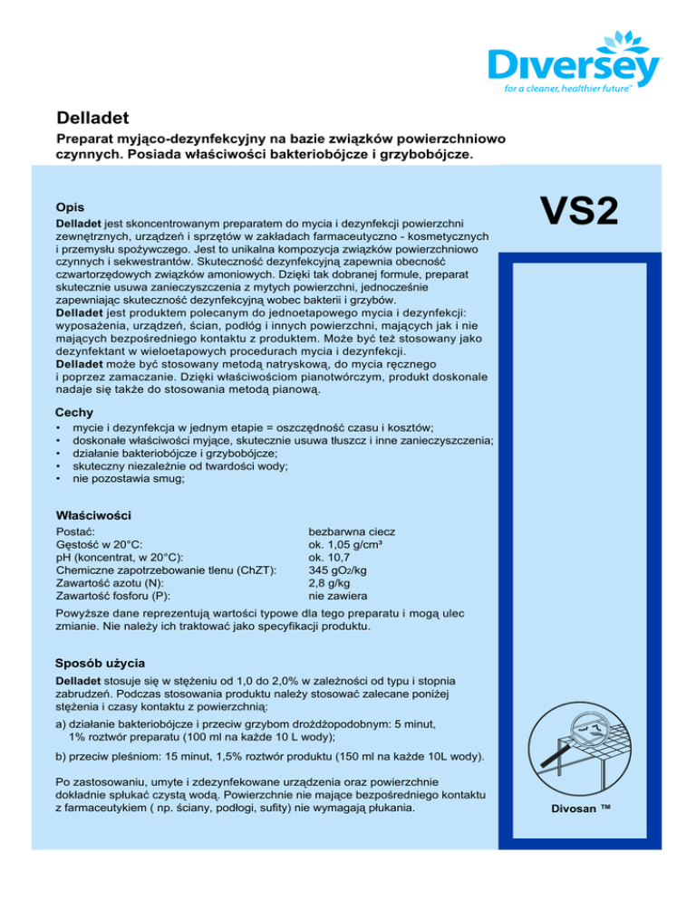 Delladet Preparat myjąco-dezynfekcyjny na bazie związków powierzchniowo czynnych. Posiada właściwości bakteriobójcze i grzybobójcze. Opis Delladet jest skoncentrowanym preparatem do mycia i dezynfekcji powierzchni zewnętrznych, urządzeń i sprzętów w zakładach farmaceutyczno - kosmetycznych i przemysłu spożywczego. Jest to unikalna kompozycja związków powierzchniowo czynnych i sekwestrantów. Skuteczność dezynfekcyjną zapewnia obecność czwartorzędowych związków amoniowych. Dzięki tak dobranej formule, preparat skutecznie usuwa zanieczyszczenia z mytych powierzchni, jednocześnie zapewniając skuteczność dezynfekcyjną wobec bakterii i grzybów. Delladet jest produktem polecanym do jednoetapowego mycia i dezynfekcji: wyposażenia, urządzeń, ścian, podłóg i innych powierzchni, mających jak i nie mających bezpośredniego kontaktu z produktem. Może być też stosowany jako dezynfektant w wieloetapowych procedurach mycia i dezynfekcji. Delladet może być stosowany metodą natryskową, do mycia ręcznego i poprzez zamaczanie. Dzięki właściwościom pianotwórczym, produkt doskonale nadaje się także do stosowania metodą pianową. VS2 Cechy • • • • • mycie i dezynfekcja w jednym etapie = oszczędność czasu i kosztów; doskonałe właściwości myjące, skutecznie usuwa tłuszcz i inne zanieczyszczenia; działanie bakteriobójcze i grzybobójcze; skuteczny niezależnie od twardości wody; nie pozostawia smug; Właściwości Postać: Gęstość w 20°C: pH (koncentrat, w 20°C): Chemiczne zapotrzebowanie tlenu (ChZT): Zawartość azotu (N): Zawartość fosforu (P): bezbarwna ciecz ok. 1,05 g/cm³ ok. 10,7 345 gO2/kg 2,8 g/kg nie zawiera Powyższe dane reprezentują wartości typowe dla tego preparatu i mogą ulec zmianie. Nie należy ich traktować jako specyfikacji produktu. Sposób użycia Delladet stosuje się w stężeniu od 1,0 do 2,0% w zależności od typu i stopnia zabrudzeń. Podczas stosowania produktu należy stosować zalecane poniżej stężenia i czasy kontaktu z powierzchnią: a) działanie bakteriobójcze i przeciw grzybom drożdżopodobnym: 5 minut, 1% roztwór preparatu (100 ml na każde 10 L wody); b) przeciw pleśniom: 15 minut, 1,5% roztwór produktu (150 ml na każde 10L wody). Po zastosowaniu, umyte i zdezynfekowane urządzenia oraz powierzchnie dokładnie spłukać czystą wodą. Powierzchnie nie mające bezpośredniego kontaktu z farmaceutykiem ( np. ściany, podłogi, sufity) nie wymagają płukania. Divosan ™ Delladet Uwaga: Produkt przeznaczony do profesjonalnego stosowania. Dokładny sposób użycia preparatu, dostosowany do Państwa potrzeb, określi nasz przedstawiciel handlowy. Atesty, pozwolenia, opinie • preparat Delladet uzyskał pozwolenie Ministra Zdrowia nr 3547/08 na obrót produktem biobójczym; Informacje dotyczące skuteczności mikrobiologicznej • dostępne na życzenie Klienta. Metody oznaczania stężenia preparatu w roztworach roboczych oraz pozostałości preparatu po procesie mycia: • dostępne na życzenie Klienta. Dodatkowe informacje odnośnie do środków ostrożności wymaganych przy pracy z preparatem Delladet, ubocznych skutków stosowania, zasad udzielania pierwszej pomocy, bezpiecznego postępowania z odpadami produktu i opakowaniem znajdują się w karcie charakterystyki. Diversey Polska Sp. z o.o. ul. Fabryczna 5 00-446 Warszawa Tel.: 22 328 10 00 Fax: 22 328 10 01 www.diversey.com © Copyright 2012 Diversey 2