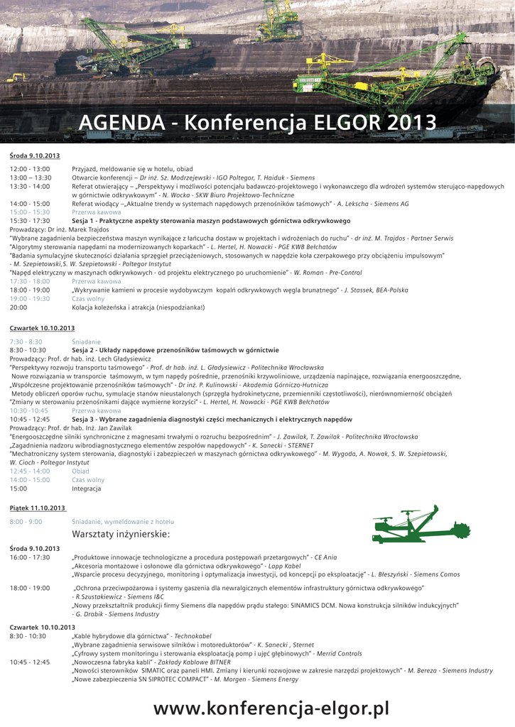 AGENDA - Konferencja ELGOR 2013 Środa 9.10.2013 12:00 - 13:00 Przyjazd, meldowanie się w hotelu, obiad 13:00 – 13:30 Otwarcie konferencji – Dr inż. Sz. Modrzejewski - IGO Poltegor, T. Haiduk - Siemens 13:30 - 14:00 Referat otwierający – „Perspektywy i możliwości potencjału badawczo-projektowego i wykonawczego dla wdrożeń systemów sterująco-napędowych w górnictwie odkrywkowym” - N. Wocka - SKW Biuro Projektowo-Techniczne 14:00 - 15:00 Referat wiodący –„Aktualne trendy w systemach napędowych przenośników taśmowych” - A. Lekscha - Siemens AG 15:00 - 15:30 Przerwa kawowa 15:30 - 17:30 Sesja 1 - Praktyczne aspekty sterowania maszyn podstawowych górnictwa odkrywkowego Prowadzący: Dr inż. Marek Trajdos “Wybrane zagadnienia bezpieczeństwa maszyn wynikające z łańcucha dostaw w projektach i wdrożeniach do ruchu” - dr inż. M. Trajdos - Partner Serwis “Algorytmy sterowania napędami na modernizowanych koparkach” - L. Hertel, H. Nowacki - PGE KWB Bełchatów “Badania symulacyjne skuteczności działania sprzęgieł przeciążeniowych, stosowanych w napędzie koła czerpakowego przy obciążeniu impulsowym” - M. Szepietowski,S. W. Szepietowski - Poltegor Instytut “Napęd elektryczny w maszynach odkrywkowych - od projektu elektrycznego po uruchomienie” - W. Roman - Pre-Control 17:30 - 18:00 Przerwa kawowa 18:00 - 19:00 „Wykrywanie kamieni w procesie wydobywczym kopalń odkrywkowych węgla brunatnego“ - J. Stassek, BEA-Polska 19:00 - 19:30 Czas wolny 20:00 Kolacja koleżeńska i atrakcja (niespodzianka!) Czwartek 10.10.2013 7:30 - 8:30 Śniadanie 8:30 - 10:30 Sesja 2 - Układy napędowe przenośników taśmowych w górnictwie Prowadzący: Prof. dr hab. inż. Lech Gładysiewicz “Perspektywy rozwoju transportu taśmowego” - Prof. dr hab. inż. L. Gładysiewicz - Politechnika Wrocławska Nowe rozwiązania w transporcie taśmowym, w tym napędy pośrednie, przenośniki krzywoliniowe, urządzenia napinające, rozwiązania energooszczędne, „Współczesne projektowanie przenośników taśmowych” - Dr inż. P. Kulinowski - Akademia Górniczo-Hutnicza Metody obliczeń oporów ruchu, symulacje stanów nieustalonych (sprzęgła hydrokinetyczne, przemienniki częstotliwości), nierównomierność obciążeń “Zmiany w sterowaniu przenośnikami dające wymierne korzyści” - L. Hertel, H. Nowacki - PGE KWB Bełchatów 10:30 -10:45 Przerwa kawowa 10:45 - 12:45 Sesja 3 - Wybrane zagadnienia diagnostyki części mechanicznych i elektrycznych napędów Prowadzący: Prof. dr hab. Inż. Jan Zawilak “Energooszczędne silniki synchroniczne z magnesami trwałymi o rozruchu bezpośrednim” - J. Zawilak, T. Zawilak - Politechnika Wrocławska „Zagadnienia nadzoru wibrodiagnostycznego elementów zespołów napędowych” - K. Sanecki - STERNET “Mechatroniczny system sterowania, diagnostyki i zabezpieczeń w maszynach górnictwa odkrywkowego‘’ - M. Wygoda, A. Nowak, S. W. Szepietowski, W. Cioch - Poltegor Instytut 12:45 - 14:00 Obiad 14:00 - 15:00 Czas wolny 15:00 Integracja Piątek 11.10.2013 8:00 - 9:00 Śniadanie, wymeldowanie z hotelu Warsztaty Środa 9.10.2013 16:00 - 17:30 inżynierskie: „Produktowe innowacje technologiczne a procedura postępowań przetargowych” - CE Ania „Akcesoria montażowe i osłonowe dla górnictwa odkrywkowego” - Lapp Kabel „Wsparcie procesu decyzyjnego, monitoring i optymalizacja inwestycji, od koncepcji po eksploatację” - L. Błeszyński - Siemens Comos 18:00 - 19:00 „Ochrona przeciwpożarowa i systemy gaszenia dla newralgicznych elementów infrastruktury górnictwa odkrywkowego” - R.Szustakiewicz - Siemens I&C „Nowy przekształtnik produkcji firmy Siemens dla napędów prądu stałego: SINAMICS DCM. Nowa konstrukcja silników indukcyjnych” - G. Drabik - Siemens Industry Czwartek 10.10.2013 8:30 - 10:30 „Kable hybrydowe dla górnictwa” - Technokabel „Wybrane zagadnienia serwisowe silników i motoreduktorów” - K. Sanecki , Sternet „Cyfrowy system monitoringu i sterowania eksploatacją pomp i ujęć głębinowych” - Merrid Controls 10:45 - 12:45 „Nowoczesna fabryka kabli” - Zakłady Kablowe BITNER „Nowości sterowników SIMATIC oraz paneli HMI. Zmiany i kierunki rozwojowe w zakresie narzędzi projektowych” - M. Bereza - Siemens Industry „Nowe zabezpieczenia SN SIPROTEC COMPACT” - M. Morgen - Siemens Energy www.konferencja-elgor.pl