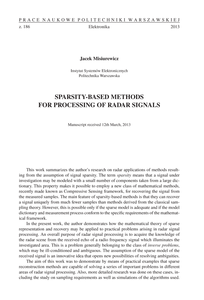 z. 186 6 The ideas and methods were verified with the use of live recorded signals wherever possible. In the examples presented in this work, sparsity of the signal model is the key assumption to enable the solution of relevant inverse problems. The application areas described here are closely related to the author’s experience with existing radar systems, including those currently under research or development at the Warsaw University of Technology. They cover a wide range of radar types and processing modes, including active and passive radars as well as surveillance and imaging ones. The author proposed applications of sparsity-based methods for active radars with a noise waveform, for classical MTI radars, and for imaging radars, using either the synthetic aperture (SAR) technique with noise illumination, or the inverse synthetic aperture (ISAR) technique with passive illumination from a GSM transmitter. Streszczenie ZASTOSOWANIA METOD OPARTYCH NA RZADKIEJ REPREZENTACJI SYGNAŁU DO PRZETWARZANIA SYGNAŁÓW RADIOLOKACYJNYCH Praca podsumowuje badania autora na temat radiolokacyjnego zastosowania nowatorskich metod wynikających z założenia o rzadkim modelu sygnału. Pojęcie to oznacza, że dany sygnał może być modelowany jako liniowa kombinacja niewielkiej liczby składowych należących do pewnego, z założenia pojemnego, słownika. Przyjęcie tego założenia otwiera możliwość zastosowania nowej klasy metod matematycznych, znanych od niedawna pod wspólna nazwą “Compressive Sensing” (po polsku ostatnio używa się określenia “oszczędne próbkowanie”), do odtworzenia sygnału ze zmierzonych próbek. Najważniejszą cechą tych metod jest możliwość odtworzenia sygnału ze znacznie mniejszej liczby próbek niż wynikałoby to z założeń metod klasycznych (opartych na twierdzeniu o próbkowaniu). Należy jednak podkreślić, że jest to możliwe tylko pod warunkiem adekwatności modelu rzadkiego oraz spełnienia pewnych wymagań przez słownik oraz przez proces pomiaru, zgodnie z teorią matematyczną oszczędnego próbkowania. W przedstawionej pracy autor pokazuje, w jaki sposób rzadki model sygnału i matematyczna teoria oszczędnego próbkowania mogą być użyte w zagadnieniach praktycznie występujących w radiolokacji. Ogólnym celem przetwarzania sygnałów radiolokacyjnych jest uzyskanie wiedzy o oświetlanej scenie poprzez badanie sygnału radiowego od tej sceny odbitego. Jest to problem z dziedziny zagadnień odwrotnych (inverse problems), i jako taki może być źle uwarunkowany i nie mieć jednoznacznego rozwiązania. Ograniczenie swobody szukanego rozwiązania poprzez przyjęcie rzadkiego modelu otwiera nowe możliwości usunięcia niejednoznaczności wyniku. Autor zaproponował w pracy wykorzystanie metod opartych na rzadkiej reprezentacji sygnału do modelowania silnych ech w celu usunięcia ich wpływu na proces detekcji ech słabych, zwanego efektem maskowania. Ma to zastosowanie w aktywnych radarach z oświetleniem szumowym i w radarach pasywnych. Autor badał kilka algorytmów w aspekcie modelowania ech złożonych, wskazał przyczyny niepowodzenia algorytmu kolejnego usuwania składowych i zaproponował w zamian algorytm modelowania łącznego ograniczonej liczby składowych. Kolejne zaproponowane przez autora rozwiązanie przeznaczone jest dla szumowego radaru z syntetyczną aperturą (SAR). Pozwala ono zmniejszyć znacznie liczbę pobieranych próbek w wymiarze przestrzennym a zatem i łączny czas akwizycji sygnału. Zastosowanie rzadkiego modelu sygnału pozwoliło rozwikłać niejednoznaczność odtworzenia obrazu sceny radarowej powstałą wskutek zmniejszenia częstości próbkowania poniżej granicy Nyquista. Rozwiązanie zostało przebadane w symulacjach i w eksperymentach z wykorzystaniem zarejestrowanych rzeczywistych sygnałów. W zastosowaniu do klasycznych radarów MTI, autor zaproponował zastosowanie rzadkiego modelu sygnału w dziedzinie częstotliwości w celu zwiększenia zdolności pomiaru prędkości kilku obiektów znajdujących się w tej samej odległości od radaru. 134 Streszczenie Następne zaproponowane przez autora rozwiązanie dotyczy estymacji wysokości w radarze pasywnym. Na przykładzie radaru pasywnego pracującego z wykorzystaniem nadajnika telewizji cyfrowej DVB-T autor pokazał, że metody oszczędnego próbkowania pozwalają na rozdzielenie ech obiektu propagujących z i bez odbicia od ziemi. Dysponując pomiarami opóźnienia ech wzdłuż różnych dróg propagacji można określić wysokość obiektu. Jest to istotna innowacja wobec faktu, że określenie wysokości poprzez pomiar kąta przyjścia sygnału jest bardzo trudne przy typowych rozmiarach anten dla pasma telewizji cyfrowej. Przy pracy radaru pasywnego z wykorzystaniem niewielkiej liczby nadajników uzyskanie niezależnego pomiaru wysokości obiektu znacząco poprawia jakość lokalizacji obiektu w przestrzeni trójwymiarowej. Rozpatrując zagadnienie obrazowania obiektów ruchomych w radarze pasywnym wykorzystującym nadajnik GSM, autor zaproponował metodę uzyskiwania wyraźnego obrazu w technice ISAR (odwrotnej syntetycznej apertury), korzystając z faktu, że ruchomy obiekt przy obrazowaniu ISAR może być uważany za zbiór niewielu punktów odbijających, poruszających się w jednolity sposób. Zastosowanie tej metody pozwoliło z rzeczywistych, zarejestrowanych sygnałów uzyskać obraz ISAR jadącego pojazdu. Klasyczne metody oparte na filtracji dopasowanej w tej samej sytuacji zawiodły, gdyż cały obserwowany obiekt był mniejszy niż rozmiar komórki rozdzielczości odległościowej, który wynika z szerokości pasma sygnału. W opisanych przez autora przykładach zastosowań rzadkość modelu jest kluczowym założeniem przy rozwiązywaniu postawionych zagadnień odwrotnych. Przykłady dotyczą obszarów zastosowań ściśle związanych z długoletnim doświadczeniem autora w projektowaniu i konstruowaniu urządzeń radarowy