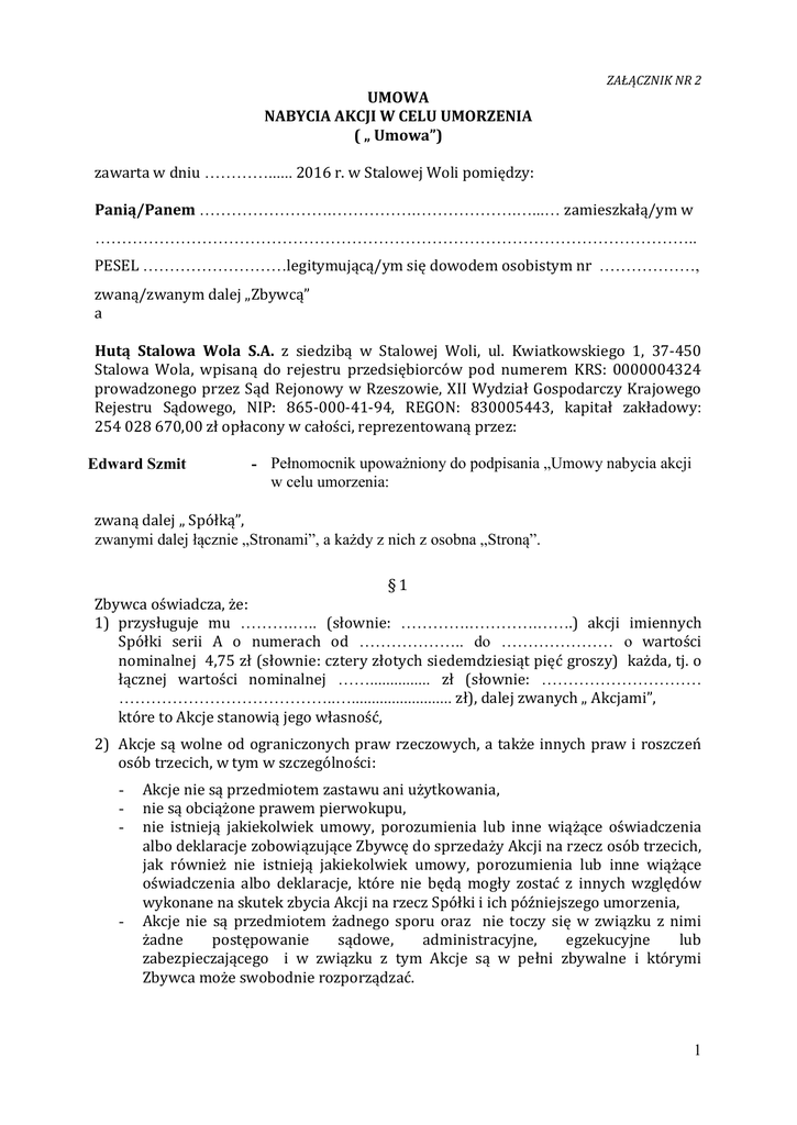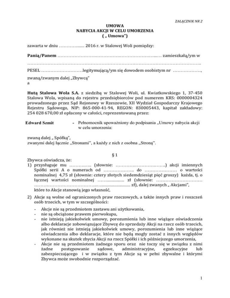 UMOWA NABYCIA AKCJI W CELU UMORZENIA ( „ Umowa”) ZAŁĄCZNIK NR 2 zawarta w dniu …………...... 2016 r. w Stalowej Woli pomiędzy: Panią/Panem …………………….…………….……………….…...… zamieszkałą/ym w ………………………………………………………………………………………………….. PESEL ………………………legitymującą/ym się dowodem osobistym nr ………………, zwaną/zwanym dalej „Zbywcą” a Hutą Stalowa Wola S.A. z siedzibą w Stalowej Woli, ul. Kwiatkowskiego 1, 37-450 Stalowa Wola, wpisaną do rejestru przedsiębiorców pod numerem KRS: 0000004324 prowadzonego przez Sąd Rejonowy w Rzeszowie, XII Wydział Gospodarczy Krajowego Rejestru Sądowego, NIP: 865-000-41-94, REGON: 830005443, kapitał zakładowy: 254 028 670,00 zł opłacony w całości, reprezentowaną przez: Edward Szmit - Pełnomocnik upoważniony do podpisania „Umowy nabycia akcji w celu umorzenia: zwaną dalej „ Spółką”, zwanymi dalej łącznie „Stronami”, a każdy z nich z osobna „Stroną”. §1 Zbywca oświadcza, że: 1) przysługuje mu ……….….. (słownie: ………….………….…….) akcji imiennych Spółki serii A o numerach od ……………….. do ………………… o wartości nominalnej 4,75 zł (słownie: cztery złotych siedemdziesiąt pięć groszy) każda, tj. o łącznej wartości nominalnej ……............... zł (słownie: ………………………… …………………………………..…......................... zł), dalej zwanych „ Akcjami”, które to Akcje stanowią jego własność, 2) Akcje są wolne od ograniczonych praw rzeczowych, a także innych praw i roszczeń osób trzecich, w tym w szczególności: - - Akcje nie są przedmiotem zastawu ani użytkowania, nie są obciążone prawem pierwokupu, nie istnieją jakiekolwiek umowy, porozumienia lub inne wiążące oświadczenia albo deklaracje zobowiązujące Zbywcę do sprzedaży Akcji na rzecz osób trzecich, jak również nie istnieją jakiekolwiek umowy, porozumienia lub inne wiążące oświadczenia albo deklaracje, które nie będą mogły zostać z innych względów wykonane na skutek zbycia Akcji na rzecz Spółki i ich późniejszego umorzenia, Akcje nie są przedmiotem żadnego sporu oraz nie toczy się w związku z nimi żadne postępowanie sądowe, administracyjne, egzekucyjne lub zabezpieczającego i w związku z tym Akcje są w pełni zbywalne i którymi Zbywca może swobodnie rozporządzać. 1 §2 Spółka oświadcza, że Nadzwyczajne Walne Zgromadzenie w dniu 4 grudnia 2015 r. podjęło uchwałę nr 5, na mocy której Nadzwyczajne Walne Zgromadzenie Spółki wyraziło zgodę na nabycie w celu umorzenia Akcji pracowniczych, określiło warunki nabycia tych akcji, w tym wysokość wynagrodzenia akcjonariuszy umarzanych akcji oraz udzieliło upoważnienia Zarządowi Spółki do nabycia od uprawnionych akcjonariuszy akcji w celu ich umorzenia i oświadcza, iż uchwała została powzięta prawidłowo, nie utraciła mocy ani nie została zmieniona, a nadto uprawnia Spółkę do nabycia Akcji od Akcjonariusza na warunkach określonych w niniejszej Umowie. §3 1. Zbywca zbywa Spółce wszystkie przysługujące mu Akcje, o których mowa w § 1 pkt 1 i wyraża zgodę na ich dobrowolne umorzenie za wynagrodzeniem, a Spółka niniejszym nabywa przedmiotowe Akcje w celu ich umorzenia w drodze obniżenia kapitału zakładowego Spółki. 2. Spółka zapłaci Zbywcy wynagrodzenie w wysokości 9,02 zł (dziewięć złotych dwa grosze) za jedną Akcję. Za wszystkie zbyte przez Zbywcę Akcje wymienione w ust. 1 Spółka zapłaci wynagrodzenie w łącznej kwocie ……………. zł (słownie: ……………………..……………………………...), dalej zwanym „Wynagrodzeniem”. §4 Zbywca przy podpisaniu niniejszej Umowy wydaje Spółce posiadany dokument Akcji/odcinek zbiorowy Akcji, a Spółka potwierdza jego otrzymanie. §5 Zbywca oświadcza, że na podstawie art. 339 Kodeksu spółek handlowych przenosi niniejszą Umową na Spółkę posiadanie Akcji, o których mowa w § 1 pkt. 1, wraz ze wszystkimi wynikającymi z nich prawami i obowiązkami. §6 1. Spółka zapłaci Zbywcy Wynagrodzenie, o którym mowa w § 3 ust. 2, tj. kwotę ………………. zł przelewem na rachunek bankowy wskazany przez Zbywcę lub gotówką w kasie Spółki, w terminie do 14 dni od dnia podpisania niniejszej Umowy i złożenia Akcji w Biurze Zarządu i Infrastruktury HSW S.A. 2. W przypadku żądania zapłaty przelewem Zbywca wskazuje rachunek bankowy nr §7 Wynagrodzenie zostanie wypłacone Zbywcy ze środków pochodzących z kapitału rezerwowego utworzonego z zysku Spółki, na podstawie uchwały nr 6 Zwyczajnego Walnego Zgromadzenia z dnia 29 czerwca 2015 roku w sprawie przekazania zysku netto za 2014 r. oraz niepodzielonego zysku netto z lat ubiegłych na kapitał rezerwowy z przeznaczeniem na sfinansowanie wykupu akcji mniejszościowych akcjonariuszy celem ich dobrowolnego umorzenia. §8 Żadna ze stron nie może przenieść praw i obowiązków wynikających z niniejszej Umowy na osobę trzecią bez uprzedniej pisemnej zgody drugiej Strony. 2 §9 1. Niniejsza Umowa podlega prawu polskiemu i powinna być zgodnie z nim interpretowana. 2. W sprawach nieuregulowanych w Umowie zastosowanie mają odpowiednie przepisy Kodeksu spółek handlowych i Kodeksu cywilnego. 3. Wszelkie zmiany, uzupełnienia lub innego rodzaju zmiany warunków lub postanowień niniejszej Umowy wymagają formy pisemnej pod rygorem nieważności. 4. Wszelkie spory wynikające z lub powstałe w związku z wykonaniem lub interpretacją niniejszej Umowy będą rozstrzygane przez sąd powszechny właściwy dla siedziby Spółki. 5. Ewentualne koszty związane z zawarciem Umowy, w tym podatek od czynności cywilnoprawnych ponosi Spółka. § 10 Zbywca oświadcza, że został poinformowany przez Spółkę, że dochód ze sprzedaży Akcji podlega op