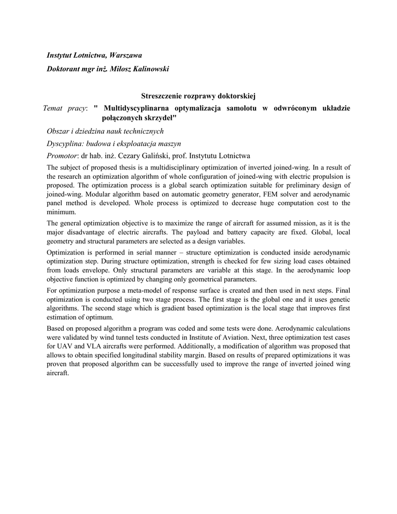Instytut Lotnictwa, Warszawa Doktorant mgr inż. Miłosz Kalinowski