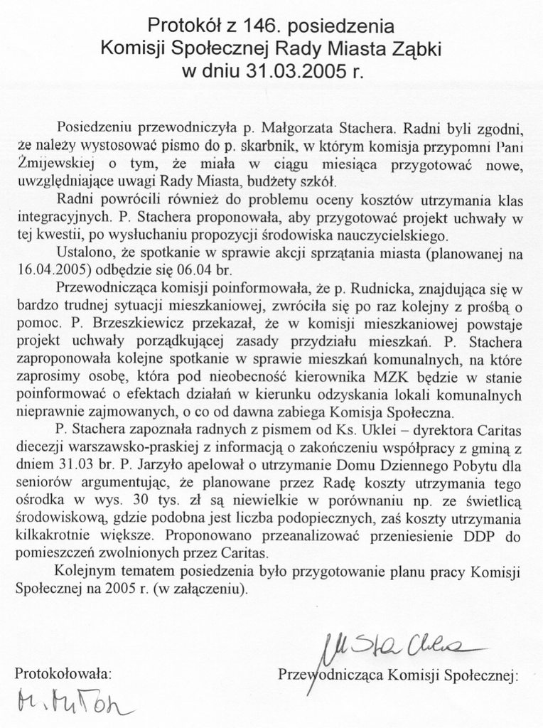 Protokólz 146. posiedzenia KomisjiSpolecznejRady MiastaZabki w dniu31.03.2005 r. Posiedzeniu przewodniczyla p. Malgorzata Stachera. Radni byli zgodni, ze nalezy wystosowac pismo do p. skarbnik. w którym komisja przypomni Pani Zmijewskiej o tym, ze miala w ciagu miesiaca przygotowac nowe, uwzgledniajace uwagi Rady Miasta, budzety szkól. Radni powrócili równiez do problemu oceny kosztów utrzymania klas integracyjnych. P. Stachera proponowala, aby przygotowac projekt uchwaly w tej kwestii, po wysluchaniu propozycji srodowiska nauczycielskiego. Ustalono, ze spotkanie w sprawie akcji sprzatania miasta (planowanej na 16.04.2005) odbedzie sie 06.04 br. Przewodniczaca komisji poinformowala, ze p. Rudnicka, znajdujaca sie w bardzo trudnej sytuacji mieszkaniowej, zwrócila sie po raz kolejny z prosba o pomoc. P. Brzeszkiewicz przekazal, ze w komisji mieszkaniowej powstaje projekt uchwaly porzadkujacej zasady przydzialu mieszkan. P. Stachera zaproponowala kolejne spotkanie w sprawie mieszkan komunalnych, na które zaprosimy osobe, która pod nieobecnosc kierownika MZK bedzie w stanie poinformowac o efektach dzialan w kierunku odzyskania lokali komunalnych nieprawnie zajmowanych, o co od dawna zabiega Komisja Spoleczna. P. Stachera zapoznala radnych z pismem od Ks. Uklei - dyrektora Caritas diecezji warszawsko-praskiej z informacja o zakonczeniu wspólpracy z gmina z dniem 31.03 br. P. Jarzylo apelowal o utrzymanie Domu Dziennego Pobytu dla seniorów argumentujac, ze planowane przez Rade koszty utrzymania tego osrodka w wys. 30 tys. zl sa niewielkie w porównaniu np. ze swietlica srodowiskowa, gdzie podobna jest liczba podopiecznych, zas koszty utrzymania kilkakrotnie wieksze. Proponowano przeanalizowac przeniesienie DDP do pomieszczen zwolnionych przez Caritas. Kolejnym tematem posiedzenia bylo przygotowanie planu pracy Komisji Spolecznej na 2005 r. (w zalaczeniu). Protokolowala: ~/\~Q~ Il Prze c~;C::/:!::::;;:cznej :