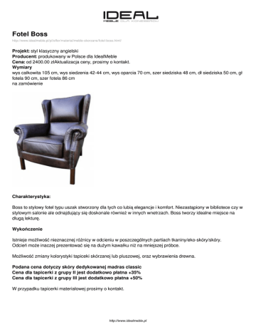 Fotel Boss http://www.idealmeble.pl/pl/offer/material/meble-skorzane/fotel-boss.html/ Projekt: styl klasyczny angielski Producent: produkowany w Polsce dla IdealMeble Cena: od 2400.00 złAktualizacja ceny, prosimy o kontakt. Wymiary wys całkowita 105 cm, wys siedzenia 42-44 cm, wys oparcia 70 cm, szer siedziska 48 cm, dł siedziska 50 cm, gł fotela 90 cm, szer fotela 86 cm na zamówienie Charakterystyka: Boss to stylowy fotel typu uszak stworzony dla tych co lubią elegancje i komfort. Niezastąpiony w bibliotece czy w stylowym salonie ale odnajdujący się doskonale również w innych wnetrzach. Boss tworzy idealne miejsce na długą lekturę. Wykończenie Istnieje możliwość nieznacznej różnicy w odcieniu w poszczególnych partiach tkaniny/eko-skóry/skóry. Odcień może inaczej prezentować się na dużym kawałku niż na mniejszej próbce. Możliwość zmiany kolorystyki tapiceki skórzanej lub pluszowej, oraz wybrawienia drewna. Podana cena dotyczy skóry dedykowanej madras classic Cena dla tapicerki z grupy II jest dodatkowo płatna +35% Cena dla tapicerki z grupy III jest dodatkowo płatna +50% W przypadku tapicerki materiałowej prosimy o kontakt. http://www.idealmeble.pl http://www.idealmeble.pl Zdjęcia produktu: http://www.idealmeble.pl Powered by TCPDF (www.tcpdf.org)