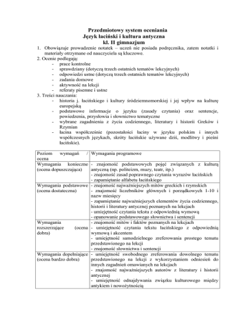 Przedmiotowy system oceniania Język łaciński i kultura antyczna kl. II gimnazjum 1. Obowiązuje prowadzenie notatek – uczeń nie posiada podręcznika, zatem notatki i materiały otrzymane od nauczyciela są kluczowe. 2. Ocenie podlegają: - prace kontrolne - sprawdziany (dotyczą trzech ostatnich tematów lekcyjnych) - odpowiedzi ustne (dotyczą trzech ostatnich tematów lekcyjnych) - zadania domowe - aktywność na lekcji - referaty pisemne i ustne 3. Treści nauczania: - historia j. łacińskiego i kultury śródziemnomorskiej i jej wpływ na kulturę europejską - podstawowe informacje o języku (zasady czytania) oraz sentencje, powiedzenia, przysłowia i słownictwo tematyczne - wybrane zagadnienia z życia codziennego, literatury i historii Greków i Rzymian - łacina współcześnie (pozostałości łaciny w języku polskim i innych współczesnych językach, skróty łacińskie używane dziś, modlitwy i pieśni łacińskie). Poziom wymagań / Wymagania programowe ocena Wymagania konieczne - znajomość podstawowych pojęć związanych z kulturą (ocena dopuszczająca) antyczną (np. politeizm, muzy, teatr, itp.) - znajomość zasad poprawnego czytania wyrazów łacińskich - zapamiętanie alfabetu łacińskiego Wymagania podstawowe - znajomość najważniejszych mitów greckich i rzymskich (ocena dostateczna) - znajomość liczebników głównych i porządkowych 1-10 i nazw miesięcy - zapamiętanie najważniejszych elementów życia codziennego, historii i literatury antycznej poznanych na lekcjach - umiejętność czytania tekstu z odpowiednią wymową - opanowanie podstawowego słownictwa i sentencji Wymagania - znajomość mitów i faktów poznanych na lekcjach rozszerzające (ocena - umiejętność czytania tekstu łacińskiego z odpowiednią dobra) wymową i akcentem - umiejętność samodzielnego zreferowania prostego tematu przedstawionego na lekcji - znajomość słownictwa i sentencji Wymagania dopełniające - umiejętność swobodnego zreferowania dowolnego tematu (ocena bardzo dobra) przedstawionego na lekcji z wykorzystaniem odniesień do innych zagadnień omawianych na lekcjach - znajomość najważniejszych autorów z literatury i historii antycznej - umiejętność odnajdywania związku kulturowego między antykiem i nowożytnością Wymagania wykraczające celująca) - w pracach kontrolnych, sprawdzianach i odpowiedziach (ocena ustnych uczeń uzyskuje najwyższą liczbę punktów, które wynoszą 100% i ponad 100% - samodzielne opracowania w różnej formie - udział w konkursach mitologicznych Ocenę niedostateczną uzyskuje uczeń, który nie spełnił wymagań koniecznych. 4. Tryb uzyskiwania oceny rocznej wyższej niż przewidywana: zgodnie ze Statutem szkoły. Barbara Chmielewska-Brzostowska