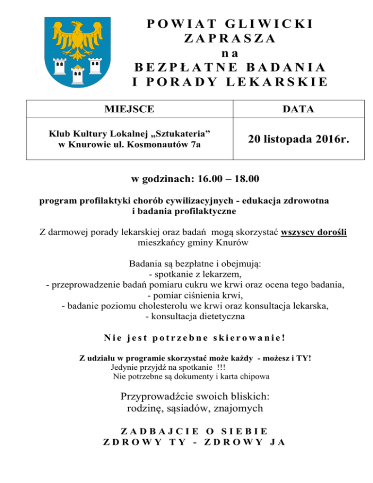 POWIAT GLIWICKI ZAPRASZA na BEZPŁATNE BADANIA I PORADY LEKARSKIE MIEJSCE DATA Klub Kultury Lokalnej „Sztukateria” w Knurowie ul. Kosmonautów 7a 20 listopada 2016r. w godzinach: 16.00 – 18.00 program profilaktyki chorób cywilizacyjnych - edukacja zdrowotna i badania profilaktyczne Z darmowej porady lekarskiej oraz badań mogą skorzystać wszyscy dorośli mieszkańcy gminy Knurów Badania są bezpłatne i obejmują: - spotkanie z lekarzem, - przeprowadzenie badań pomiaru cukru we krwi oraz ocena tego badania, - pomiar ciśnienia krwi, - badanie poziomu cholesterolu we krwi oraz konsultacja lekarska, - konsultacja dietetyczna Nie jest potrzebne skierowanie! Z udziału w programie skorzystać może każdy - możesz i TY! Jedynie przyjdź na spotkanie !!! Nie potrzebne są dokumenty i karta chipowa Przyprowadźcie swoich bliskich: rodzinę, sąsiadów, znajomych ZADBAJCIE O SIEBIE ZDROWY TY - ZDROWY JA