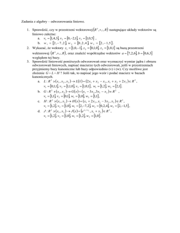Zadania z algebry – odwzorowania liniowe. ( ) 1. Sprawdzić, czy w przestrzeni wektorowej R 3 ,+,⋅, R następujące układy wektorów są liniowo zależne: a. v1 = [1,4,3], v 2 = [0,−2,1], v 3 = [1,0,5] , b. w 1 = [2 , − 7 , 2 ], w 2 = [0 , 2 , 4 ], w 3 = [2 , − 1, 5 ] . 2. Wykazać, że wektory z1 = [1,0,−1], z 2 = [0,1,0], z 3 = [1,0,1] są bazą przestrzeni ( ) wektorowej R 3 ,+,⋅, R , oraz znaleźć współrzędne wektorów a = [7,2,6], b = [0,6,3] względem tej bazy. 3. Sprawdzić liniowość poniższych odwzorowań oraz wyznaczyć wymiar jądra i obrazu odwzorowań liniowych, napisać macierze tych odwzorowań, jeśli w przestrzeniach przyjmiemy bazy kanoniczne lub bazy odpowiednio (v) i (w). Czy możliwe jest złożenie G o L o H ? Jeśli tak, to napisać jego wzór i podać macierz w bazach kanonicznych. a. L : R 3 ∋ ( x1 , x 2 , x 3 ) → L( x ) = (2 x1 + x 2 − x 3 , x1 + x 2 + 2 x 3 ) ∈ R 2 , v1 = [0,1,1], v 2 = [1,1,0], v 3 = [1,0,1] , w1 = [1,2], w2 = [2,1] . b. G : R 2 ∋ ( x1 , x 2 ) → G ( x ) = ( x1 − 3 x 2 ,3 x1 − x 2 ) ∈ R 2 , v1 = [1,1], v 2 = [0,1], w1 = [1,0], w2 = [1,1] , c. H : R 2 ∋ ( x1 , x 2 ) → H ( x ) = ( x1 + 2 x 2 , x1 − 3 x 2 , x 2 ) ∈ R 3 , v1 = [1,2], v 2 = [1,0], w1 = [2,−7,2], w2 = [0,2,4], w3 = [2,−1,5] , ( ) d. J : R 2 ∋ ( x1 , x 2 ) → J ( x ) = e x1 + x2 , x1 + x 2 ∈ R 2 , v1 = [1,2], v 2 = [1,0], w1 = [1,2], w2 = [1,0] .