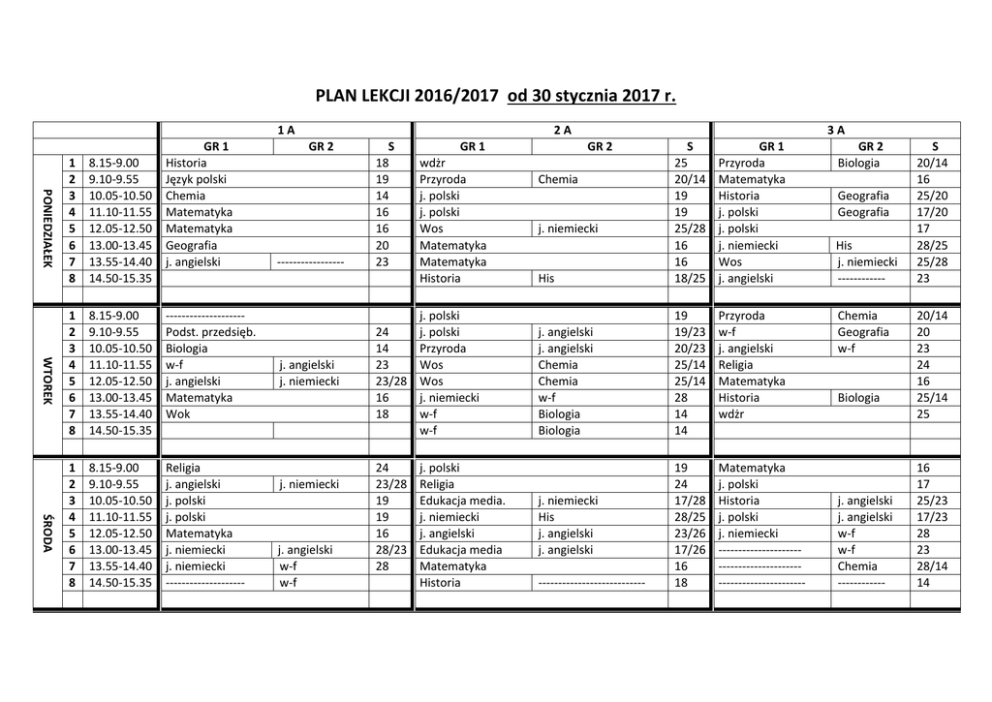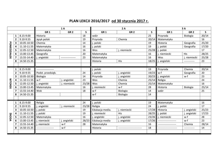 PLAN LEKCJI 2016/2017 od 30 stycznia 2017 r. 1A PONIEDZIAŁEK GR 1 Historia Język polski Chemia Matematyka Matematyka Geografia j. angielski WTOREK ŚRODA 1 2 3 4 5 6 7 8 8.15-9.00 9.10-9.55 10.05-10.50 11.10-11.55 12.05-12.50 13.00-13.45 13.55-14.40 14.50-15.35 1 2 3 4 5 6 7 8 8.15-9.00 9.10-9.55 10.05-10.50 11.10-11.55 12.05-12.50 13.00-13.45 13.55-14.40 14.50-15.35 -------------------Podst. przedsięb. Biologia w-f j. angielski Matematyka Wok 1 2 3 4 5 6 7 8 8.15-9.00 9.10-9.55 10.05-10.50 11.10-11.55 12.05-12.50 13.00-13.45 13.55-14.40 14.50-15.35 Religia j. angielski j. polski j. polski Matematyka j. niemiecki j. niemiecki -------------------- 2A GR 2 ----------------- j. angielski j. niemiecki j. niemiecki j. angielski w-f w-f S 18 19 14 16 16 20 23 GR 1 wdżr Przyroda j. polski j. polski Wos Matematyka Matematyka Historia j. polski 24 j. polski 14 Przyroda 23 Wos 23/28 Wos 16 j. niemiecki 18 w-f w-f 24 23/28 19 19 16 28/23 28 j. polski Religia Edukacja media. j. niemiecki j. angielski Edukacja media Matematyka Historia 3A GR 2 His S 25 20/14 19 19 25/28 16 16 18/25 GR 1 Przyroda Matematyka Historia j. polski j. polski j. niemiecki Wos j. angielski j. angielski j. angielski Chemia Chemia w-f Biologia Biologia 19 19/23 20/23 25/14 25/14 28 14 14 Przyroda w-f j. angielski Religia Matematyka Historia wdżr 19 24 17/28 28/25 23/26 17/26 16 18 Matematyka j. polski Historia j. polski j. niemiecki -------------------------------------------------------------- Chemia j. niemiecki j. niemiecki His j. angielski j. angielski --------------------------- GR 2 Biologia Geografia Geografia His j. niemiecki -----------Chemia Geografia w-f Biologia j. angielski j. angielski w-f w-f Chemia ------------ S 20/14 16 25/20 17/20 17 28/25 25/28 23 20/14 20 23 24 16 25/14 25 16 17 25/23 17/23 28 23 28/14 14 CZWARTEK PIĄTEK 1 2 3 4 5 6 7 8 8.15-9.00 9.10-9.55 10.05-10.50 11.10-11.55 12.05-12.50 13.00-13.45 13.55-14.40 14.50-15.35 Informatyka w-f Fizyka j. polski Religia Podst. przedsięb wdż w-f Informatyka 1 2 3 4 5 6 7 8 8.15-9.00 9.10-9.55 10.05-10.50 11.10-11.55 12.05-12.50 13.00-13.45 13.55-14.40 14.50-15.35 Wos j. polski Zajęcia z wychowawcą w-f j. angielski Historia edb 22 23 16 19 24 24 25 Zajęcia artyst. j. angielski j. angielski Religia j. polski wos j. polski Chemia Biologia w-f 18 19 19 23 18 19 w-f ------------------Zajęcia artyst w-f Zajęcia z wychowawcą j. polski Biologia j. polski Biologia Historia Chemia historia chemia j. angielski j. angielski 17/14 23/14 23 24 19/26 25/26 19 ----------------------j. polski Wos Wos j. polski j. polski Religia Chemia Chemia Biologia Geografia Geografia 16 17/16 25/14 25/20 17/20 17 24 17 18 19/14 19/14 18/14 18/14 Historia Chemia historia Biologia Zajęcia z wychowawcą j. polski w-f HIS w-f j. angielski j.angielski ------------ 25/14 25/14 17 17 25 23 23/16