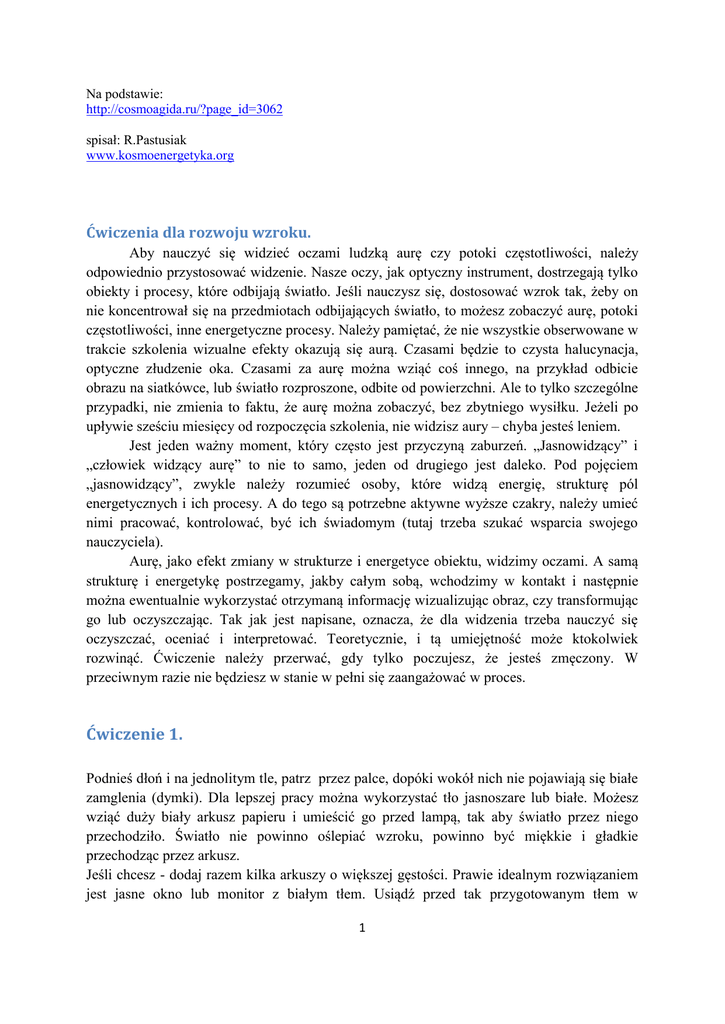 Na podstawie: http://cosmoagida.ru/?page_id=3062 spisał: R.Pastusiak www.kosmoenergetyka.org Ćwiczenia dla rozwoju wzroku. Aby nauczyć się widzieć oczami ludzką aurę czy potoki częstotliwości, należy odpowiednio przystosować widzenie. Nasze oczy, jak optyczny instrument, dostrzegają tylko obiekty i procesy, które odbijają światło. Jeśli nauczysz się, dostosować wzrok tak, żeby on nie koncentrował się na przedmiotach odbijających światło, to możesz zobaczyć aurę, potoki częstotliwości, inne energetyczne procesy. Należy pamiętać, że nie wszystkie obserwowane w trakcie szkolenia wizualne efekty okazują się aurą. Czasami będzie to czysta halucynacja, optyczne złudzenie oka. Czasami za aurę można wziąć coś innego, na przykład odbicie obrazu na siatkówce, lub światło rozproszone, odbite od powierzchni. Ale to tylko szczególne przypadki, nie zmienia to faktu, że aurę można zobaczyć, bez zbytniego wysiłku. Jeżeli po upływie sześciu miesięcy od rozpoczęcia szkolenia, nie widzisz aury – chyba jesteś leniem. Jest jeden ważny moment, który często jest przyczyną zaburzeń. „Jasnowidzący” i „człowiek widzący aurę” to nie to samo, jeden od drugiego jest daleko. Pod pojęciem „jasnowidzący”, zwykle należy rozumieć osoby, które widzą energię, strukturę pól energetycznych i ich procesy. A do tego są potrzebne aktywne wyższe czakry, należy umieć nimi pracować, kontrolować, być ich świadomym (tutaj trzeba szukać wsparcia swojego nauczyciela). Aurę, jako efekt zmiany w strukturze i energetyce obiektu, widzimy oczami. A samą strukturę i energetykę postrzegamy, jakby całym sobą, wchodzimy w kontakt i następnie można ewentualnie wykorzystać otrzymaną informację wizualizując obraz, czy transformując go lub oczyszczając. Tak jak jest napisane, oznacza, że dla widzenia trzeba nauczyć się oczyszczać, oceniać i interpretować. Teoretycznie, i tą umiejętność może ktokolwiek rozwinąć. Ćwiczenie należy przerwać, gdy tylko poczujesz, że jesteś zmęczony. W przeciwnym razie nie będziesz w stanie w pełni się zaangażować w proces. Ćwiczenie 1. Podnieś dłoń i na jednolitym tle, patrz przez palce, dopóki wokół nich nie pojawiają się białe zamglenia (dymki). Dla lepszej pracy można wykorzystać tło jasnoszare lub białe. Możesz wziąć duży biały arkusz papieru i umieścić go przed lampą, tak aby światło przez niego przechodziło. Światło nie powinno oślepiać wzroku, powinno być miękkie i gładkie przechodząc przez arkusz. Jeśli chcesz - dodaj razem kilka arkuszy o większej gęstości. Prawie idealnym rozwiązaniem jest jasne okno lub monitor z białym tłem. Usiądź przed tak przygotowanym tłem w 1 odległości 30-50 cm, tak aby było ci wygodnie i tak, aby pole tła było postawione na wysokości tuż przed twarzą. Podnieś dłoń i ustaw ją na środku pola tła w odległości 5-10 cm od niego, obracając rękę do siebie, w sposób aby palce wskazywały górę. Teraz rozluźnij się, rozluźnij szczęki, policzki, czoło. Spróbuj pozbyć się myśli i skoncentrować się na ćwiczeniu. Staraj się utrzymać ten stan przez cały czas trwania ćwiczenia. Zrelaksuj oczy i zacznij patrzeć na rękę, trochę rozłożywszy palce, żeby między nimi był 1 cm przestrzeni. Na tle trzeba zobaczyć wszystkie palce równocześnie. Oczy pozostają spokojnie a wzrok nieostry. Patrz jakby w dal, patrz swobodnie, nie oczekując niczego specjalnego, nie przyglądaj się niczemu specjalnie. Posiedź tak chwilkę, ile chcesz. Być może już na tym etapie zobaczysz, słabe świecenie w pobliżu palców i mały dymek grubości 1-5 mm lub trochę większy. Teraz zacznij powoli ruszać ręką w prawo i w lewo w przedziałach 5-10 cm, kontynuując patrzenie. Mgiełka staje się jaśniejsza i bardziej widoczna. Jeśli nie widzisz jej przy nieruchomej ręce, to teraz zauważysz, że przy ruchu palców rozciąga się pióropusz mgły, na tle palców zobaczycie jakiś ruch. W tym samym czasie, można również powoli obracać dłonią w płaszczyźnie (pozostawiając dłoń zwróconą do siebie). Najprostszym sposobem, jest położenie ręki podpartej na łokciu na stole i powoli przechylanie jej przed tłem na lewo i prawo. Nadal poruszaj ręką i patrz, dopóki nie zobaczysz wokół palców poświaty w formie jasnej i gęstej mgły o szerokości 5-10 mm. Popracuj z tym, rozpoznaj przy jakim skupieniu wzroku widzisz mgiełkę najlepiej, a przy jakim skupieniu nie widzisz. Naucz się szybko wchodzić w odpowiednie skupienie wzroku. Możesz obrócić dłoń tak, żeby palce patrzyły w bok i przesuwając pięść w górę i w dół, obserwować blask pochodzących z końców palców. W tym przypadku ruszamy tylko dłonią a nie ramieniem. Jeśli poruszać szybko ręką, przed każdym palcem widać żarówki, „kulkę światła”. Spowalniając ruch, widzimy, tą mgiełkę oraz promienie. Promienie wyglądają jak coś ciemnego lub odwrotnie, jak światło, wychodzące z końcówek palców, w zależności od ogniskowania. Jednocześnie każdy promień światła wychodzi prosto z jednego palca. A ciemnych mogą być dwa i mogą wychodzić po bokach, względem siebie pod kątem 30-40 stopni. Aby uzyskać lepszy widok, a ponadto poczuć promienie wychodzące z palców, po kilku minutach, podnieś drugą rękę i dołącz ją do pierwszej, układając je tak, żeby między palcami rąk były trzy centymetry. Teraz porusz obiema rękami w przeciwnych kierunkach. Widać promienie emanujące z każdej ręki. Jednocześnie będą one widoczne wyraźniej i będą się przyciągały, nawet się wzmacniając. A kiedy twoje palce są naprzeciwko, w końcówkach, można poczuć lekki, miękki dotyk tylko w obszarach, w których promienie obu rąk przecinają się wzajemnie. Popracujcie z nim kilka minut. Następnie spróbujcie zwiększyć lub zmniejszyć odległość pomiędzy rękami. Gdy promi