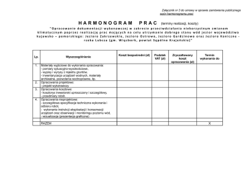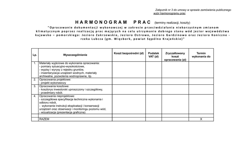 Załącznik nr 3 do umowy w sprawie zamówienia publicznego wzór harmonogramu prac HARMONOGRAM PRAC (terminy realizacji, koszty) "Opracowanie dokumentacji wykonawczej w zakresie przeciwdziałania niekorzystnym zmianom klimatycznym poprzez realizację prac mających na celu utrzymanie dobrego stanu wód jezior województwa kujawsko – pomorskiego: Jezioro Zakrzewskie, Jezioro Ostrowo, Jezioro Gardzinowo oraz Jezioro Koniczne rzeka Lubcza (gm. Więcbork, powiat Sępólno Krajeńskie)" Lp. 1. 2. 3. 4. Wyszczególnienie Koszt bezpośredni (zł) Podatek VAT (zł) Zryczałtowany koszt opracowania (zł) Termin wykonania do Materiały wyjściowe do wykonania opracowania: - pomiary sytuacyjno-wysokościowe, - wypisy i wyrysy z rejestru gruntów, - inwentaryzacja urządzeń wodnych, materiały archiwalne, pozwolenia wodnoprawne, itp. Opracowania projektowe: - projekt wykonawczy Opracowania kosztowe: - kosztorys inwestorski uproszczony i szczegółowy, - przedmiary robót. Opracowania nieprojektowe: - szczegółowa specyfikacja techniczna wykonania i odbioru robót, - wykonanie instrukcji eksploatacji i konserwacji urządzeń oraz obserwacji i monitoringu poziomu wód, - wizualizacja (prezentacja graficzna) RAZEM X