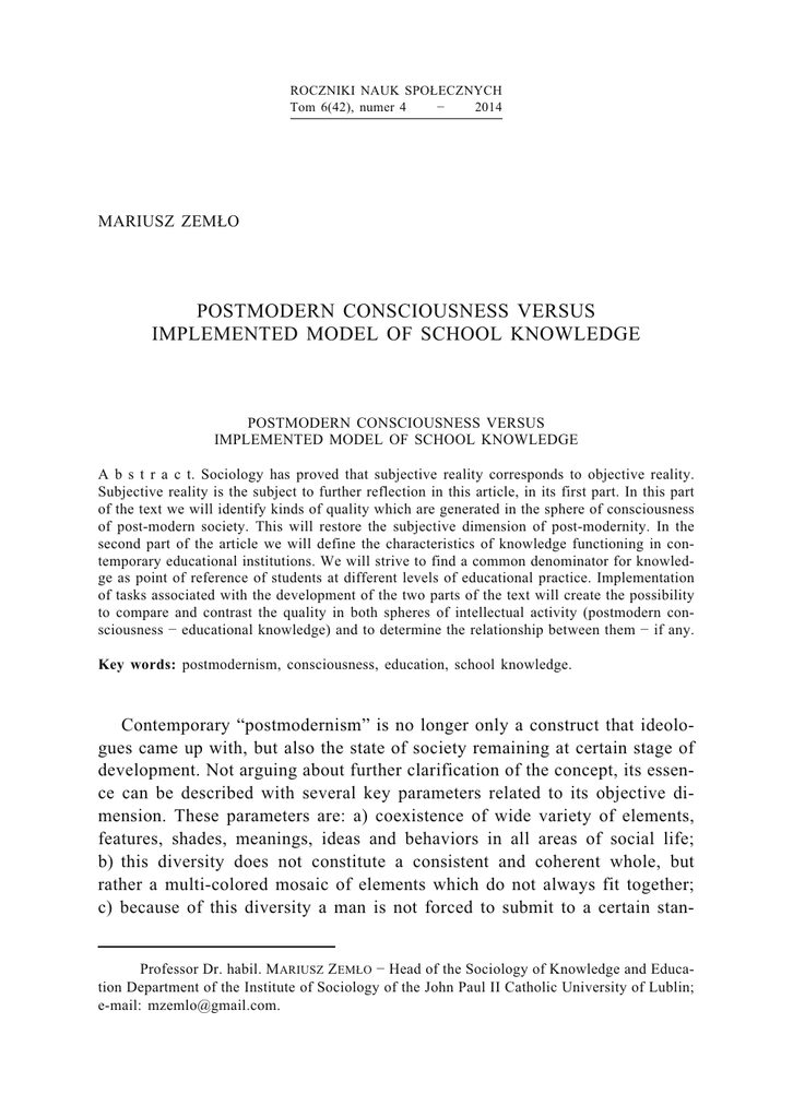 ROCZNIKI NAUK SPOŁECZNYCH Tom 6(42), numer 4 − 2014 MARIUSZ ZEMŁO POSTMODERN CONSCIOUSNESS VERSUS IMPLEMENTED MODEL OF SCHOOL KNOWLEDGE POSTMODERN CONSCIOUSNESS VERSUS IMPLEMENTED MODEL OF SCHOOL KNOWLEDGE A b s t r a c t. Sociology has proved that subjective reality corresponds to objective reality. Subjective reality is the subject to further reflection in this article, in its first part. In this part of the text we will identify kinds of quality which are generated in the sphere of consciousness of post-modern society. This will restore the subjective dimension of post-modernity. In the second part of the article we will define the characteristics of knowledge functioning in contemporary educational institutions. We will strive to find a common denominator for knowledge as point of reference of students at different levels of educational practice. Implementation of tasks associated with the development of the two parts of the text will create the possibility to compare and contrast the quality in both spheres of intellectual activity (postmodern consciousness − educational knowledge) and to determine the relationship between them − if any. Key words: postmodernism, consciousness, education, school knowledge. Contemporary “postmodernism” is no longer only a construct that ideologues came up with, but also the state of society remaining at certain stage of development. Not arguing about further clarification of the concept, its essence can be described with several key parameters related to its objective dimension. These parameters are: a) coexistence of wide variety of elements, features, shades, meanings, ideas and behaviors in all areas of social life; b) this diversity does not constitute a consistent and coherent whole, but rather a multi-colored mosaic of elements which do not always fit together; c) because of this diversity a man is not forced to submit to a certain stan- Professor Dr. habil. MARIUSZ ZEMŁO − Head of the Sociology of Knowledge and Education Department of the Institute of Sociology of the John Paul II Catholic University of Lublin; e-mail: [email protected]. 32 MARIUSZ ZEMŁO dard but he is invited to decide for the chosen option − the choice becomes a challenge and an inevitable condition connected with man’s functioning in all dimensions of his activity; d) binding pluralism is also connected with atomization of all levels of social life − from the structure, through culture, to the individual’s identity; e) various spheres of social life are subject to rapid changes, however, the transformations do not have clear purpose or direction. Sociology has proved that subjective reality corresponds to objective reality. Subjective reality is the subject to further reflection in this article, in its first part. In this part of the text we will identify kinds of quality which are generated in the sphere of consciousness of post-modern society. This will restore the subjective dimension of post-modernity. In the second part of the article we will define the characteristics of knowledge functioning in contemporary educational institutions. We will strive to find a common denominator for knowledge as a point of reference of students at different levels of educational practice. Implementation of tasks associated with the development of the two parts of the text will create the possibility to compare and contrast the quality in both spheres of intellectual activity (postmodern consciousness − educational knowledge) and to determine the relationship between them − if any. This confrontation will primarily address the following questions: Whether school knowledge has/has not got characteristics independent of those which correspond to popular awareness? What may be the possible result of the opportunity to comment on the matter: do educational institutions contribute to the students’ acquisition of postmodern consciousness or do they try to create intellectual quality on their own? 1. CHARACTERISTICS OF POSTMODERN CONSCIOUSNESS 1) Severing bonds with the past. In the postmodern era getting rid of connection to past experience (not only personal but also social) is considered as condition of progress. Past experience enabled man to gain organic vitality, build the foundations of personality, vision and understanding of the world, as well as determine upon his axiological azimuths etc. Hanging on tightly to the past, looking back and continuous moving within “the old” which does not guarantee fresh, better quality slow the progress down. The era of postmodern society can dawn only if we free imagination and move POSTMODERN CONSCIOUSNESS VERSUS IMPLEMENTED MODEL 33 perception into new, inspiring dimension devoid of patterns, common notions, stereotypes and other limits to imagination. Therefore one should build strong position in the present and most preferably confidently look ahead. According to the prophets of the new order adopting this perspective is the condition of innovation, acceleration of civilization and other positive changes. It is then crucial to loosen or even sever any ties with the past1. Another important reason for adopting such strategy is that it cleans the mind of the experience that might result in claiming damages from the actors in certain situation for the disappointment, anxiety and pain they caused. Any memory of such situations stimulates reopening old wounds, feeling deep hurts and shedding a lot of tears. Memory also helps to recall old, dangerous “demons” which give incentive to call for justice and are always ready to inspire one to make out a bill for the loss he suffered. Such situation is unfavorable. It poses a threat to a peaceful social condition and relative, controlled stability. Therefore a belief that looking back results not only in reactionary attitudes but it also is a source of xenophobia and chauvinism is strengthened in society2. Due to such arguments mental breaking of ties with tradition comes
