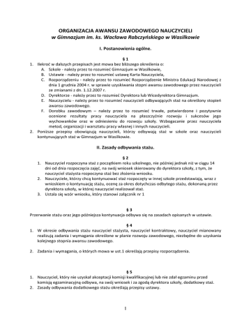 ORGANIZACJA AWANSU ZAWODOWEGO NAUCZYCIELI w Gimnazjum im. ks. Wacława Rabczyńskiego w Wasilkowie I. Postanowienia ogólne. §1 1. Ilekroć w dalszych przepisach jest mowa bez bliższego określenia o: A. Szkole - należy przez to rozumieć Gimnazjum w Wasilkowie, B. Ustawie - należy przez to rozumieć ustawę Karta Nauczyciela, C. Rozporządzeniu - należy przez to rozumieć Rozporządzenie Ministra Edukacji Narodowej z dnia 1 grudnia 2004 r. w sprawie uzyskiwania stopni awansu zawodowego przez nauczycieli ze zmianami z dn. 1.12.2007 r. D. Dyrektorze - należy przez to rozumieć Dyrektora lub Wicedyrektora Gimnazjum. E. Nauczycielu - należy przez to rozumieć nauczycieli odbywających staż na określony stopień awansu zawodowego. F. Dorobku zawodowym – należy przez to rozumieć trwałe, potwierdzone i pozytywnie ocenione rezultaty pracy nauczyciela na płaszczyźnie rozwoju i sukcesów jego wychowanków oraz w odniesieniu do rozwoju szkoły. Wzbogacanie przez nauczyciela metod, organizacji i warsztatu pracy własnej i innych nauczycieli. 2. Poniższe przepisy obowiązują nauczycieli, którzy odbywają staż w szkole oraz nauczycieli kontynuujących staż w Gimnazjum w Wasilkowie. II. Zasady odbywania stażu. §2 1. Nauczyciel rozpoczyna staż z początkiem roku szkolnego, nie później jednak niż w ciągu 14 dni od dnia rozpoczęcia zajęć, na swój wniosek skierowany do dyrektora szkoły, z tym, że nauczyciel stażysta rozpoczyna staż bez złożenia wniosku. 2. Nauczyciele, którzy chcą kontynuować staż rozpoczęty w innej szkole przedstawiają, wraz z wnioskiem o kontynuację stażu, ocenę za okres dotychczas odbytego stażu, dokonaną przez dyrektora szkoły, w której nauczyciel realizował staż. 3. Ustala się wzór wniosku, który stanowi załącznik nr 1 §3 Przerwanie stażu oraz jego późniejsza kontynuacja odbywa się na zasadach opisanych w ustawie. §4 1. W okresie odbywania stażu nauczyciel stażysta, nauczyciel kontraktowy, nauczyciel mianowany realizują zadania i wymagania określone w planie rozwoju zawodowego, niezbędne do uzyskania kolejnego stopnia awansu zawodowego. 2. Zadania i wymagania, o których mowa w ust.1 określają przepisy rozporządzenia. §5 1. Nauczyciel, który nie uzyskał akceptacji komisji kwalifikacyjnej lub nie zdał egzaminu przed komisją egzaminacyjną odbywa, na swój wniosek i za zgodą dyrektora szkoły, dodatkowy staż. 2. Zasady odbywania dodatkowego stażu określają przepisy ustawy. 1 III. Plan rozwoju zawodowego. Sprawozdanie z realizacji planu. §6 1. W okresie stażu nauczyciel realizuje własny plan rozwoju zawodowego zatwierdzony przez dyrektora szkoły. 2. Plan rozwoju zawodowego sporządza się przy wykorzystaniu techniki komputerowej. 3. Plan rozwoju zawodowego nauczyciela zatwierdza dyrektor szkoły w terminie do 30 dni od dnia rozpoczęcia zajęć. 4. Plan rozwoju zawodowego nauczyciel stażysta przedkłada dyrektorowi nie później niż do dnia 20 września, a nauczyciel kontraktowy i mianowany – do dnia 14 września. 5. Plan rozwoju zawodowego musi uwzględniać zadania i wymagania dla poszczególnych stopni awansu określone w przepisach rozporządzenia oraz specyfikę i potrzeby szkoły wynikające z Programu Rozwoju Szkoły. 6. W planie rozwoju zawodowego nauczyciel stażysta uwzględnia zajęcia prowadzone z uczniami, w obecności opiekuna stażu lub dyrektora szkoły w wymiarze 2 lekcji w miesiącu. 7. Zajęcia, o których mowa w ust.6 nauczyciel stażysta prowadzi w wymiarze określonym w rozporządzeniu. Nauczyciel kontraktowy prowadzi zajęcia w wymiarze co najmniej dwóch zajęć w semestrze.. §7 1. Sprawozdanie z realizacji planu rozwoju zawodowego nauczyciel składa dyrektorowi szkoły w terminie do 30 dni od dnia zakończenia stażu. 2. Sprawozdanie ma charakter informacyjno-dokumentacyjny, wskazuje sposób wykonania zadań określonych w planie rozwoju i osiągnięte efekty. §8 1. Nauczyciel przedkłada dyrektorowi szkoły okresowe sprawozdania z realizacji planu rozwoju zawodowego w danym roku szkolnym, po zakończeniu każdego semestru, z wyłączeniem roku, w którym staż się kończy. 2. Wzór sprawozdania stanowi załącznik nr 2. IV. Dokumentowanie realizacji zadań wynikających z planu rozwoju zawodowego. §9 1. Programy i przedsięwzięcia planowane i opracowane przez nauczyciela muszą wynikać z potrzeb szkoły, a ich wdrożenie ma podwyższać jakości pracy nauczyciela i szkoły oraz przynosić wymierne korzyści uczniom. 2. Programy i przedsięwzięcia, o których mowa w ust.1, przed ich wdrożeniem, muszą uzyskać akceptację dyrektora szkoły. § 10 1. Nauczyciel dokumentuje realizację zadań określonych w planie rozwoju zawodowego. 2. Dokumentacja jest przygotowywana przy użyciu techniki komputerowej. 3. Na zakończenie każdego semestru, nauczyciel odbywający staż składa dyrektorowi szkoły sprawozdanie semestralne z realizacji planu rozwoju zawodowego wg ustalonego wzoru (załącznik nr 2) 2 § 11 1. Przeprowadzenie badań, których wyniki zostaną wykorzystane do udokumentowania realizacji zadań wynikających z planu rozwoju zawodowego, w klasach wybranych przez nauczyciela, może być wykonane po uzyskaniu zgody dyrektora szkoły. 2. Przeprowadzenie badań potwierdza się wpisem do dziennika lekcyjnego w tabeli „Wydarzenia z życia klasy”. V. Rola i zadania opiekuna stażu § 12 Nauczycielowi stażyście i nauczycielowi kontraktowemu odbywającemu staż, dyrektor szkoły przydziela opiekuna stażu. § 13 Zadaniem opiekuna stażu jest: 1. Udzielanie nauczycielowi wszelkiej pomocy w opracowaniu i realizacji planu rozwoju. 2. Opracowanie, wspólnie z nauczycielem, dokumentu określającego zasady i formy współpracy, który uwzględniał będzie: A. spotkania informacyjne (dotyczące procedury awansu, prowadzenia dokumentacji, regulaminu i statutu szkoły, itp.), B. spotkania instruktażowo-konsultacyjne (formy i metody pracy, procedury, itp.), C. spotkan