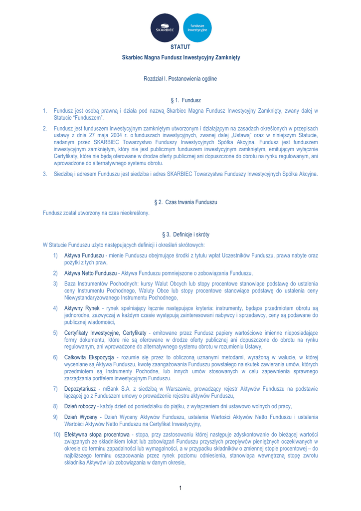STATUT Skarbiec Magna Fundusz Inwestycyjny Zamknięty 1