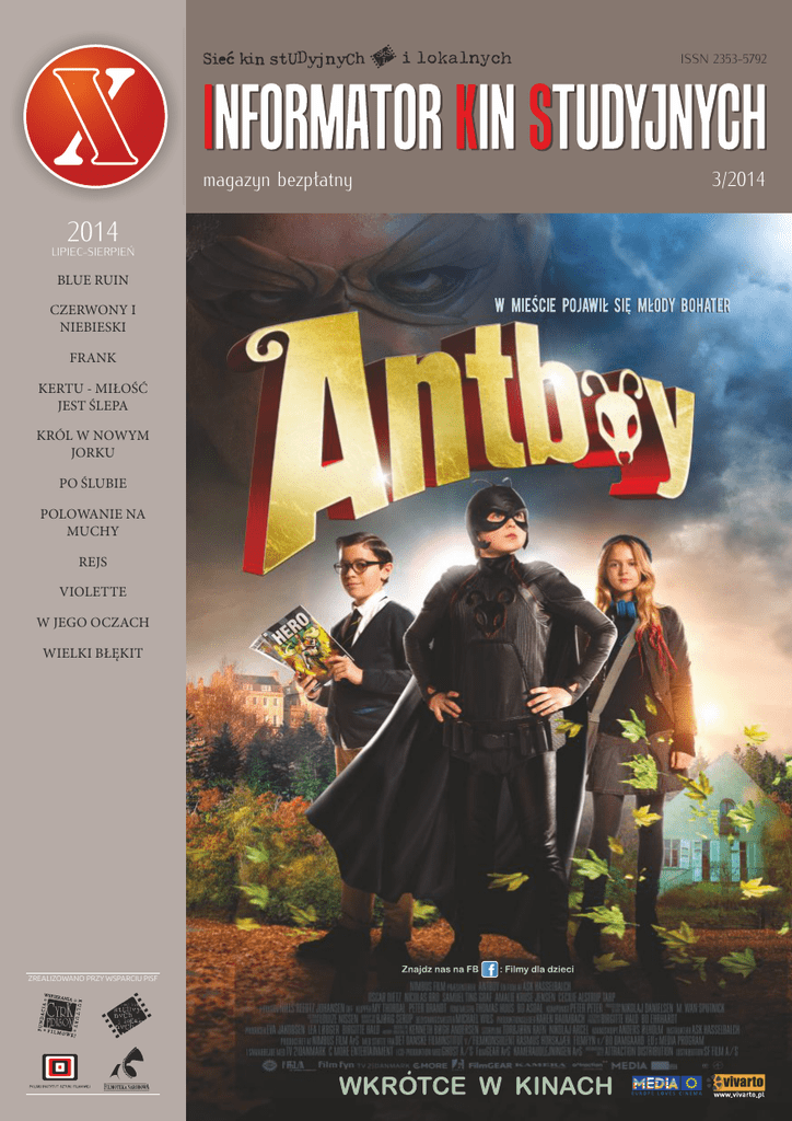 ISSN 2353-5792 magazyn bezpłatny 2014 LIPIEC-SIERPIEŃ BLUE RUIN CZERWONY I NIEBIESKI FRANK KERTU - MIŁOŚĆ JEST ŚLEPA KRÓL W NOWYM JORKU PO ŚLUBIE POLOWANIE NA MUCHY REJS VIOLETTE W JEGO OCZACH WIELKI BŁĘKIT ZREALIZOWANO PRZY WSPARCIU PISF 3/2014 SPIS TREŚCI od 4 lipca CZERWONY I NIEBIESKI //05 od 11 lipca FRANK //07 POLOWANIE NA MUCHY //09 KERTU - MIŁOŚĆ JEST ŚLEPA //10 od 18 lipca PO ŚLUBIE //11 od 25 lipca KRÓL W NOWYM JORKU //12 od 8 sierpnia REJS //13 WIELKI BŁĘKIT //14 od 15 sierpnia VIOLETTE //15 od 22 sierpnia BLUE RUIN //16 od 29 sierpnia W JEGO OCZACH //17 PONADTO W KINACH //18...19 KINO W SIECI //21 DZIEJE SIĘ W SIECI //23...26 KALENDARZ KINOFILSKI //27...32 ROZMOWA X //33...36 KRZYŻÓWKA //38 3 CZERWONY I NIEBIESKI premiera 4 lipca FILM FABULARNY TYTUŁ ORYGINALNY Il rosso e il blu REŻYSERIA Giuseppe Piccioni SCENARIUSZ Giuseppe Piccioni, Francesca Manieri ZDJĘCIA Roberto Cimatti MUZYKA Mattia Carratello, Stefano Ratchev OBSADA Margherita Buy, Riccardo Scamarcio PRODUKCJA Włochy 2012 CZAS 1 godz. 38 min. DYSTRYBUTOR Aurora Films www.aurora lms.pl ORIGINAL LANGUAGE Italian 5 FRANK premiera 11 lipca FILM FABULARNY TYTUŁ ORYGINALNY Frank REŻYSERIA Lenny Abrahamson SCENARIUSZ Jon Ronson, Peter Straughan ZDJĘCIA James Mather MUZYKA Stephen Rennicks OBSADA Domhnall Gleeson, Michael Fassbender, Maggie Gyllenhaal PRODUKCJA Wlk. Brytania/Irlandia 2013 CZAS 1 godz. 35 min. DYSTRYBUTOR Gutek Film www.gutek lm.pl ORIGINAL LANGUAGE English 7 FILM FABULARNY POLOWANIE NA MUCHY premiera 11 lipca TYTUŁ ORYGINALNY Polowanie na muchy REŻYSERIA Andrzej Wajda SCENARIUSZ Janusz Głowacki ZDJĘCIA Zygmunt Samosiuk MUZYKA Andrzej Korzyński OBSADA Zygmunt Malanowicz, Małgorzata Braunek, Hanna Skarżanka, Daniel Olbrychski PRODUKCJA Polska 1969 CZAS 1 godz. 44 min. DYSTRYBUTOR Cyfrowe Repozytorium Filmowe www.repozytorium lmowe.pl ORIGINAL LANGUAGE Polish 9 FILM FABULARNY TYTUŁ ORYGINALNY Kertu REŻYSERIA Ilmar Raag KERTU – MIŁOŚĆ JEST ŚLEPA premiera 11 lipca SCENARIUSZ Ilmar Raag ZDJĘCIA Kristjan-Jaak Nuudi MUZYKA Horrer Kuus, Mari Pokinen OBSADA Ursula Ratasepp, Mait Malmsten, Jüri Lumiste, Külliki Saldre PRODUKCJA Estonia 2013 CZAS 1 godz. 37 min. DYSTRYBUTOR Vivarto www.vivarto.pl ORIGINAL LANGUAGE Estonian 10 PO ŚLUBIE premiera 18 lipca FILM FABULARNY TYTUŁ ORYGINALNY Líbánky REŻYSERIA Jan Hřebejk SCENARIUSZ Petr Jarchovský ZDJĘCIA Martin Štrba MUZYKA Aleš Březina OBSADA Anna Geislerová, Stanislav Majer, Kristýna Nováková-Fuitová, Jiří Černý PRODUKCJA Czechy/Słowacja 2013 CZAS 1 godz. 38 min. DYSTRYBUTOR Aurora Films www.aurora lms.pl ORIGINAL LANGUAGE Czech 11 FILM FABULARNY TYTUŁ ORYGINALNY A King in New York REŻYSERIA Charles Chaplin KRÓL W NOWYM JORKU premiera 25 lipca SCENARIUSZ Charles Chaplin ZDJĘCIA Georges Périnal MUZYKA Charles Chaplin OBSADA Charles Chaplin, Michael Chaplin, Maxine Audley, Jerry Desmonde PRODUKCJA USA 1957 CZAS 1 godz. 50 min. DYSTRYBUTOR Art-House www.vivarto.pl ORIGINAL LANGUAGE English 12 REJS premiera 8 sierpnia FILM FABULARNY TYTUŁ ORYGINALNY Rejs REŻYSERIA Marek Piwowski SCENARIUSZ Janusz Głowacki, Marek Piwowski ZDJĘCIA Marek Nowicki MUZYKA Wojciech Kilar OBSADA Stanisław Tym, Jan Himilsbach, Zdzisław Maklakiewicz PRODUKCJA Polska 1970 CZAS 1 godz. 5 min. DYSTRYBUTOR Cyfrowe Repozytorium Filmowe www.repozytorium lmowe.pl ORIGINAL LANGUAGE Polish 13 FILM FABULARNY TYTUŁ ORYGINALNY Le grand bleu REŻYSERIA Luc Besson WIELKI BŁĘKIT premiera 8 sierpnia SCENARIUSZ Luc Besson, Robert Garland, Marilyn Goldin, Jacques Mayol ZDJĘCIA Carlo Varini MUZYKA Eric Serra OBSADA Jean-Marc Barr, Jean Reno, Rosanna Arquette PRODUKCJA Francja/USA/Włochy 1988 CZAS 2 godz. 48 min. DYSTRYBUTOR Art-House www.vivarto.pl ORIGINAL LANGUAGE French 14 VIOLETTE premiera 15 sierpnia FILM FABULARNY TYTUŁ ORYGINALNY Violette REŻYSERIA Martin Provost SCENARIUSZ Martin Provost, Marc Abdelnour ZDJĘCIA Yves Cape MUZYKA Hugues Tabar-Nouval OBSADA Emmanuelle Devos, Sandrine Kiberlain, Olivier Gourmet PRODUKCJA Francja/Belgia 2013 CZAS 2 godz. 12 min. DYSTRYBUTOR Aurora Films www.aurora lms.pl ORIGINAL LANGUAGE French 15 FILM FABULARNY TYTUŁ ORYGINALNY Blue Ruin REŻYSERIA Jeremy Saulnier BLUE RUIN premiera 22 sierpnia SCENARIUSZ Jeremy Saulnier ZDJĘCIA Jeremy Saulnier MUZYKA Brooke Blair, Will Blair OBSADA Macon Blair, Devin Ratray, Amy Hargreaves, Kevin Kolach, Eve Plumb PRODUKCJA USA/Francja 2013 CZAS 1 godz. 30 min. DYSTRYBUTOR Gutek Film www.gutek lm.pl ORIGINAL LANGUAGE English 16 W JEGO OCZACH premiera 29 sierpnia FILM FABULARNY TYTUŁ ORYGINALNY Hoje Eu Quero Voltar Sozinho REŻYSERIA Daniel Ribeiro SCENARIUSZ Daniel Ribeiro ZDJĘCIA Pierre de Kerchove MUZYKA Ariel Henrique, Gabriela Cunha OBSADA Ghilherme Lobo, Fábio Audi, Tess Amorim PRODUKCJA Brazylia 2014 CZAS 1 godz. 35 min. DYSTRYBUTOR Tongariro Releasing www.tongariro.pl ORIGINAL LANGUAGE Portuguese 17 PONADTO W KINACH UCIEKINIER Z NOWEGO JORKU NASRINE Song from the Forest, reż. Michael Obert, Niemcy 2013, 98' I Am Nasrine, reż. Tina Gharavi, Wielka Brytania 2012, 88' BANK LADY PODEJRZANY: AI WEIWEI Banklady, reż. Christian Alvart, Niemcy 2013, 118' Ai Weiwei: e Fake Case, reż. Andreas Johnsen, Dania 2013, 79' 18 PONADTO W KINACH DRUŻYNA BOBRY Drużyna, reż. Michał Bielawski, Polska 2014, 80' Bobry, reż. Hubert Gotkowski, Polska 2013, 90' SUPERMRÓWKA HOTEL Antboy, reż. Ask Hasselbalch, Dania 2013, 77' Hotell, reż. Lisa Langseth, Szwecja/Dania 2013, 97' 19 KINA W SIECI Regis w Bochni Kino Regis DATA URUCHOMIENIA ADRES STRONA INTERNETOWA LICZBA SAL LICZBA MIEJSC OBRAZ DŹWIĘK KLIMATYZACJA POPCORN CENY BILETÓW 21 7 września 2002 roku ul. Regis 1 32-700 Bochnia www.kino.bochnia.pl 2 130 (duża sala) 50 (mała sala) DCI 2K, 35 mm, Blu-ray Dolby Digital Stereo Ex tak nigdy 10-18 zł DZIEJE SIĘ W SIECI Kino Tomi, Pabianice CKF Stylowy, Zamość Kino KC, Warszawa Kino dk, Kęty 23 DZIEJE SIĘ W SIECI Kino Iluzja, Częstochowa Kinoteatr Rialto, Katow