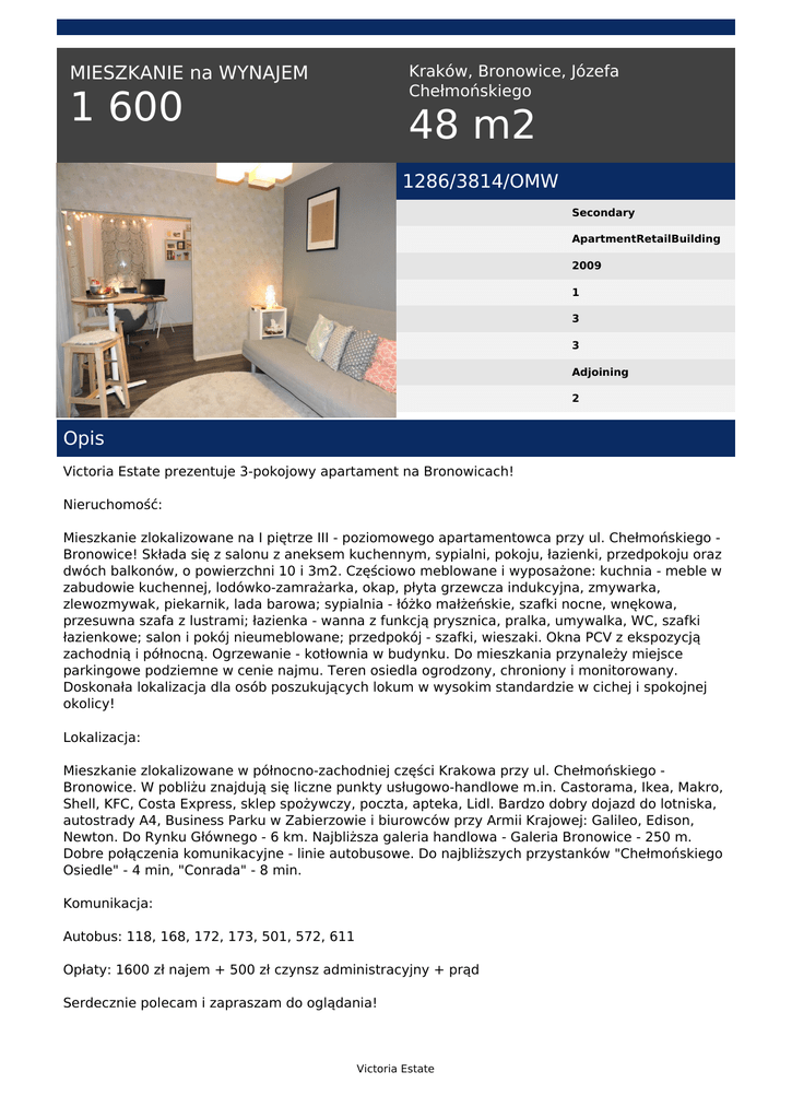 Kraków, Bronowice, Józefa Chełmońskiego MIESZKANIE na WYNAJEM 1 600 48 m2 1286/3814/OMW Secondary ApartmentRetailBuilding 2009 1 3 3 Adjoining 2 Opis Victoria Estate prezentuje 3-pokojowy apartament na Bronowicach! Nieruchomość: Mieszkanie zlokalizowane na I piętrze III - poziomowego apartamentowca przy ul. Chełmońskiego Bronowice! Składa się z salonu z aneksem kuchennym, sypialni, pokoju, łazienki, przedpokoju oraz dwóch balkonów, o powierzchni 10 i 3m2. Częściowo meblowane i wyposażone: kuchnia - meble w zabudowie kuchennej, lodówko-zamrażarka, okap, płyta grzewcza indukcyjna, zmywarka, zlewozmywak, piekarnik, lada barowa; sypialnia - łóżko małżeńskie, szafki nocne, wnękowa, przesuwna szafa z lustrami; łazienka - wanna z funkcją prysznica, pralka, umywalka, WC, szafki łazienkowe; salon i pokój nieumeblowane; przedpokój - szafki, wieszaki. Okna PCV z ekspozycją zachodnią i północną. Ogrzewanie - kotłownia w budynku. Do mieszkania przynależy miejsce parkingowe podziemne w cenie najmu. Teren osiedla ogrodzony, chroniony i monitorowany. Doskonała lokalizacja dla osób poszukujących lokum w wysokim standardzie w cichej i spokojnej okolicy! Lokalizacja: Mieszkanie zlokalizowane w północno-zachodniej części Krakowa przy ul. Chełmońskiego Bronowice. W pobliżu znajdują się liczne punkty usługowo-handlowe m.in. Castorama, Ikea, Makro, Shell, KFC, Costa Express, sklep spożywczy, poczta, apteka, Lidl. Bardzo dobry dojazd do lotniska, autostrady A4, Business Parku w Zabierzowie i biurowców przy Armii Krajowej: Galileo, Edison, Newton. Do Rynku Głównego - 6 km. Najbliższa galeria handlowa - Galeria Bronowice - 250 m. Dobre połączenia komunikacyjne - linie autobusowe. Do najbliższych przystanków "Chełmońskiego Osiedle" - 4 min, "Conrada" - 8 min. Komunikacja: Autobus: 118, 168, 172, 173, 501, 572, 611 Opłaty: 1600 zł najem + 500 zł czynsz administracyjny + prąd Serdecznie polecam i zapraszam do oglądania! Victoria Estate Paulina Zajdel tel. +48 789 453 049 email: [email protected] Victoria Estate Powered by TCPDF (www.tcpdf.org)
