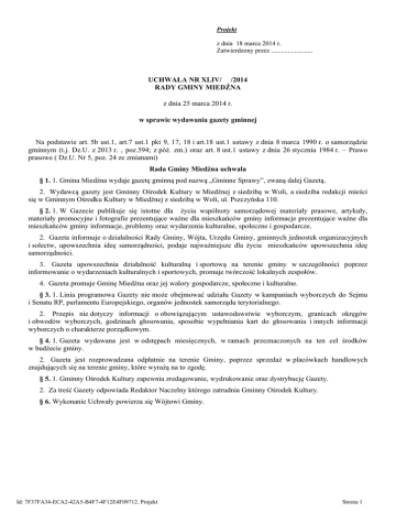 Projekt z dnia 18 marca 2014 r. Zatwierdzony przez ......................... UCHWAŁA NR XLIV/ /2014 RADY GMINY MIEDŹNA z dnia 25 marca 2014 r. w sprawie wydawania gazety gminnej Na podstawie art. 5b ust.1, art.7 ust.1 pkt 9, 17, 18 i art.18 ust.1 ustawy z dnia 8 marca 1990 r. o samorządzie gminnym (t.j. Dz.U. z 2013 r. , poz.594; z póź. zm.) oraz art. 8 ust.1 ustawy z dnia 26 stycznia 1984 r. – Prawo prasowe ( Dz.U. Nr 5, poz. 24 ze zmianami) Rada Gminy Miedźna uchwala § 1. 1. Gmina Miedźna wydaje gazetę gminną pod nazwą „Gminne Sprawy”, zwaną dalej Gazetą. 2. Wydawcą gazety jest Gminny Ośrodek Kultury w Miedźnej z siedzibą w Woli, a siedziba redakcji mieści się w Gminnym Ośrodku Kultury w Miedźnej z siedzibą w Woli, ul. Pszczyńska 110. § 2. 1. W Gazecie publikuje się istotne dla życia wspólnoty samorządowej materiały prasowe, artykuły, materiały promocyjne i fotografie prezentujące ważne dla mieszkańców gminy informacje prezentujące ważne dla mieszkańców gminy informacje, problemy oraz wydarzenia kulturalne, społeczne i gospodarcze. 2. Gazeta informuje o działalności Rady Gminy, Wójta, Urzędu Gminy, gminnych jednostek organizacyjnych i sołectw, upowszechnia ideę samorządności, podaje najważniejsze dla życia mieszkańców upowszechnia ideę samorządności. 3. Gazeta upowszechnia działalność kulturalną i sportową na terenie gminy w szczególności poprzez informowanie o wydarzeniach kulturalnych i sportowych, promuje twórczość lokalnych zespołów. 4. Gazeta promuje Gminę Miedźna oraz jej walory gospodarcze, społeczne i kulturalne. § 3. 1. Linia programowa Gazety nie może obejmować udziału Gazety w kampaniach wyborczych do Sejmu i Senatu RP, parlamentu Europejskiego, organów jednostek samorządu terytorialnego. 2. Przepis nie dotyczy informacji o obowiązującym ustawodawstwie wyborczym, granicach okręgów i obwodów wyborczych, godzinach głosowania, sposobie wypełniania kart do głosowania i innych informacji wyborczych o charakterze porządkowym. § 4. 1. Gazeta wydawana jest w odstępach miesięcznych, w ramach przeznaczonych na ten cel środków w budżecie gminy. 2. Gazeta jest rozprowadzana odpłatnie na terenie Gminy, poprzez sprzedaż w placówkach handlowych znajdujących się na terenie gminy, które wyrażą na to zgodę. § 5. 1. Gminny Ośrodek Kultury zapewnia zredagowanie, wydrukowanie oraz dystrybucję Gazety. 2. Za treść Gazety odpowiada Redaktor Naczelny którego zatrudnia Gminny Ośrodek Kultury. § 6. Wykonanie Uchwały powierza się Wójtowi Gminy. Id: 7F37FA34-ECA2-42A5-B4F7-4F12E4F09712. Projekt Strona 1 § 7. Uchwała wchodzi w życie z dniem podjęcia. Przewodniczący Rady Gminy Miedźna mgr inż. Stanisław Karbowy Id: 7F37FA34-ECA2-42A5-B4F7-4F12E4F09712. Projekt Strona 2