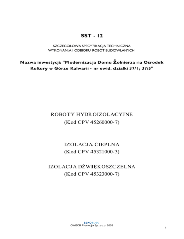 SST - 12 6=&=(*Ðá2:$63(&<),.$&-$7(&+1,&=1$ :<.21$1,$,2'%,25852%Ð7%8'2:/$1<&+ 1D]ZDLQZHVW\FML0RGHUQL]DFMD'RPXĢRâQLHU]DQD2ėURGHN .XOWXU\Z*yU]H.DOZDULLQUHZLGG]LDâNL ROBOTY HYDROIZOLACYJ NE (Kod CPV 45260000-7) IZOLACJ A CIEPLNA (Kod CPV 45321000-3) ,=2/$&- $'ħ:,ĉ.26=&=(/1$ (Kod CPV 45323000-7) SEKOspec OWEOB Promocja Sp. z o.o. 2005 1 1. : 67ĉ3 1.1. Przedmiot SST 1.2. Zakres stosowania ST Przedmiotem niniejszej standardowej specyfikacji technicznej (ST) Vą wymagania GRW\F]ąFH wykonania i odbioru izolacji przeciwwilgociowych , izoalcji cieplnych iGĨZLĊNRV]F]HOQ\FK 6]F]HJyáRZD Specyfikacja Techniczna (SST) jest stosowana jako dokument przetargowy i kontraktowy przy zlecaniu i realizacji rob—t wymienionych w pkt. 1.2. 2GVWĊSVWZD od Z\PDJDĔ podanych w niniejszej specyfikacji PRJą PLHü miejsce tylko w przypadkach prostych rob—t o niewielkim znaczeniu, dla kt—rych istnieje SHZQRĞü ĪH podstawowe wymagania EĊGą VSHáQLRQH przy zastosowaniu metod wykonania Z\QLNDMąF\FK z GRĞZLDGF]HQLD oraz uznanych UHJXá i zasad sztuki budowlanej oraz przyXZ]JOĊGQLHQLX przepis—w bhp. 1.3. 2NUHĞOHQLD podstawowe, definicje 1.4. Og—lne wymaganiaGRW\F]ąFH hydroizolacji, izolacji cieplnych iGĨZLĊNRV]F]HOQ\FK 2NUHĞOHQLD podane w niniejszej Specyfikacji Vą zgodne z odpowiednimi normami oraz RNUHĞOHQLDPL podanymi w ST Ä: \PDJDQLDRJyOQH´ Kod CPV 45000000-7, pkt 1.4. W ykonawca rob—t jest odpowiedzialny za MDNRĞü ich wykonania oraz za ]JRGQRĞü z GRNXPHQWDFMą SURMHNWRZą specyfikacjami technicznymi i poleceniami Inspektora nadzoru. Og—lne wymagania GRW\F]ąFH rob—t podano w ST Ä: \PDJDQLDRJyOQH´ Kod CPV 45000000-7, pkt. 1.5. 2. 2.1. W YMAGANIA'27<&=Ą&(: à$ĝ&,: 2ĝ&,0$7(5,$àÏ: Og—lne wymagania GRW\F]ąFH ZáDĞFLZRĞFL PDWHULDáyZ ich pozyskiwania i VNáDGRZDQLD podano w ST Ä: \PDJDQLDRJyOQH´ Kod CPV 45000000-7, pkt 2 0DWHULDá\ stosowane do wykonania izolacji przeciwwilgociowych i wodochronnych oraz izoalcji cieplnych i GĨZLĊNRV]F]HOQ\FK powinnyPLHü ± oznakowanie znakiem CE co oznacza, ĪH dokonano oceny ich ]JRGQRĞFL ze ]KDUPRQL]RZDQą QRUPą HXURSHMVNą ZSURZDG]RQą do zbioru Polskich Norm, z HXURSHMVNą DSUREDWą WHFKQLF]Qą lub NUDMRZą VSHF\ILNDFMą WHFKQLF]Qą SDĔVWZD F]áRQNRZVNLHJR Unii Europejskiej lub Europejskiego Obszaru Gospodarczego, X]QDQą przez .RPLVMĊ (XURSHMVNą za]JRGQą z wymaganiami podstawowymi, albo ± GHNODUDFMĊ]JRGQRĞFL z uznanymiUHJXáDPL sztuki budowlanejZ\GDQą przez producenta,MHĪHOL dotyczy ona wyrobu umieszczonego w wykazie wyrob—w PDMąF\FK niewielkie znaczenie dla zdrowia i EH]SLHF]HĔVWZD RNUHĞORQ\P przez.RPLVMĊ(XURSHMVNą albo ± oznakowanie znakiem budowlanym, co oznacza ĪH Vą to wyroby nie SRGOHJDMąFH RERZLą]NRZHPX oznakowaniu CE, dla kt—rych dokonano oceny]JRGQRĞFL z 3ROVNą 1RUPą lub DSUREDWą WHFKQLF]QąEąGĨ uznano za ÄUHJLRQDOQ\ wyr—bEXGRZODQ\´ ± okresSU]\GDWQRĞFL doXĪ\FLD podany na opakowaniu. 2.2. RodzajePDWHULDáyZ 2.2.1. W yroby do izolacji przeciwwilgociowych i wodochronnych zPDWHULDáyZ rolowych Do wykonywania izolacjiF]ĊĞFL podziemnych i przyziemi budynk—wVáXĪąQDVWĊSXMąFHPDWHULDá\ rolowe: ± papy asfaltowe na tekturze i na welonie szklanym oraz papy termozgrzewalne i samoprzylepne, ± folie z tworzyw sztucznych i kauczuku. Izolacje przeciwwilgociowe wykonujeVLĊ z folii polietylenowych oJUXERĞFL 0,3 mm. W szystkie ww. PDWHULDá\ PXV]ą PLHü ZáDVQRĞFL techniczne RGSRZLDGDMąFH wymaganiom odpowiednich norm lub aprobat technicznych. SEKOspec OWEOB Promocja Sp. z o.o. 2005 2 2.2.2. W yroby termoizolacyjne Do wykonywania izoalcji cieplnychUR]UyĪQLDVLĊ trzy grupy wyrob—w termoizoalcyjnych: - pochodzenia mineralnego - wyroby z ZHáQ\ mineralnej i szklanej oraz V]NáR piankowe; ZHáQD mineralna jest wytwarzana w postaci plytPLĊNNLFKSyáWZDUG\FK i twardych, - spienione tworzywa sztuczne - styropian, pianka poliuretanowa, pianka krylaminowa; - pochodzeniaURĞOLQQHJR -Sá\W\ pilsniowe porowate iSá\W\ wi—rowo-cementowe. 2.2.3. Izoalcje akustyczne (systemy akustyczne) Do wykonywania izolacji akustycznych stosujeVLĊ - w ĞFLDQDFK ZHZQĊWU]Q\FK izoalcje z Sá\W\ z ZHáQ\ mineralnej SyáWZDUGHM o JĊVWRVFL 80-100 kg/m3, lub z Sá\W SLOĞQLRZF\K porowatych, - na stropach stosuje VLĊ w celu zwiekszenia L]RODF\MQRĞFL od GĨZLĊNyZ powietrznych: SRGáORJL Sá\ZDMąFH i podwieszone sufity izolacyjne; w celu zwiekszenia WáXPLHQLD GĨZLĊNyZ uderzeniowych; SO\ZDMąFH podlogi, lekkie konsttrukcje SRGáRJRZH wykladziny SRGáRJRZH z ZDUVWZą izolacyjna lub wykladziny SRGáRJRZH typu dywanowego. 0DWHULDáDPL stosowanymi do izolacji akustycznych w SRGáRJDFK SO\ZDMąF\FK VąSá\WD SLOĞQLRZD porowata, styropian elestyczny, natomiast w sufitach podwieszonych plyty gipsowo-katronowe lub kasety matalowe perforowane z PDWHULDáHPGĨZLĊNRFKáRQQ\P Systemy akustyczne, dzieki celowemu SRFKáDQLDQLX fal GĨZLĊNRZ\FK SRSUDZLDMą warunki VO\V]DOQRĞFL w pomieszczeniach,UHJXOXMą czasSRJáRVX i]PQLHMV]DMą do minimalnego poziomu]DNáyFHQLD akustyczne. - system Sá\W akustycznych - stosowanych do podwieszanych konstrukcji ĞFLDQ i sufit—w - pozwala na bezspoinowe wykonanie powierzchni plaskiej lub z uskokami i innymi efektami plastycznymi. - tynki akustyczne PRJą E\ü stosowane ZV]ĊG]LH tam, gdzie nie jest PRĪOLZH wykonanie konstrukcji systemu sufitu akustycznego. Faktura ich powierzchniPRĪH byc wykonana jako gladka, jak i na surowo - okladziny akustyczne Vą VWUXNWXUDOQą WNDQLQą z ZáyNQD szklanego o otwartych porach QDNODGDQą na F]\QQą akustyczniePDWĊ z miekkiej pianki. - farby akustyczne - SU]HQLNDOQRĞü akustyczna uzyskiwana jest przez VSHFMDOQą WHFKQLNĊ aplikacji; natrysk wykonuje VLĊ z RGOHJáRĞFL 50-70 cm ruchami kolistymi; dla uzyskania jednorodnego UR]NáDGX koloru ]DVWRVRZDü dwukrotnie NU]\ĪRZH pokrycieIDUEą (natryskQLVNRFLĞQLHQLRZ\ 2.2.4. 0DWHULDá\ pomocnicze 2GUĊEQą JUXSĊ wyrob—w VWDQRZLą PDWHULDá\ pomocnicze, wykorzystywane przy wykonywaniu izolacji i 