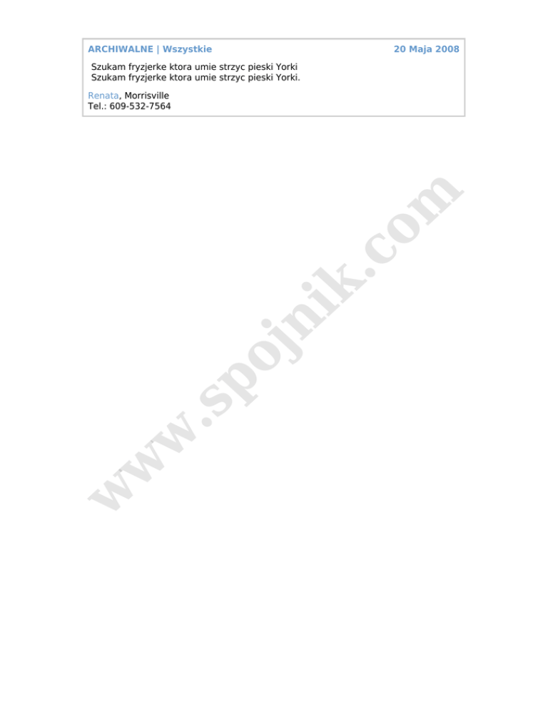 ARCHIWALNE | Wszystkie 20 Maja 2008 Szukam fryzjerke ktora umie strzyc pieski Yorki Szukam fryzjerke ktora umie strzyc pieski Yorki. w w w .s po jn ik .c o m Renata, Morrisville Tel.: 609-532-7564