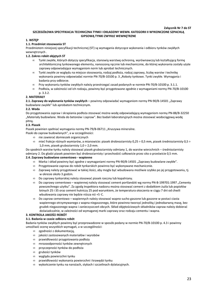 Załącznik Nr 7 do ST SZCZEGÓŁOWA SPECYFIKACJA TECHNICZNA TYNKI I OKŁADZINY WEWN. KATEGORII II WYKONCZONE SZPACHLĄ GIPSOWĄ TYNKI ZWYKŁE WEWNĘTRZNE 1. WSTĘP 1.1. Przedmiot stosowania ST Przedmiotem niniejszej specyfikacji technicznej (ST) są wymagania dotyczące wykonania i odbioru tynków zwykłych wewnętrznych . 1.2. Zakres robót objętych ST • Tynki zwykłe, których dotyczy specyfikacja, stanowią warstwę ochronną, wyrównawczą lub kształtującą formę architektoniczną tynkowanego elementu, nanoszoną ręcznie lub mechanicznie, do której wykonania zostały użyte zaprawy odpowiadające wymaganiom norm lub aprobat technicznych. • Tynki zwykłe ze względu na miejsce stosowania, rodzaj podłoża, rodzaj zaprawy, liczbę warstw i technikę wykonania powinny odpowiadać normie PN-70/B-10100 p. 3 „Roboty tynkowe. Tynki zwykłe. Wymagania i badania przy odbiorze. • Przy wykonaniu tynków zwykłych należy przestrzegać zasad podanych w normie PN-70/B-10100 p. 3.1.1. • Podłoża, w zależności od ich rodzaju, powinny być przygotowane zgodnie z wymaganiami normy PN-70/B-10100 p. 3.3.2. 2. MATERIAŁY 2.1. Zaprawy do wykonania tynków zwykłych – powinny odpowiadać wymaganiom normy PN-90/B-14501 „Zaprawy budowlane zwykłe” lub aprobatom technicznym. 2.2. Woda Do przygotowania zapraw i skrapiania podłoża stosować można wodę odpowiadającą wymaganiom normy PN-88/B-32250 „Materiały budowlane. Woda do betonów i zapraw”. Bez badań laboratoryjnych można stosować wodociągową wodę pitną. 2.3. Piasek Piasek powinien spełniać wymagania normy PN-79/B-06711 „Kruszywa mineralne. Piaski do zapraw budowlanych”, a w szczególności: • nie zawierać domieszek organicznych • mieć frakcje różnych wymiarów, a mianowicie: piasek drobnoziarnisty 0,25 ÷ 0,5 mm, piasek średnioziarnisty 0,5 ÷ 1,0 mm, piasek gruboziarnisty 1,0 ÷ 2,0 mm. Do spodnich warstw tynku należy stosować piasek gruboziarnisty odmiany 1, do warstw wierzchnich – średnioziarnisty odmiany 2. Do gładzi piasek powinien być drobnoziarnisty i przechodzić całkowicie przez sito o prześwicie 0,5 mm. 2.4. Zaprawy budowlane cementowo - wapienne • Marka i skład powinny być zgodne z wymaganiami normy PN-90/B-14501 „Zaprawy budowlane zwykłe”. • Przygotowanie zapraw do robót tynkarskich powinno być wykonywane mechanicznie. • Zaprawę należy przygotować w takiej ilości, aby mogła być wbudowana możliwie szybko po jej przygotowaniu, tj. w okresie około 3 godzin. • Do zaprawy tynkarskiej należy stosować piasek rzeczny lub kopalniany. • Do zaprawy cementowo – wapiennej należy stosować cement portlandzki wg normy PN-B-199701:1997 „Cementy powszechnego użytku”. Za zgodą Inspektora nadzoru można stosować cement z dodatkiem żużla lub popiołów lotnych 25 i 35 oraz cement hutniczy 25 pod warunkiem, że temperatura otoczenia w ciągu 7 dni od chwili wbudowania zaprawy nie będzie niższa niż +5 °C. • Do zapraw cementowo – wapiennych należy stosować wapno sucho gaszone lub gaszone w postaci ciasta wapiennego otrzymywanego z wapna niegaszonego, które powinno tworzyć jednolitą i jednobarwną masę, bez grudek niegaszonego wapna i zanieczyszczeń obcych. Skład objętościowych składników zapraw należy dobierać doświadczalnie, w zależności od wymaganej marki zaprawy oraz rodzaju cementu i wapna. 3. KONTROLA JAKOŚCI ROBÓT 3.1. Badania w czasie odbioru robót Badania tynków zwykłych powinny być przeprowadzone w sposób podany w normie PN-70/B-10100 p. 4.3 i powinny umożliwić ocenę wszystkich wymagań, a w szczególności: • zgodności z dokumentacją, • jakości zastosowanych materiałów i wyrobów • prawidłowości przygotowania podłoży • mrozoodporności tynków zewnętrznych • przyczepności tynków do podłoża • grubości tynków • wyglądu powierzchni tynku • prawidłowości wykonania powierzchni i krawędzi tynku • wykończenie tynku na narożach, stykach i szczelinach dylatacyjnych. 23 4. ODBIÓR ROBÓT 4.1. Odbiór podłoża Odbiór podłoża należy przeprowadzić bezpośrednio przed przystąpieniem do robót tynkowych. Jeżeli odbiór podłoża odbywa się po dłuższym czasie od jego wykonania, należy podłoże oczyścić i umyć wodą. 4.2. Zgodność z dokumentacją , ST i wymaganiami Inspektora nadzoru Roboty uznaje się za zgodne z dokumentacją , ST i wymaganiami Inspektora nadzoru, jeżeli wszystkie pomiary i badania omówione w p. 3 dały pozytywne wyniki. W przypadku negatywnych wyników należy: • tynk poprawić i przedstawić do ponownego odbioru • jeżeli odchylenia od wymagań nie zagrażają bezpieczeństwu użytkowania i trwałości tynku, zaliczyć tynk do niższej kategorii • w przypadku, gdy nie są możliwe podane wyżej rozwiązania, usunąć tynk i ponownie wykonać roboty tynkowe. 4.3. Odbiór tynków • Ukształtowanie powierzchni, krawędzie, przecięcia powierzchni oraz kąty dwuścienne powinny być zgodne z dokumentacją projektową. • Dopuszczalne odchylenia powierzchni tynku od płaszczyzny i odchylenie krawędzi od linii prostej nie mogą być większe niż 3 mm i w liczbie nie większej niż 3 na całej długości kontrolnej dwumetrowej łaty. • Odchylenia powierzchni i krawędzi od kierunku: - pionowego – nie mogą być większe niż 2 mm na 1 mb i ogółem nie więcej niż 4 mm w pomieszczeniu, - poziomego – nie mogą być większe niż 3 mm na 1 mb i ogółem nie więcej niż 6 mm na całej powierzchni między przegrodami pionowymi (ścianami, belkami itp.) • Niedopuszczalne są następujące wady: - wykwity w postaci nalotów roztworów soli wykrystalizowanych na powierzchni tynków przenikających z podłoża, pilśni itp. - trwałe ślady zacieków na powierzchni, odstawanie, odparzenia i pęcherze wskutek niedostatecznej przyczepności tynku do podłoża • Odbiór gotowych tynków powinien być potwierdzony protokołem, który powinien zawie