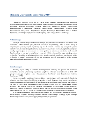 Ranking „Partnerski Samorząd 2010” „Partnerski Samorząd 2010” to już trzecia edycja rankingu podsumowującego natężenie współpracy między administracją samorządową i organizacjami pozarządowymi. Tworzony jest on na podstawie wyników corocznego badania „Monitoring współpracy między organizacjami pozarządowymi i jednostkami samorządu terytorialnego”, prowadzonego wspólnie przez Stowarzyszenie Klon/Jawor i Departament Pożytku Publicznego Ministerstwa Pracy i Polityki Społecznej. W rankingu uwzględniono wszystkie gminy, które wzięły udział w Monitoringu. Cel rankingu. Głównym celem rankingu "Partnerski samorząd" jest podsumowanie natężenia współpracy oraz wskazanie i uhonorowanie tych jednostek samorządu terytorialnego, które w sferze relacji z organizacjami pozarządowymi wyróżniają się na tle innych i wydają się szczególnie godne naśladowania. Jednocześnie podkreślamy, że przyznawane gwiazdki nie mówią o jakości współpracy miedzy organizacjami a samorządem w danej gminie, a jedynie jej natężeniu, skali. Jakość bowiem zależy od szeregu kwestii, które trudno jest obiektywnie ocenić w tego rodzaju prostym wskaźniku. Przesyłając certyfikat pamiętamy też o tym, że natężenie współpracy w gminie nie zależy wyłącznie od działań samorządu, ale też od aktywności samych organizacji, a także szeregu uwarunkowań społeczno-ekonomicznych. Źródła danych. Końcowy wynik każdej ze wspólnot samorządowych obliczany jest głównie na podstawie materiału z badania „Monitoring współpracy urzędów z sektorem pozarządowym za 2010 rok” przeprowadzonego wspólnie przez Stowarzyszenie Klon/Jawor oraz Departament Pożytku Publicznego MPiPS. Jednak w przypadku współpracy finansowej dane z Monitoringu w wielu przypadkach okazują się niepełne lub nieporównywalne. Dlatego przyznając gwiazdki dotyczące tego wymiaru współpracy sięgamy do sprawozdań budżetowych JST publikowanych przez Ministerstwo Finansów i ograniczamy się tylko do tych trybów finansowania działań organizacji, które mogą być porównywane między gminami: do danych dotyczących zlecania organizacjom pozarządowym (stowarzyszeniom, fundacjom i innym podmiotom nienależącym do sektora finansów publicznych) realizacji zadań samorządów (par. 258, 263, 281-3 i 623 klasyfikacji budżetowej w sprawozdaniach budżetowych). W przypadku pozostałych wymiarów współpracy brak jest wiarygodnych zewnętrznych źródeł, które mogłyby uzupełnić deklaracje urzędów zebrane w Monitoringu. Analizując wyniki rankingu konieczne jest więc wzięcie pod uwagę wynikających z tego ograniczeń. Wymiary oceny. Aby całościowo opisać zakres współpracy z organizacjami, w Rankingu wyodrębniono cztery wymiary współpracy, z których każdy był punktowany oddzielnie: 1. Funkcjonowanie programu współpracy z organizacjami pozarządowymi. Program ten – zgodnie z zapisami ustawy o działalności pożytku publicznego i o wolontariacie – powinien być uchwalany przez wszystkie gminy i wyznaczać ramy współpracy z organizacjami na cały nadchodzący rok. Z punktu widzenia jakości współpracy ważny jest nie tylko sam fakt jego uchwalenia, ale i zaangażowanie organizacji już na etapie konstruowania takiego dokumentu. Dlatego w rankingu uwzględniamy 5 kryteriów, na podstawie których gminy mogły uzyskać punkty: sam fakt uchwalenia przez urząd programu na rok 2010; termin jego uchwalenia; udział organizacji w przygotowywaniu programu; liczbę form konsultacji oraz fakt ich udokumentowania. 2. Współpraca finansowa. Zdecydowana większość gmin w Polsce zleca organizacjom realizację zadań publicznych przekazując im tym samym środki na ich realizację. Ten wymiar rankingu ma za zadanie oceniać skalę tych przepływów finansowych w oparciu o publikowane przez Ministerstwo Finansów sprawozdania finansowe jednostek samorządu terytorialnego. Na liczbę uzyskanych punktów wpływa udział przekazywanych organizacjom środków w całości wydatków bieżących gminy, podział środków pomiędzy poszczególne typy organizacji oraz poziom realizacji zaplanowanego budżetu. 3. Wspierające formy współpracy pozafinansowej. Wymiar ten pokazuje, w jakim stopniu gmina wspomaga organizacje w ich codziennym funkcjonowaniu – poprzez pomoc administracyjną, wsparcie organizacyjne i merytoryczne, pomoc podczas tworzenia nowych organizacji itp. Zakres takiej „opieki” nad organizacjami decyduje o liczbie punktów przyznawanych w tym wymiarze. 4. Partnerskie formy współpracy pozafinansowej. Ten wymiar pozawala ocenić, w jakim stopniu gmina współpracuje z organizacjami na stopie partnerskiej – a więc nie tylko zlecając im zadania czy wspierając w codziennym funkcjonowaniu, ale także włączając je w podejmowanie kluczowych decyzji lokalnych. Punktowano praktykowanie takich form współpracy jak konsultowanie z organizacjami projektów uchwał, tworzenie wspólnych zespołów, czy zapraszanie przedstawicieli trzeciego sektora na posiedzeniach organów urzędu. Sposób obliczania wyniku. Wszystkie opisane kryteria składają się na złożoną ocenę natężenia współpracy między organizacjami i samorządem lokalnym – tzw. „indeks” . Każdy urząd mógł zdobyć od 0 do 5 punktów w każdym z wymienionych wyżej czterech głównych wymiarów współpracy. Średnia liczba punktów zdobytych w poszczególnych wymiarach jest zarazem końcowym wynikiem mówiącym o skali współpracy jednostek samorządu terytorialnego i organizacji pozarządowych na danym terenie. To ona decyduje o miejscu poszczególnych urzędów w rankingu współpracy. Przedstawiona jest w postaci pięciu gwiazdek - odpowiednio do uzyskanego wyniku - pełnych, częściowo wypełnionych, bądź pustych (im więcej gwiazdek wypełnionych, tym lepszy wynik i wyższe miejsce zajmuje dany samorząd w rankingu).