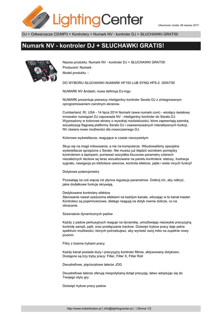Utworzono: środa, 08 marzec 2017 DJ > Odtwarzacze CD/MP3 > Kontrolery > Numark NV - kontroler DJ + SŁUCHAWKI GRATIS! Numark NV - kontroler DJ + SŁUCHAWKI GRATIS! Nazwa produktu: Numark NV - kontroler DJ + SŁUCHAWKI GRATIS! Producent: Numark Model produktu: DO WYBORU SŁUCHAWKI NUMARK HF150 LUB SYNQ HPS-2 GRATIS! NUMARK NV – nowa definicja DJ-ingu NUMARK prezentuje pierwszy inteligentny kontroler Serato DJ z zintegrowanym oprogramowaniem zwrotnym ekranow. Cumberland, RI, USA - 14 lipca 2014 Numark (www.numark.com) - wiodący światowy innowator rozwiązań DJ zapowiada NV - inteligentny kontroler do Serato DJ. Wyposażony w kolorowe ekrany o wysokiej rozdzielczości, ktore zapewniają szeroką wizualizację flagowej platformy Serato DJ i zaawansowanych interaktywnych funkcji, NV otwiera nowe możliwości dla nowoczesnego DJ. Kolorowe wyświetlacze, reagujące w czasie rzeczywistym Skup się na magii miksowania, a nie na komputerze. Wbudowaliśmy specjalne wyświetlacze sprzężone z Serato. Nie musisz już błądzić wzrokiem pomiędzy kontrolerem a laptopem, ponieważ wszystkie kluczowe parametry czterech niezależnych deckow są teraz wizualizowane na panelu kontrolera: statusy, ilustracja sygnału, nawigacja po bibliotece utworow, kontrola efektow, pętle i wiele innych funkcji! Dotykowe potencjometry Pozwalają na coś więcej niż płynna regulacja parametrow. Dotknij ich, aby odkryć, jakie dodatkowe funkcje skrywają. Dedykowane kontrolery efektow Sterowanie nawet sześcioma efektami na każdym kanale, wliczając w to kanał master. Kontrolery są pojemnościowe, dlatego reagują na dotyk rownie dobrze, co na obracanie. Szesnaście dynamicznych padow Każdy z padow perkusyjnych reaguje na dynamikę, umożliwiając niezwykle precyzyjną kontrolę sampli, pętli, oraz przełączanie trackow. Dziesięć trybow pracy daje pełne spektrum możliwości, ktorych potrzebujesz, aby wynieść swoj miks na zupełnie nowy poziom. Filtry z trzema trybami pracy Każdy kanał posiada duży i precyzyjny kontroler filtrow, aktywowany dotykowo. Dostępne są trzy tryby pracy: Filter, Filter X, Filter Roll Dwustrefowe, pięciocalowe talerze JOG Dwustrefowe talerze oferują niespotykaną dotąd precyzję, łatwo adoptując się do Twojego stylu gry. Dziesięć trybow pracy padow http://www.lcdistribution.pl | [email protected] | | Strona 1/2 Utworzono: środa, 08 marzec 2017 DJ > Odtwarzacze CD/MP3 > Kontrolery > Numark NV - kontroler DJ + SŁUCHAWKI GRATIS! Numark NV - kontroler DJ + SŁUCHAWKI GRATIS! Dynamiczne pady pozwalają kontrolować funkcje: Hot Cue, Hot Cue Autoloop, Auto-Loop, Loop Roll, Manual Loops, Saved Loops, Sampler, Velocity Trigger, Sampler, Slicer, Slicer Lopp Cztery decki w Serato DJ Control Wykonuj zaawansowane miksy lub trzymaj w zanadrzu opcje dla śladow, używając czterech wirtualnych deckow. Layout NV jest bardzo intuicyjny i czytelny, więc możesz skupić się na tworzeniu sztuki. Wbudowane kolorowe ekrany wyświetlają niezależnie parametry deckow w czasie rzeczywistym. Pakiet Toolroom Remix Pack Tworz swoje remiksy przy użyciu pakietu spod znaku Toolroom Records. Kupując kontroler NV otrzymujesz możliwość pobrania loopow i sampli, ktore uczynią Twoje miksy niepowtarzalnymi. Prezentacja video: swdeal3 swdealall swm2015 http://www.lcdistribution.pl | [email protected] | | Strona 2/2
