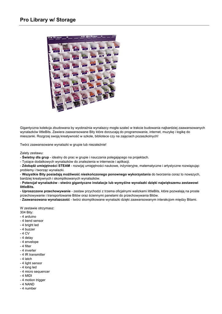 Pro Library w/ Storage Gigantyczna kolekcja zbudowana by wyobraźnia wynalazcy mogła szaleć w trakcie budowania najbardziej zaawansowanych wynalazków littleBits. Zawiera zaawansowane Bity które dorzucają do programowanie, internet, muzykę i logikę do mieszanki. Rozgrzej swoją kreatywność w szkole, bibliotece czy na zajęciach pozaszkolnych! Twórz zaawansowane wynalazki w grupie lub niezależnie! Zalety zestawu: - Świetny dla grup - idealny do prac w grupie i nauczania polegającego na projektach. - Tysiące dodatkowych wynalazków do znalezienia w internecie i aplikacji. - Zdobądź umiejętności STEAM - rozwijaj umięjętności naukowe, inżynieryjne, matematyczne i artystyczne rozwiązując problemy i tworząc wynalazki. - Wszystkie Bity posiadają możliwość nieskończonego ponownego wykorzystania do tworzenia coraz to nowszych, bardziej kreatywnych i skomplikowanych wynalazków. - Potencjał wynalazków - stwórz gigantyczne instalacje lub wymyślne wynalazki dzięki największemu zestawowi littleBits. - Uproszczone przechowywanie - zestaw przychodzi z trzema oficjalnymi walizkami littleBits, które pozwalają na proste przechowywanie i transportowanie Bitów oraz ściennymi panelami do przechowywania Bitów. - Zaawansowana wynalazczość - twórz skomplikowane wynalazki dzięki zaawansowanym interakcjom między Bitami. W zestawie otrzymasz: 304 Bity: - 4 arduino - 4 bend sensor - 4 bright led - 4 buzzer - 4 CV - 4 delay - 4 envelope - 4 filter - 4 inverter - 4 IR transmitter - 4 latch - 4 light sensor - 4 long led - 4 micro sequencer - 4 MIDI - 4 motion trigger - 4 NAND - 4 number - 4 perf - 4 pressure sensor - 4 pulse - 4 remote trigger - 4 roller switch - 4 servo - 4 slide switch - 4 split - 4 temperature sensor - 4 timeout - 4 USB I/O - 4 UV LED - 32 wire - 4 wireless transmitter (1 kanał) - 4 bargraph - 4 branch - 4 button - 4 cluudBit - 4 dc motor - 4 dimmer - 4 double OR - 4 fan - 4 fork - 4 IR LED - 4 keyboard - 4 led - 4 light wire - 4 MakeyMakey - 4 microphone - 4 mix - 4 mp3 player - 4 NOR - 4 oscillator - 16 power - 4 proto - 4 random - 4 RGB LED - 4 sequencer - 4 slide dimmer - 4 sound trigger - 4 synth speaker - 4 threshold - 4 toggle switch - 4 USB power - 4 vibration motor - 4 wireless receiver (1 kanał) - 4 XOR 228 akcesoriów: - 4 AC switch - 4 bitSnaps - 1 Getting started with littleBits - 16 mounting boards - 144 shoes - USB Power Adapter + cable - 16 baterii + kable - 4 brick adapter - 16 motorMate - 16 śrubokrętów - 3 walizki