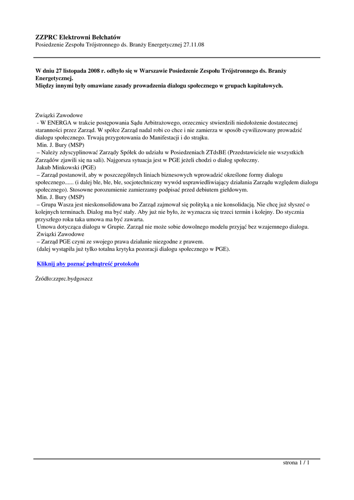 ZZPRC Elektrowni Bełchatów Posiedzenie Zespołu Trójstronnego ds. Branży Energetycznej 27.11.08 W dniu 27 listopada 2008 r. odbyło się w Warszawie Posiedzenie Zespołu Trójstronnego ds. Branży Energetycznej. Między innymi były omawiane zasady prowadzenia dialogu społecznego w grupach kapitałowych. Związki Zawodowe - W ENERGA w trakcie postępowania Sądu Arbitrażowego, orzecznicy stwierdzili niedołożenie dostatecznej staranności przez Zarząd. W spółce Zarząd nadal robi co chce i nie zamierza w sposób cywilizowany prowadzić dialogu społecznego. Trwają przygotowania do Manifestacji i do strajku. Min. J. Bury (MSP) – Należy zdyscyplinować Zarządy Spółek do udziału w Posiedzeniach ZTdsBE (Przedstawiciele nie wszystkich Zarządów zjawili się na sali). Najgorsza sytuacja jest w PGE jeżeli chodzi o dialog społeczny. Jakub Minkowski (PGE) – Zarząd postanowił, aby w poszczególnych liniach biznesowych wprowadzić określone formy dialogu społecznego...... (i dalej ble, ble, ble, socjotechniczny wywód usprawiedliwiający działania Zarządu względem dialogu społecznego). Stosowne porozumienie zamierzamy podpisać przed debiutem giełdowym. Min. J. Bury (MSP) – Grupa Wasza jest nieskonsolidowana bo Zarząd zajmował się polityką a nie konsolidacją. Nie chcę już słyszeć o kolejnych terminach. Dialog ma być stały. Aby już nie było, że wyznacza się trzeci termin i kolejny. Do stycznia przyszłego roku taka umowa ma być zawarta. Umowa dotycząca dialogu w Grupie. Zarząd nie może sobie dowolnego modelu przyjąć bez wzajemnego dialogu. Związki Zawodowe – Zarząd PGE czyni ze swojego prawa działanie niezgodne z prawem. (dalej wystąpiła już tylko totalna krytyka pozoracji dialogu społecznego w PGE). Kliknij aby poznać pełnątreść protokołu Żródło:zzprc.bydgoszcz strona 1 / 1